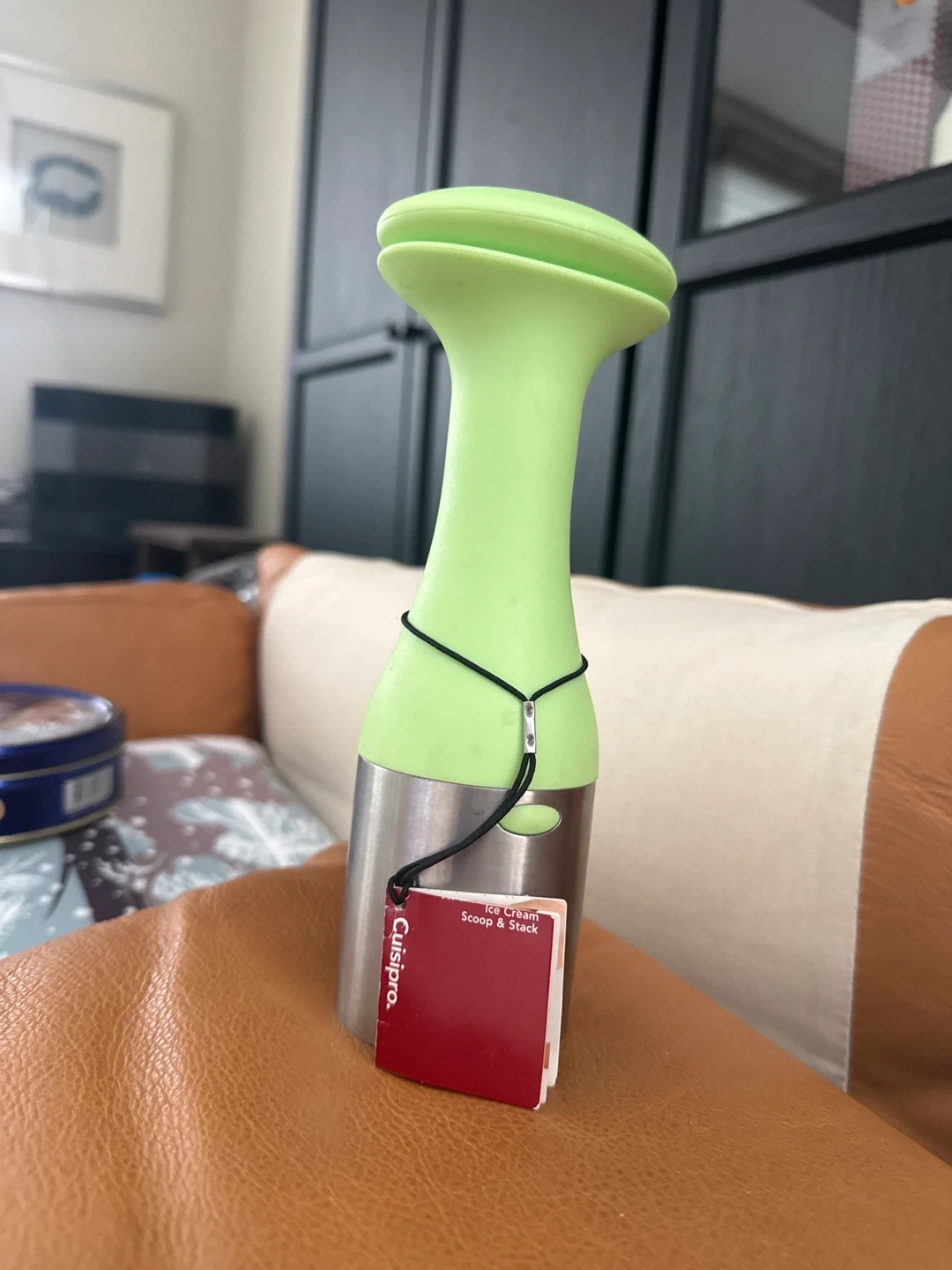 This is a Cuisipro Ice Cream Scoop & Stack. It features a green silicone handle and a stainless steel scoop. This tool helps you create perfectly shaped scoops and stack them neatly.
