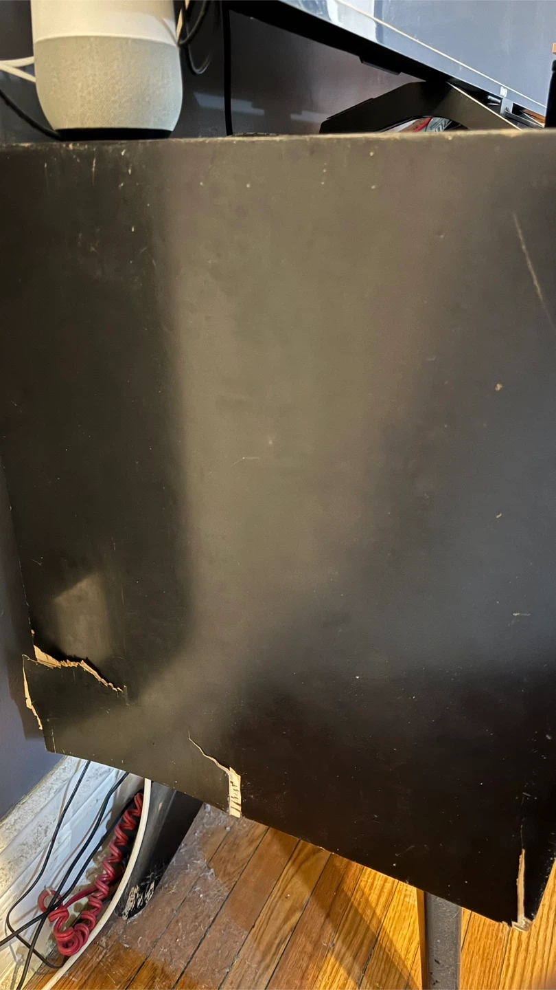 Some damage on the side, can be glued into place. The back panel has been cut open for cables and other electronic components.