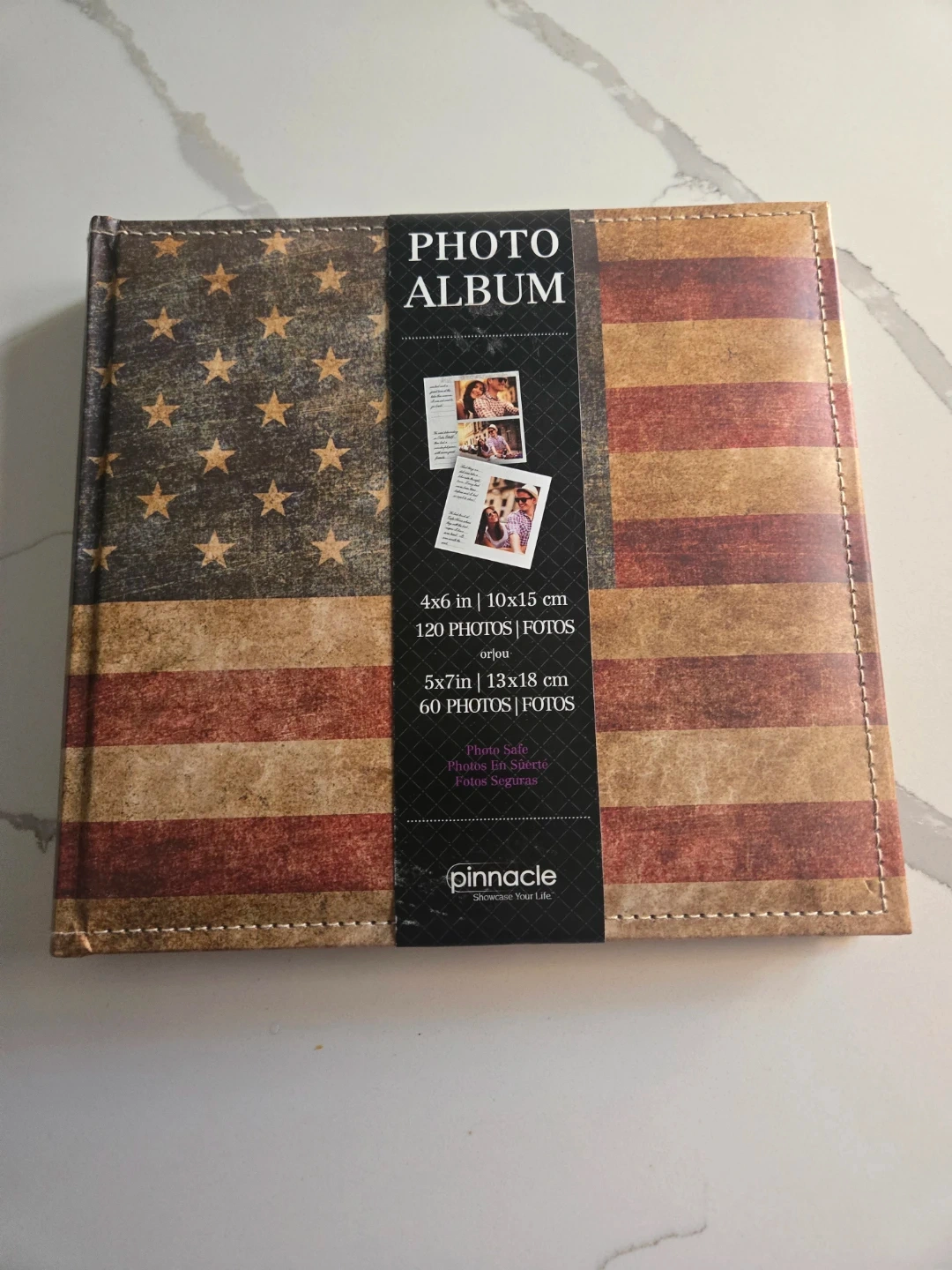This Pinnacle photo album features an American flag design. It holds 120 photos and supports 4x6 inch or 10x15 cm photos. It also fits 60 photos sized 5x7 inch or 13x18 cm. It's photo safe!
