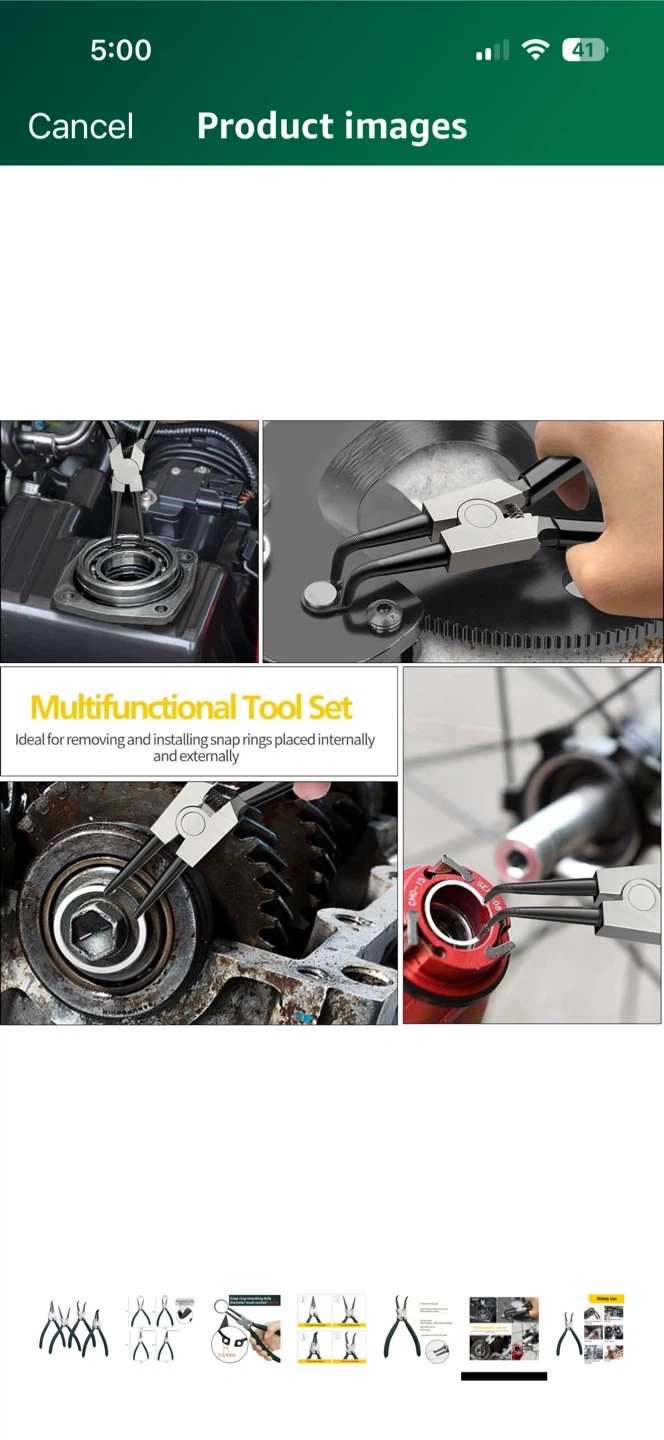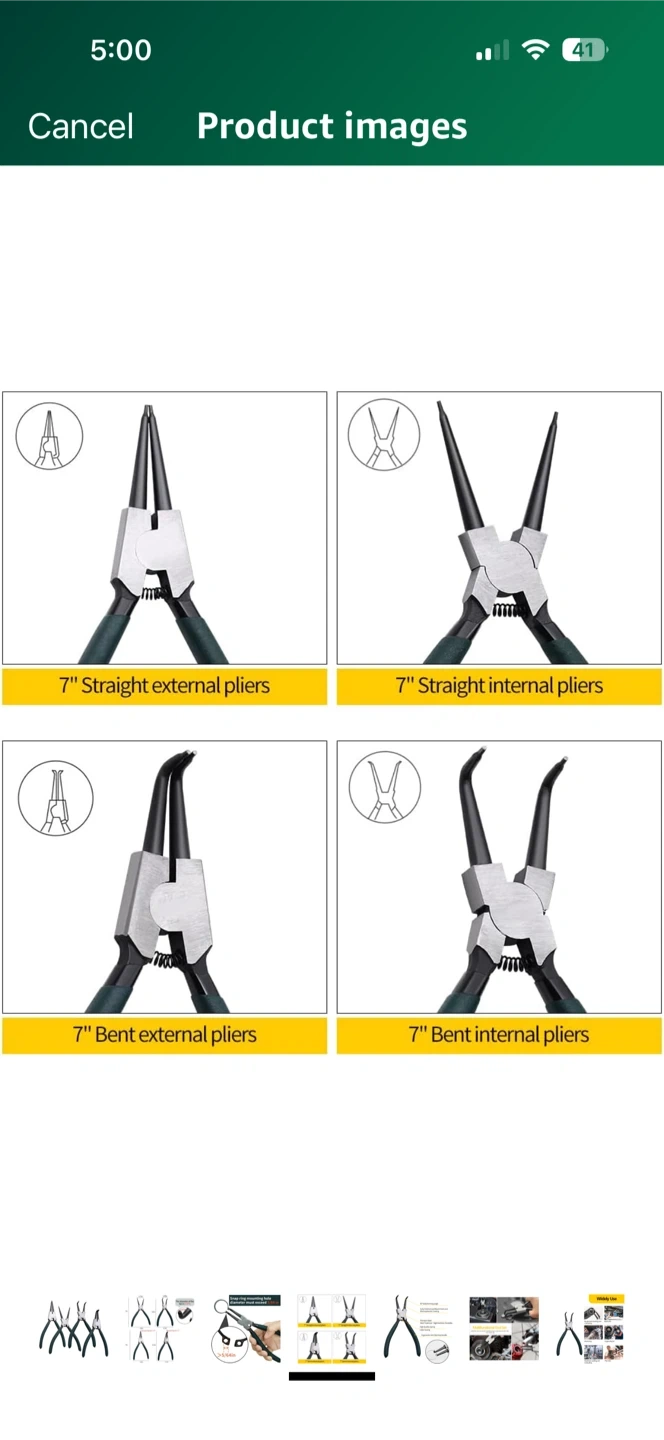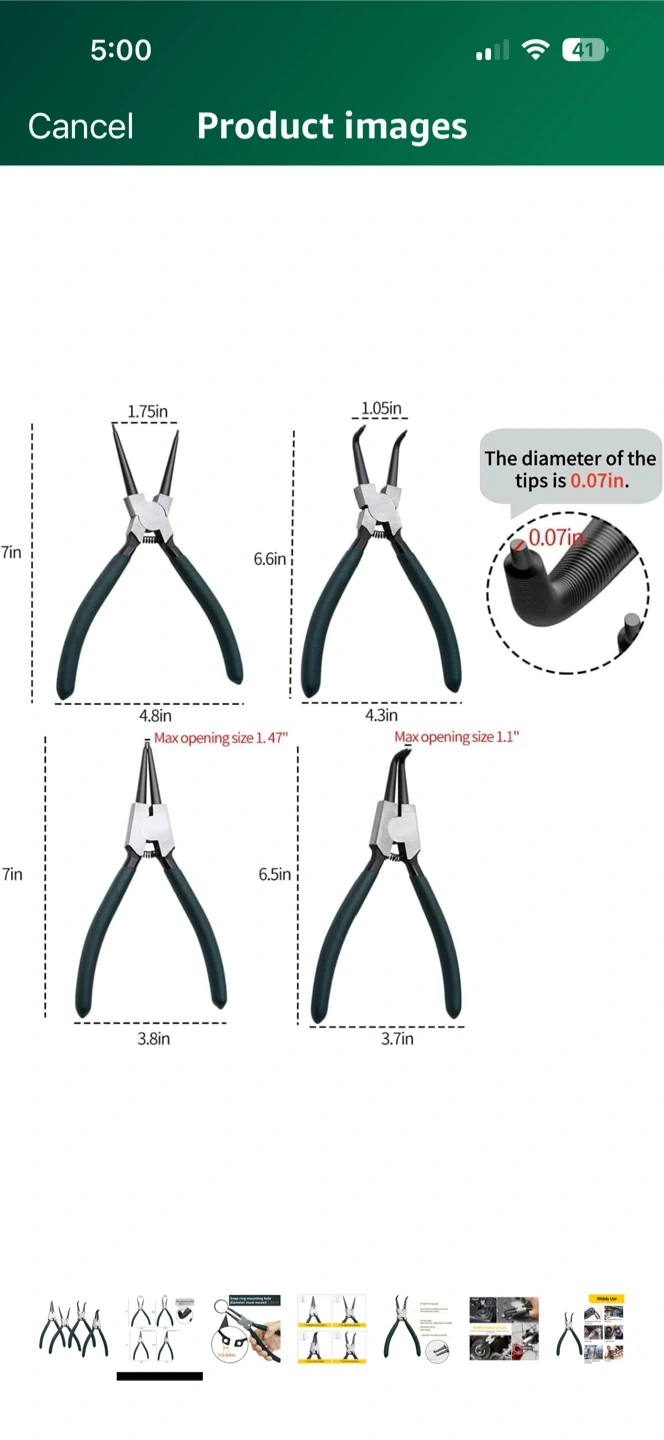 Selling a set of 7-inch snap ring pliers. This set includes straight external, straight internal, bent external, and bent internal pliers. They feature premium steel with heat treatment for high hardness and durability, plus an ergonomic anti-grip handle. The tips have a diameter of 0.07 inches and a snap ring mounting hole diameter must exceed 5/64 inches