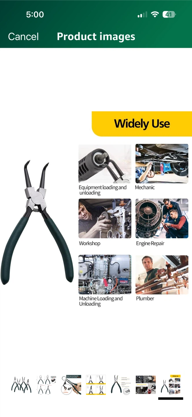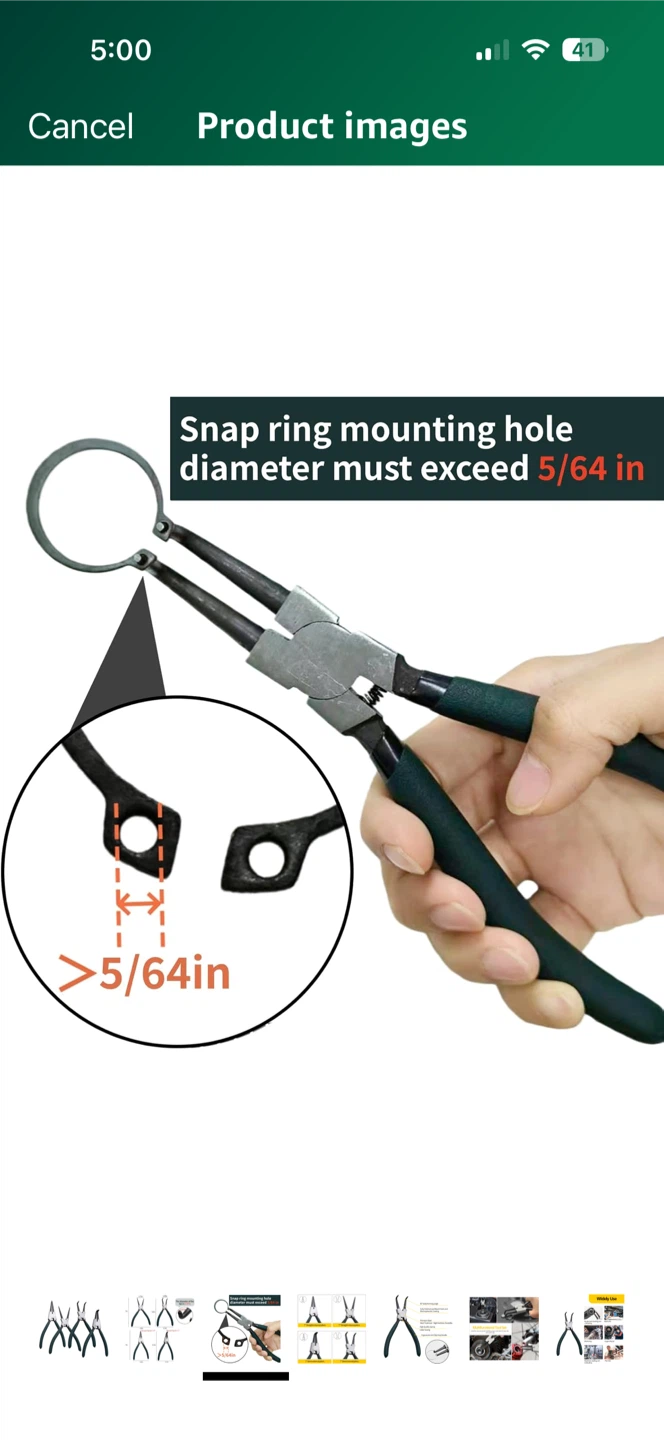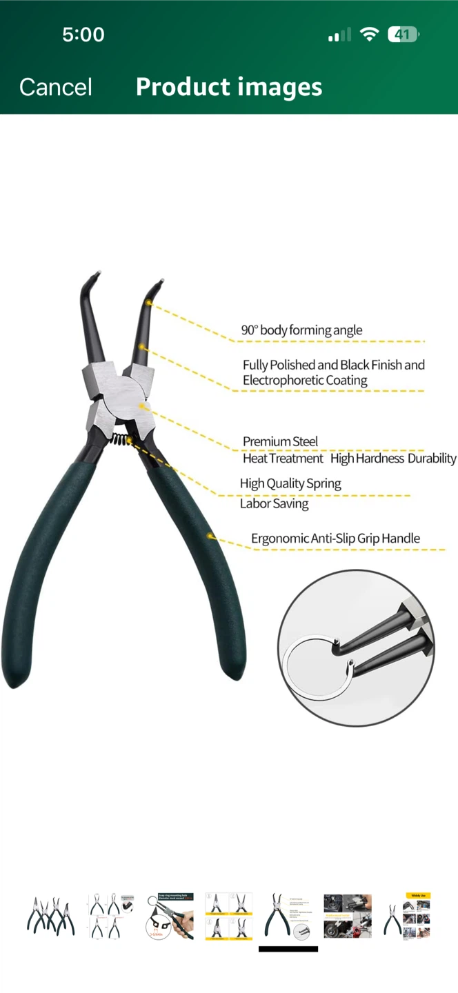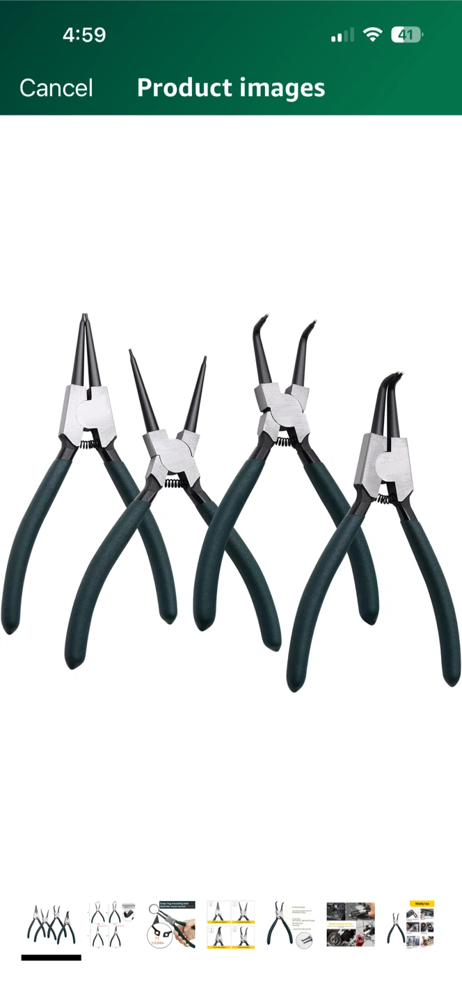 Selling a set of 7-inch snap ring pliers. This set includes straight external, straight internal, bent external, and bent internal pliers. They feature premium steel with heat treatment for high hardness and durability, plus an ergonomic anti-grip handle. The tips have a diameter of 0.07 inches and a snap ring mounting hole diameter must exceed 5/64 inches