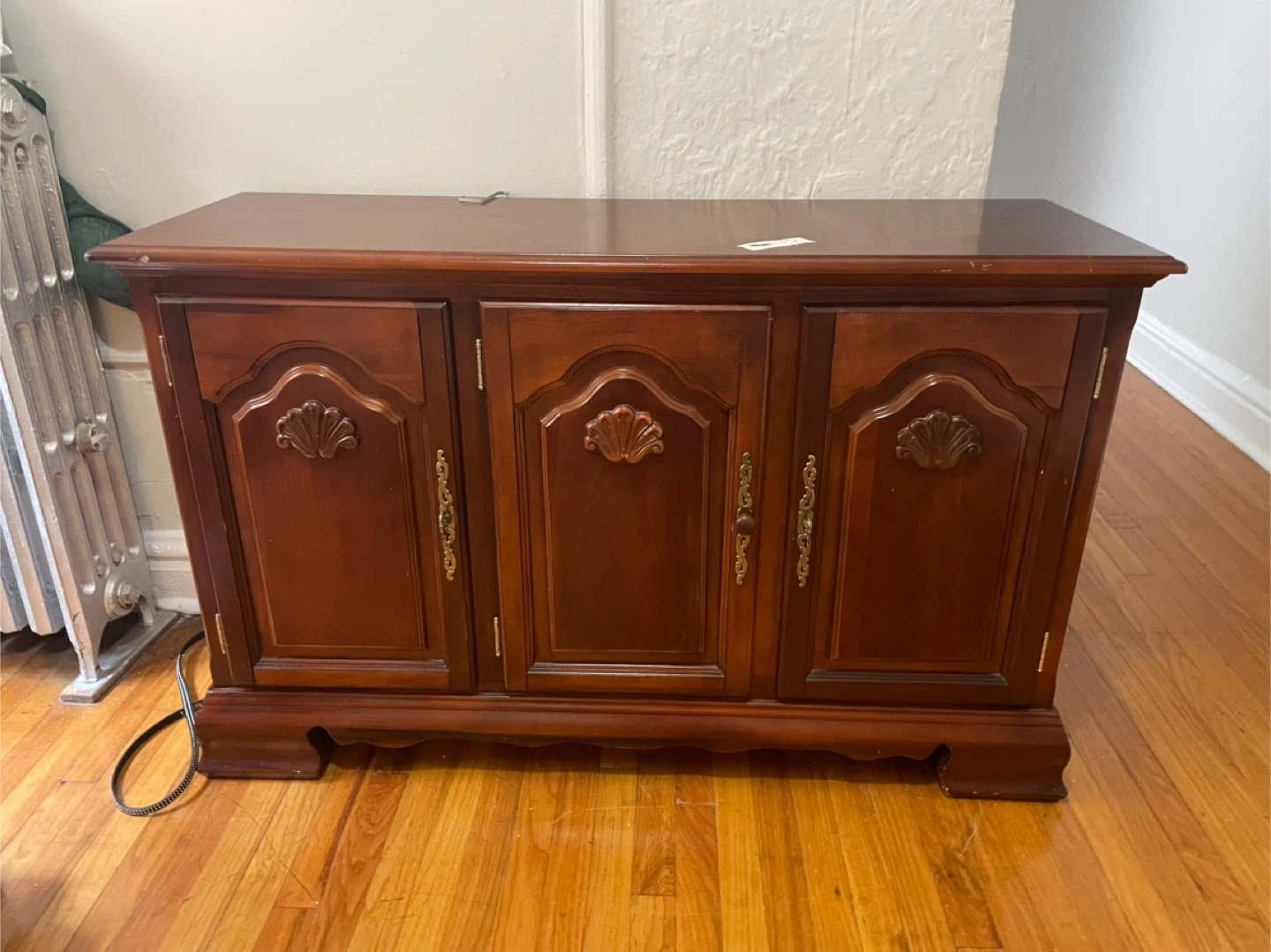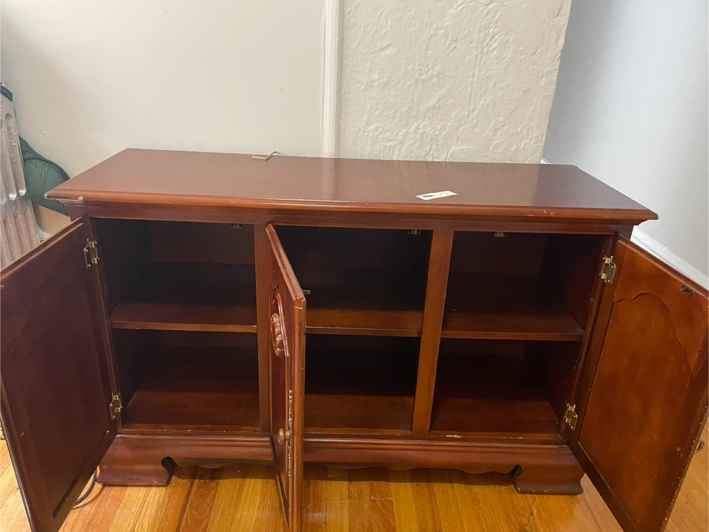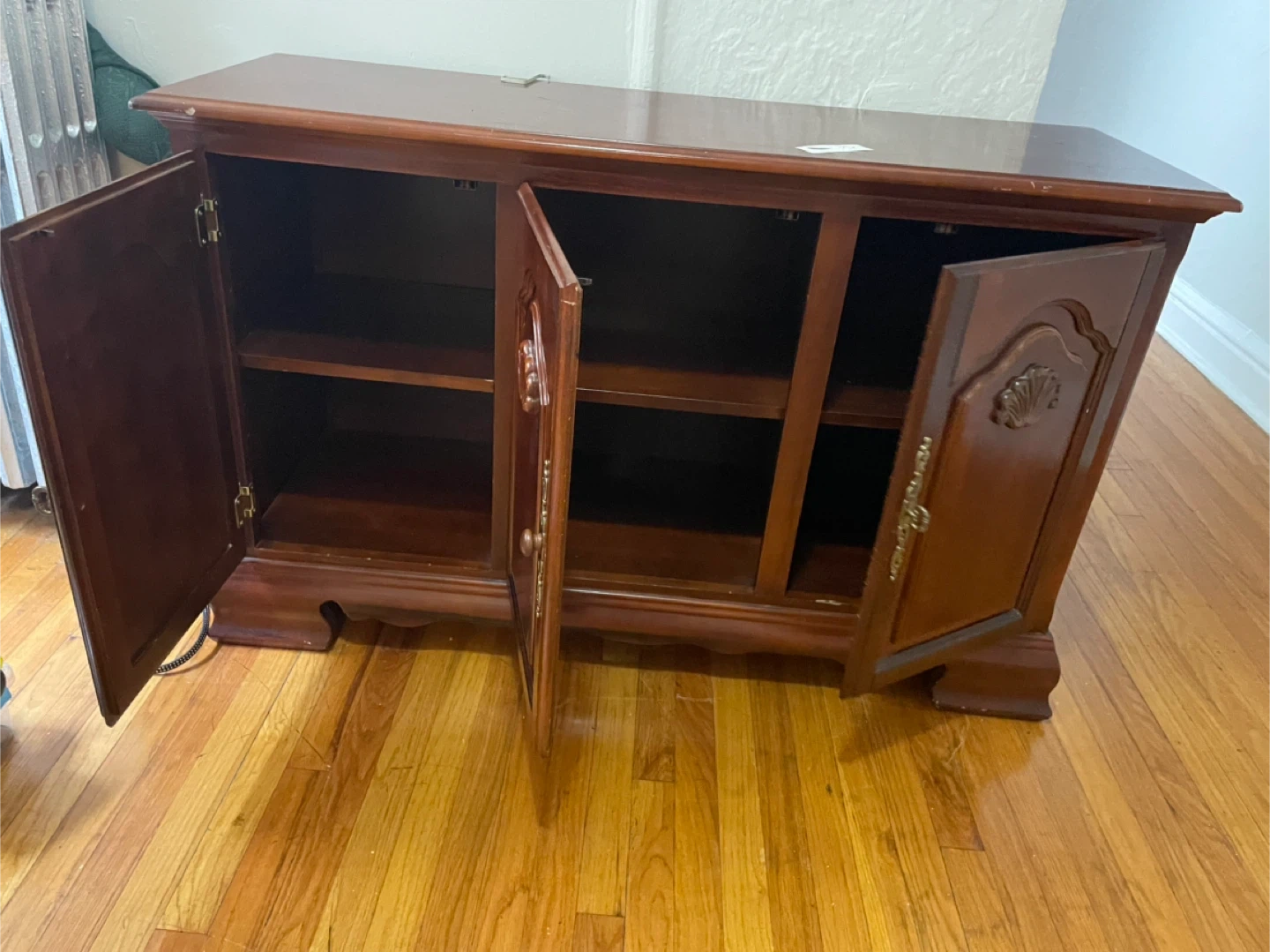 A three-door wooden sideboard cabinet with decorative shell carvings on the doors. It features three open interior shelf sections for storage. The cabinet's finish is a rich, dark wood tone. It’s also in good conditions.