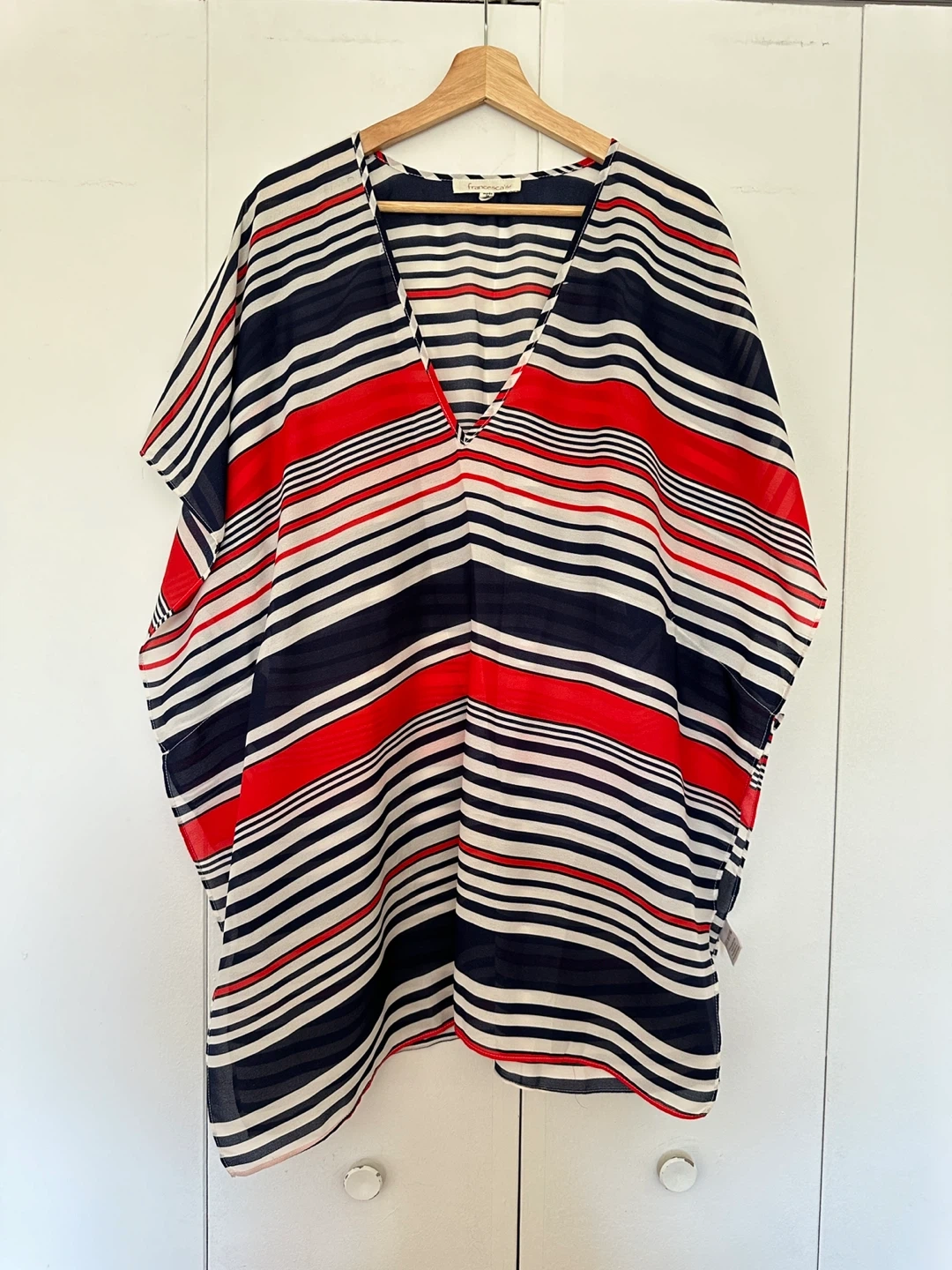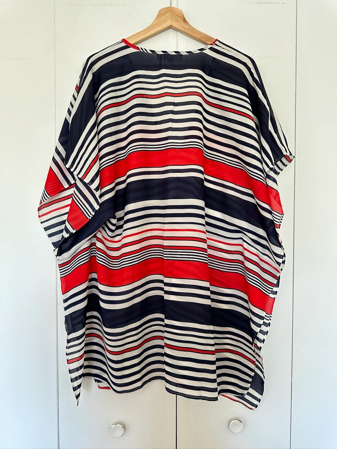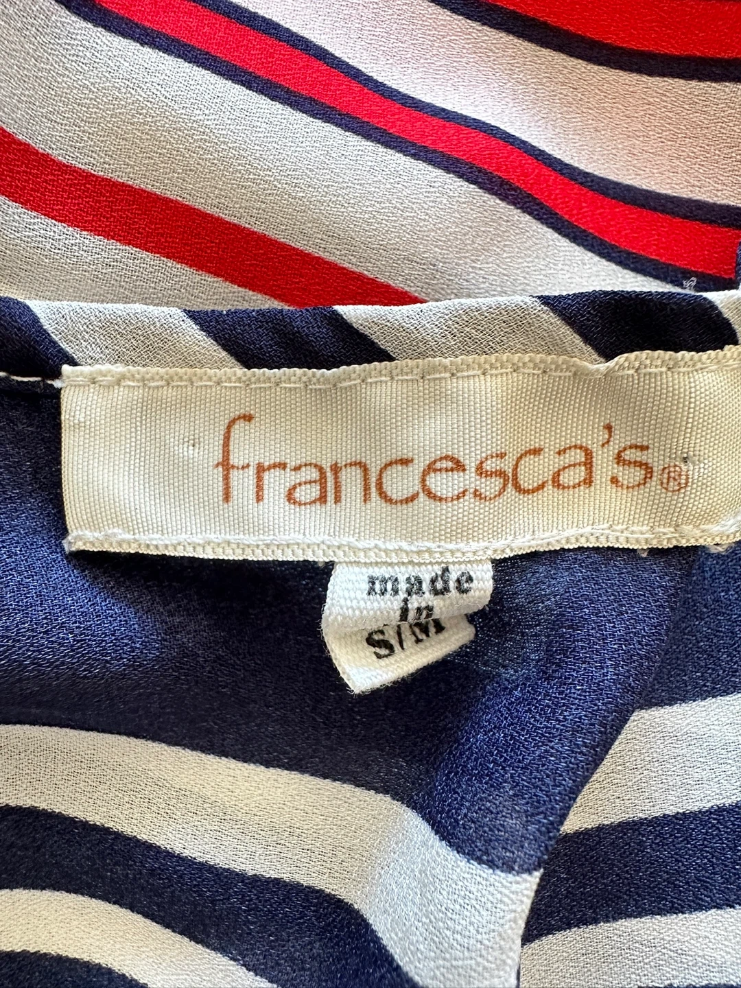 It's a size S/M and features a fun striped pattern in red, white, and navy.