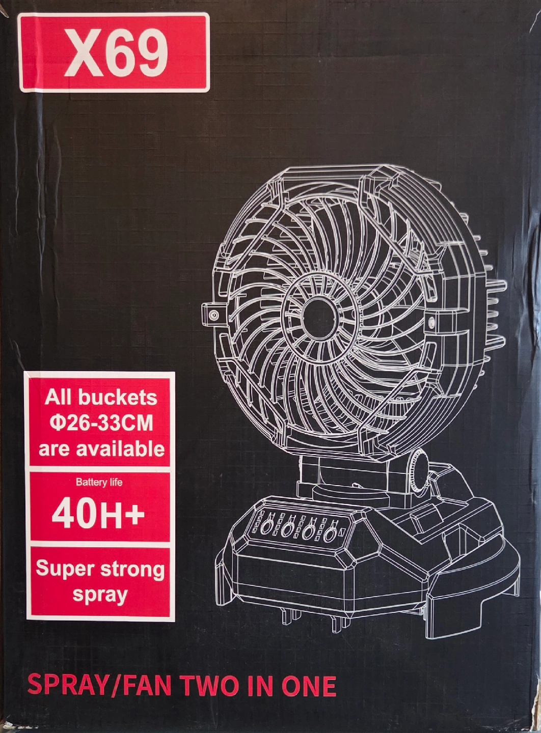 135X69 Spray/Fan Two In One! It has a super strong spray and a battery life of 40+ hours. This fan is designed to fit all buckets that are 26-33cm. It comes in its original box