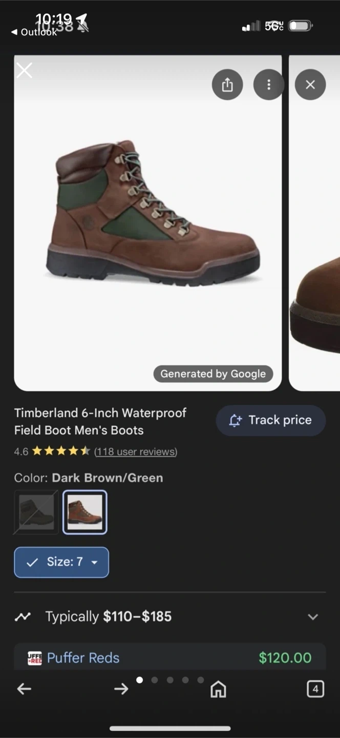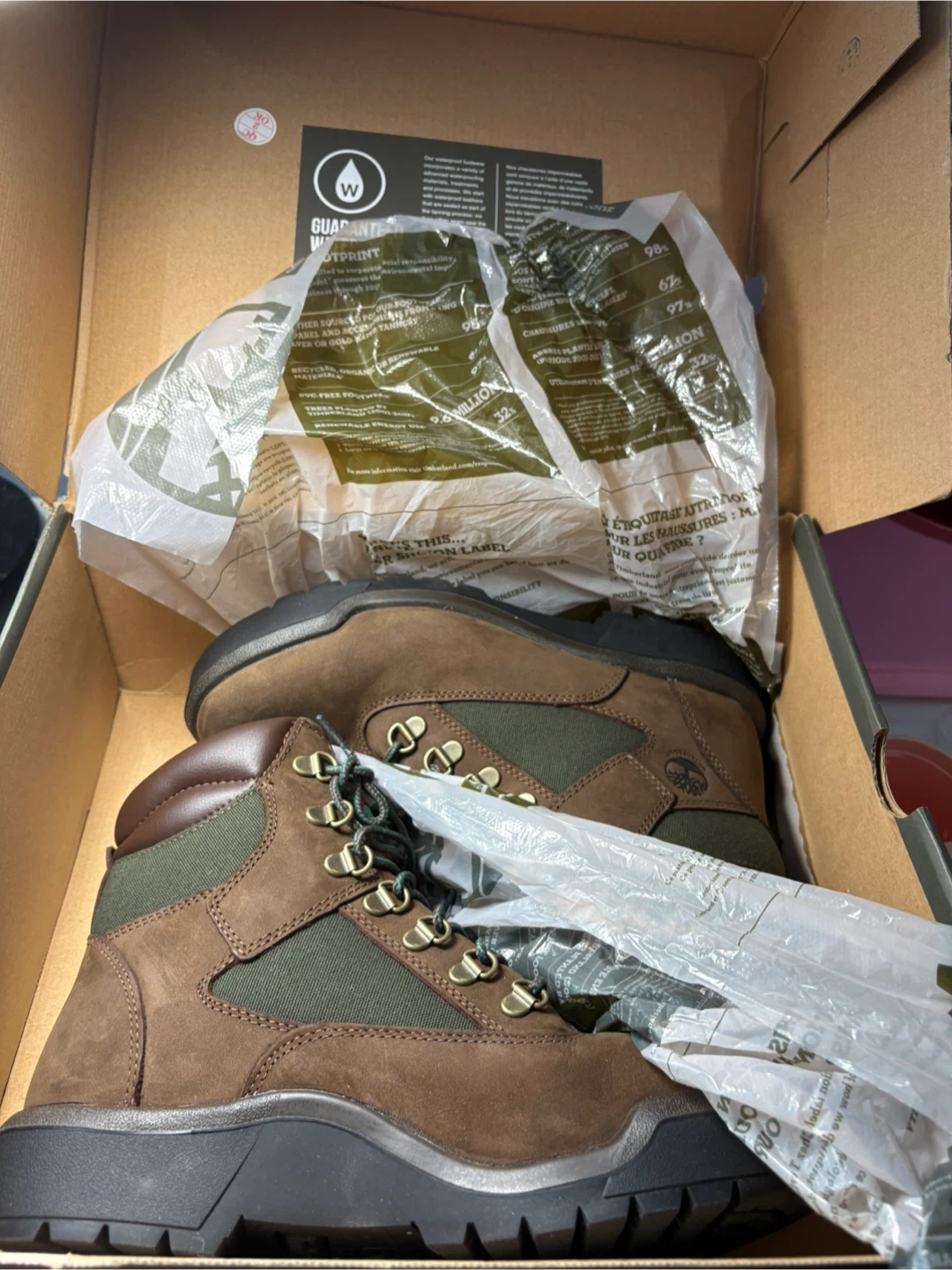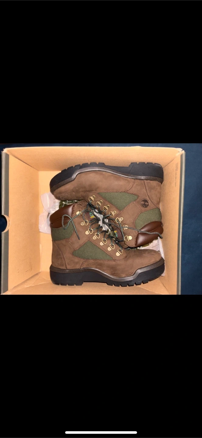 Selling a pair of Timberland Field Boots in size 7. They are a dark brown nubuck color with green accents. These are guaranteed waterproof since 1973! Comes with the original box