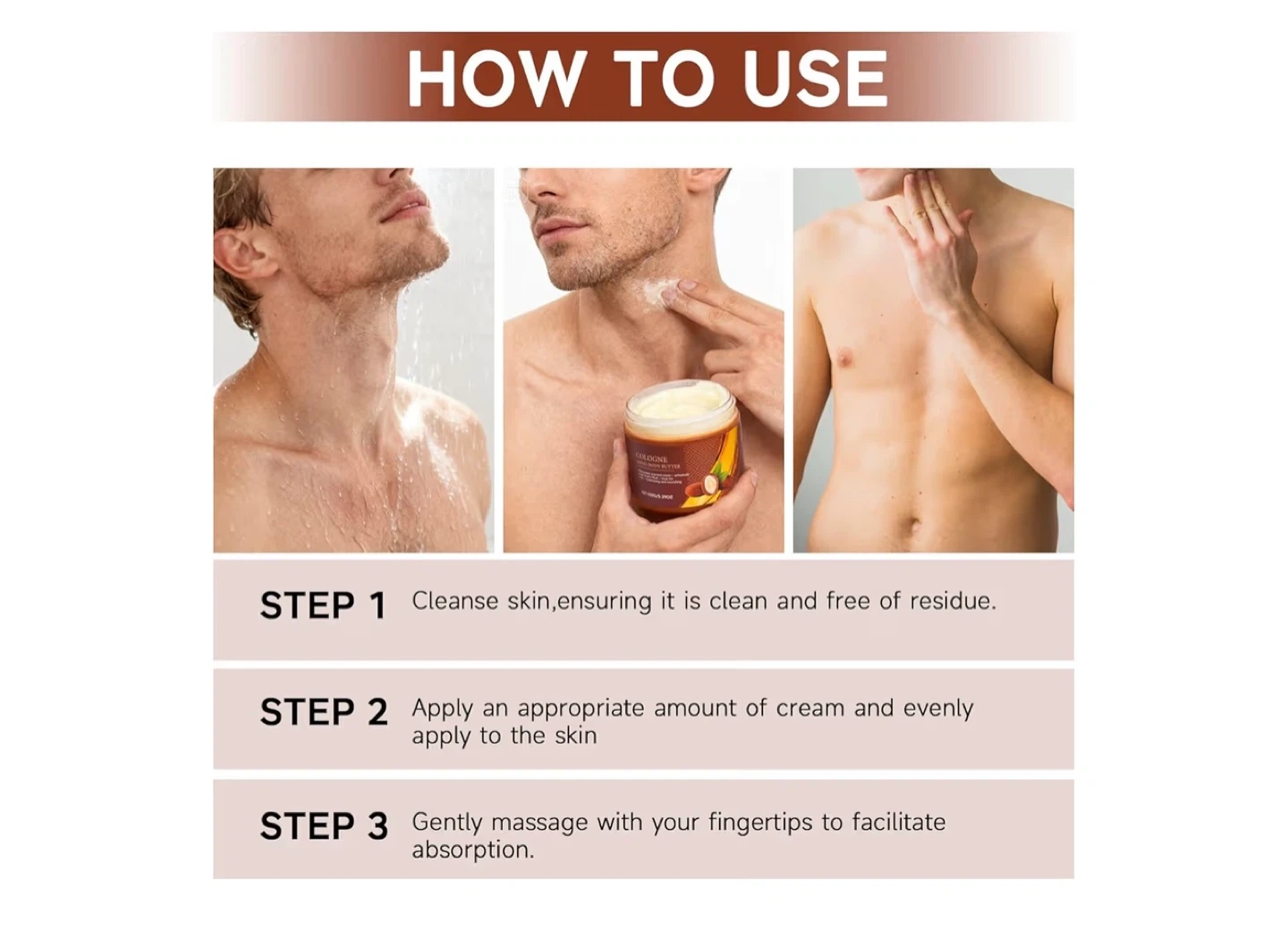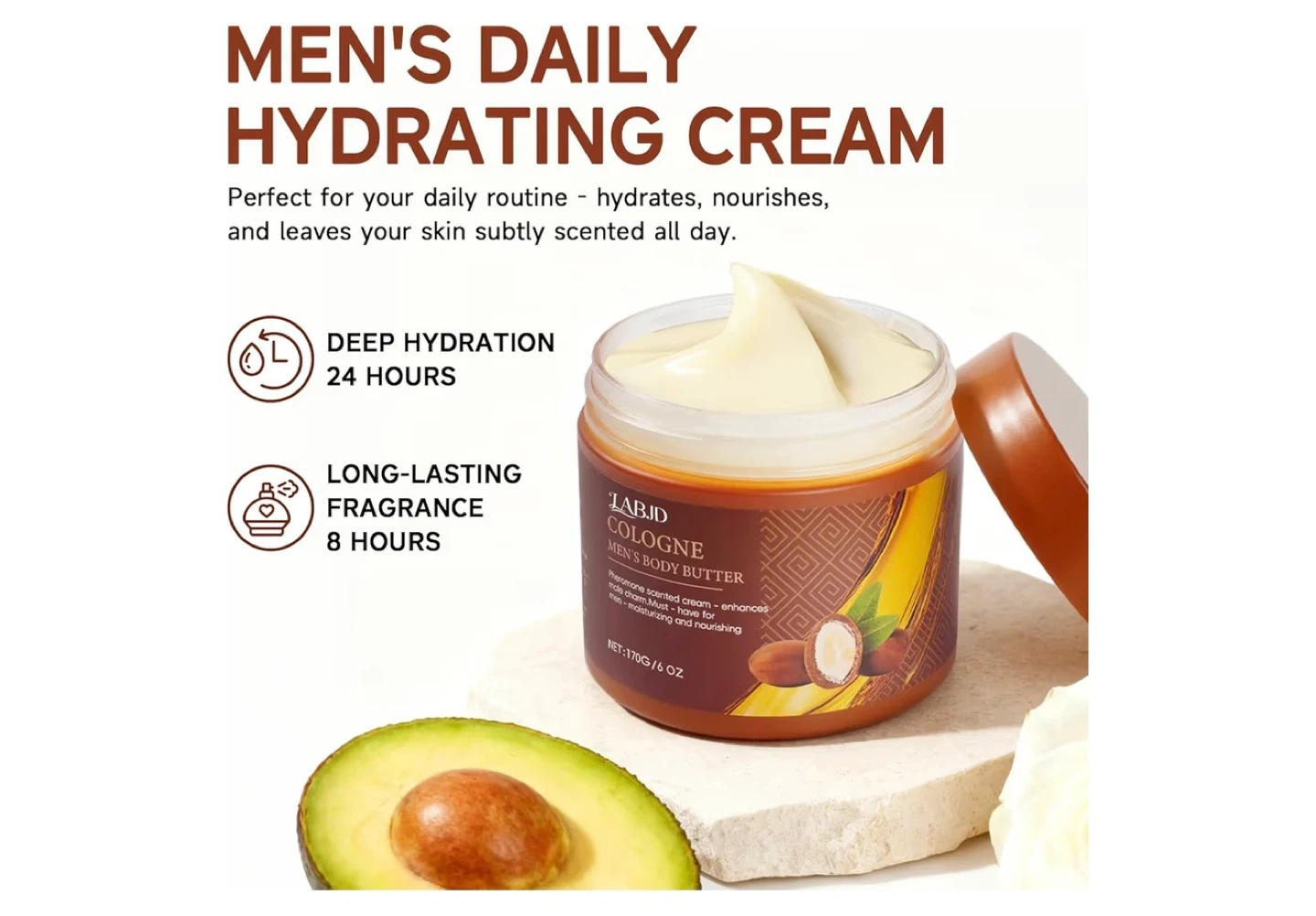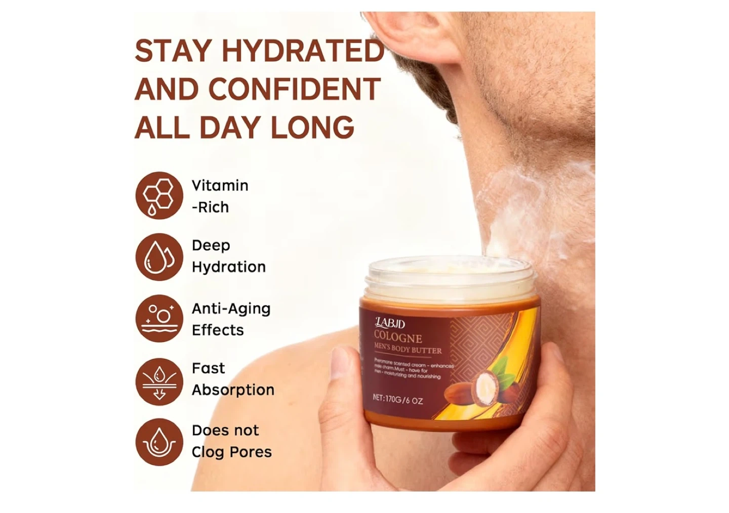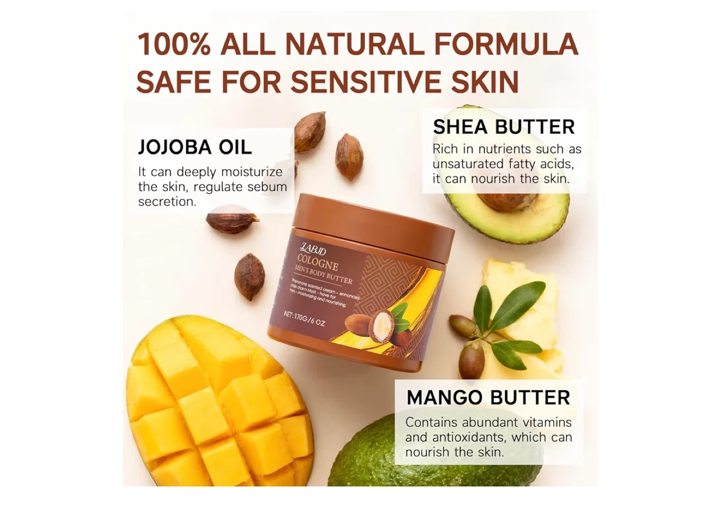This men's body butter provides deep hydration and nourishment for the skin. It's formulated with shea butter, mango butter, and jojoba oil. Fast absorption and it doesn't clog pores.