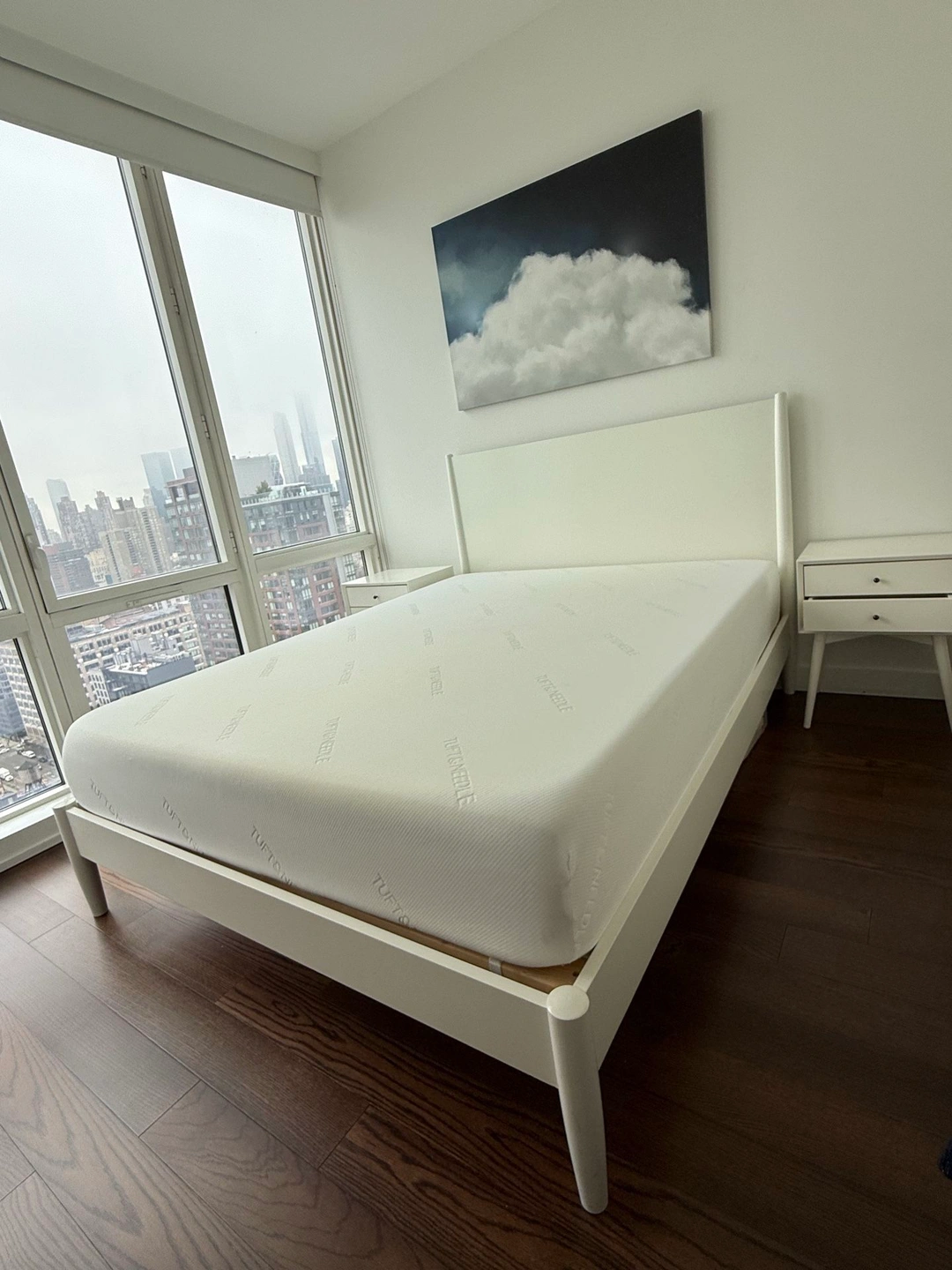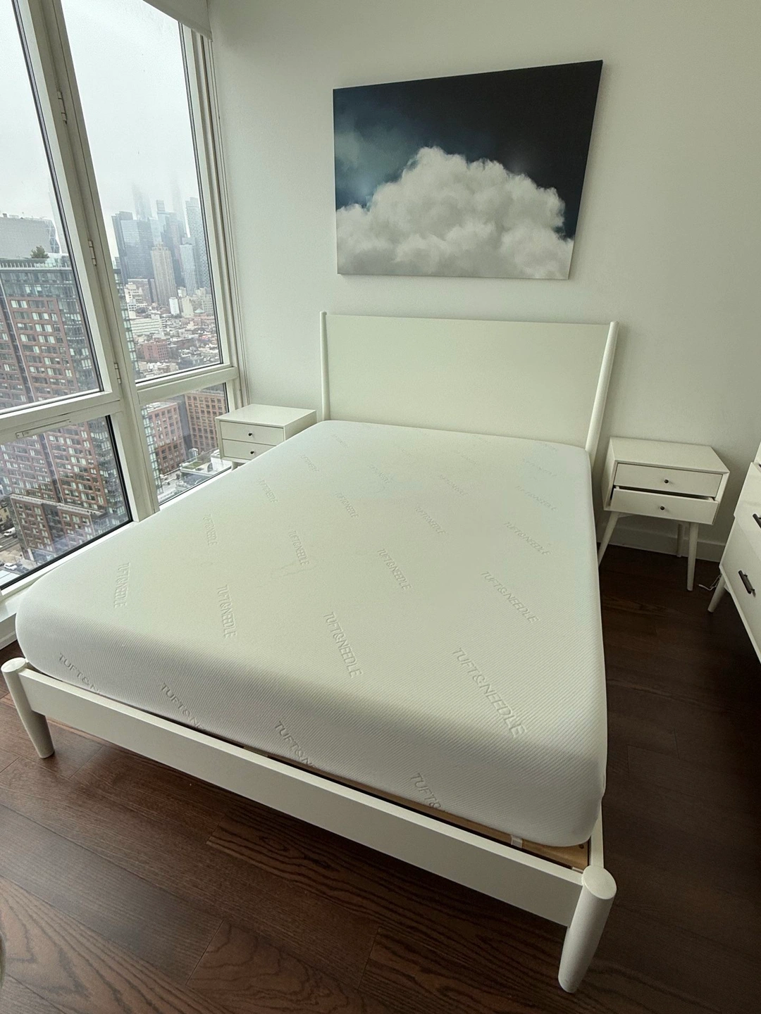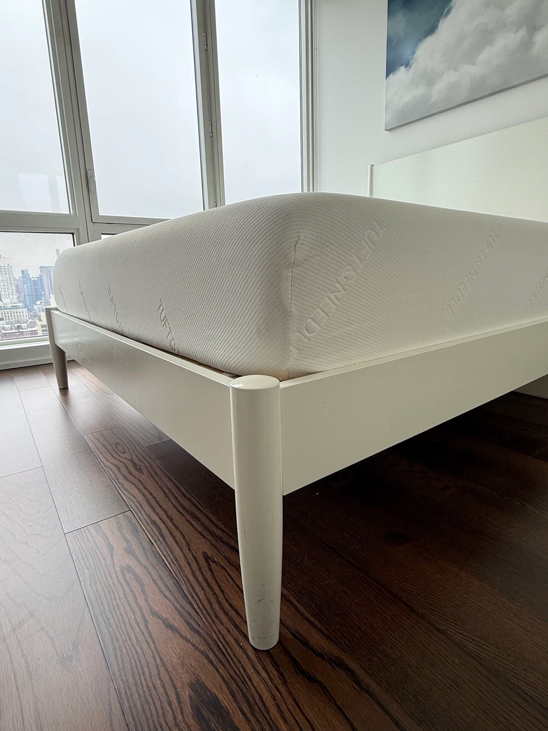 White solid wood midcentury modern West Elm bed. 4 years old in great condition with only minor buffs and scratches that can be buffed or covered with a bit of TLC. Retail $1300+. Matching nightstands, dresser and dresser mirror also available. Dimensions: Overall: 64"w x 84"d x 46.75"h Side rails: 1.9"w x 80"d x 5.5"h Floor to top of side rail: 13.5" Distance between slats: 3" Middle support legs: 3 Clearance: 8". Accommodates most standard mattresses; box spring optional. Pickup only; cash, Zelle or Venmo upon pickup.