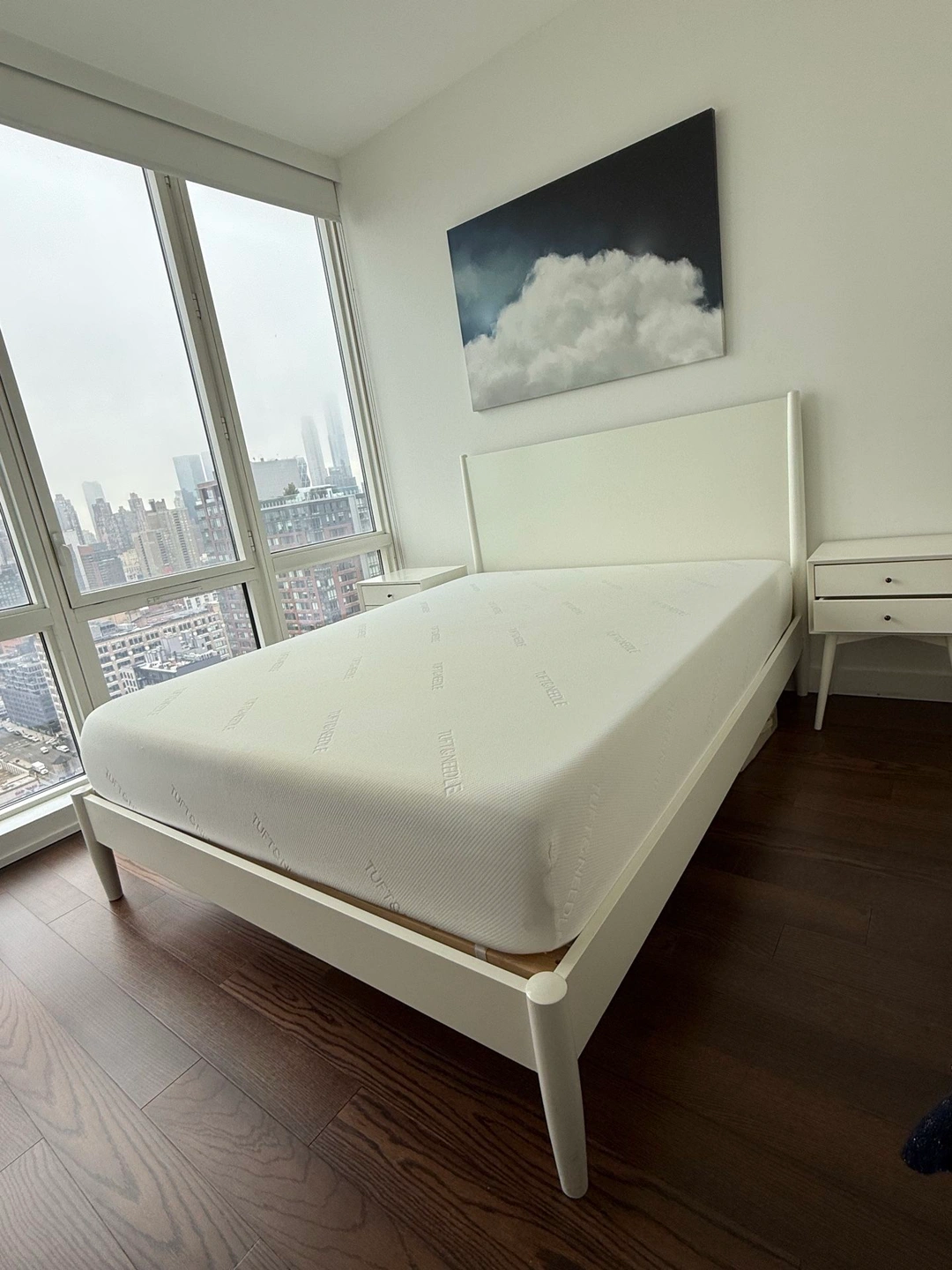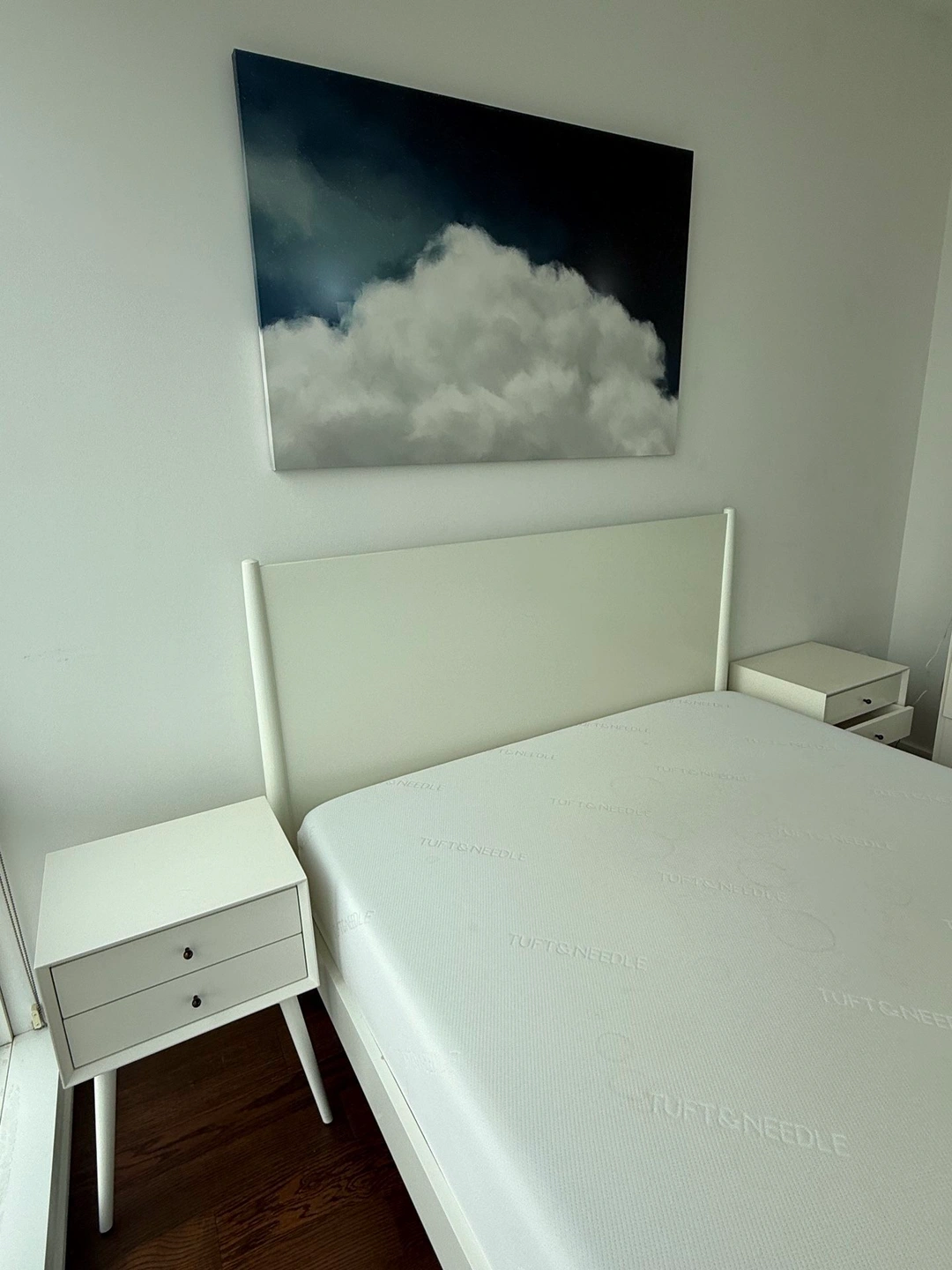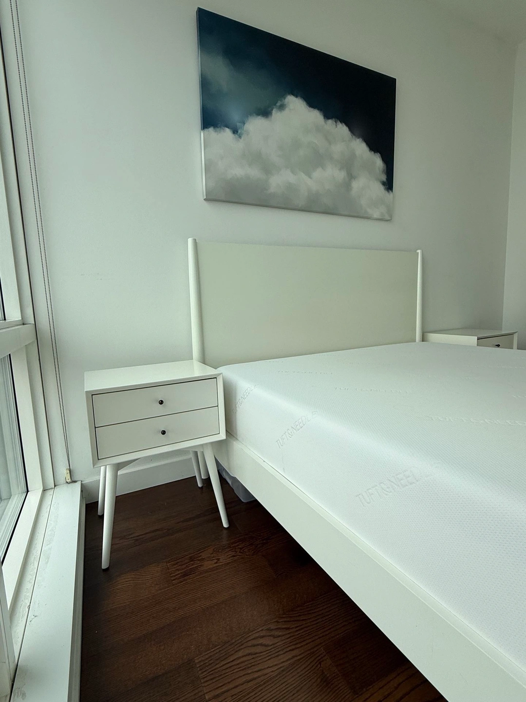 White solid wood midcentury modern West Elm bed. 4 years old in great condition with only minor buffs and scratches that can be buffed or covered with a bit of TLC. Retail $1300+. Matching nightstands, dresser and dresser mirror also available. Dimensions: Overall: 64"w x 84"d x 46.75"h Side rails: 1.9"w x 80"d x 5.5"h Floor to top of side rail: 13.5" Distance between slats: 3" Middle support legs: 3 Clearance: 8". Accommodates most standard mattresses; box spring optional. Pickup only; cash, Zelle or Venmo upon pickup.