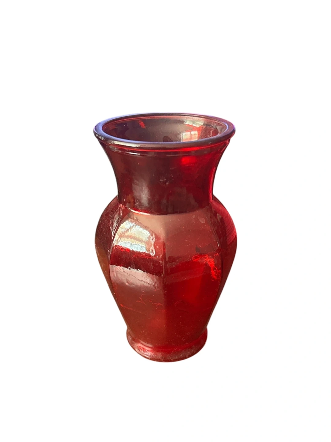 Set of two decorative vases. One is a faceted dark red glass vase. The other is a ribbed pink vase. These are nice for small floral arrangements! Pick up only, cash only.