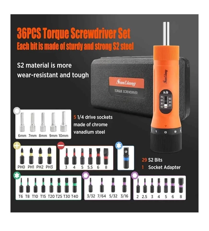 36Pcs Torque Screwdriver Wrench Driver Set 10-70 Inch Pounds lbs with 29 S2 Bits,5 Drive Sockets ,1/4" Socket Adapter for Maintenance,Tools, Bike Repairing and Mounting.