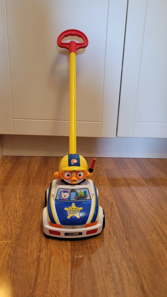 This is a Pororo push car, it is in the shape of a police car. The car has a long push handle. It is yellow and blue with Pororo on top. Retail price is $25.