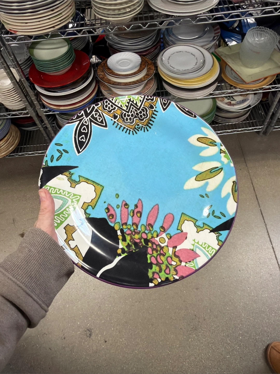This is a large decorative plate with a vibrant blue background and a colorful floral pattern. It's perfect for adding a pop of color to your kitchen or dining area. The plate is made of ceramic. I have a set of four made by Poetic wanderlust very collectible