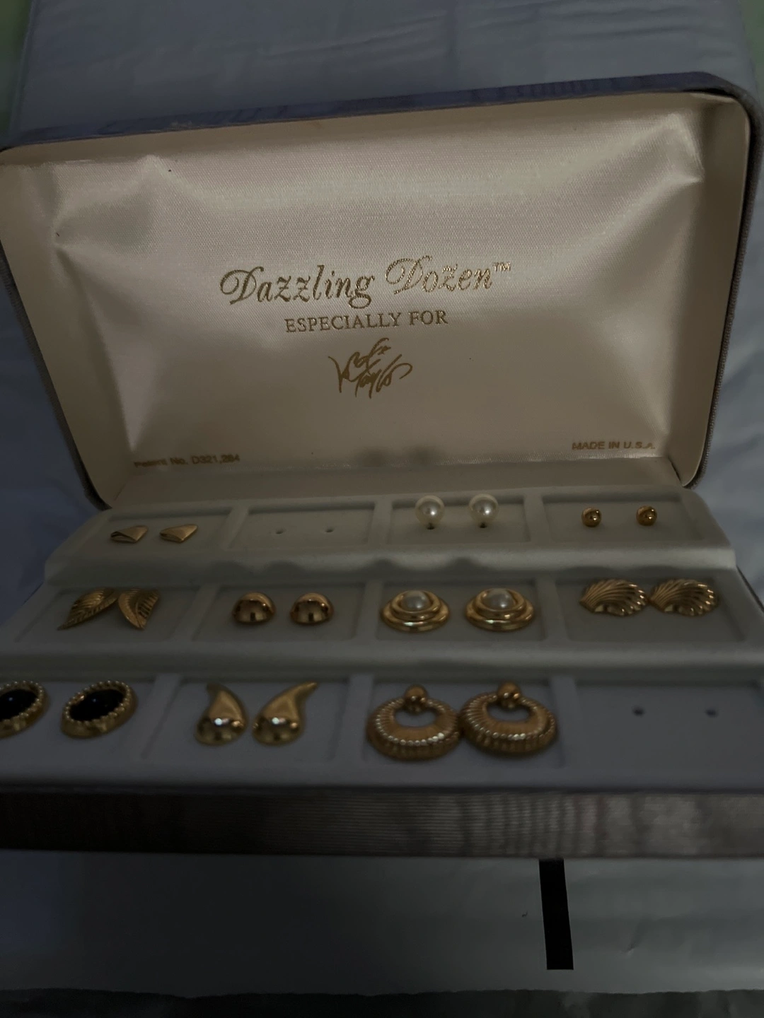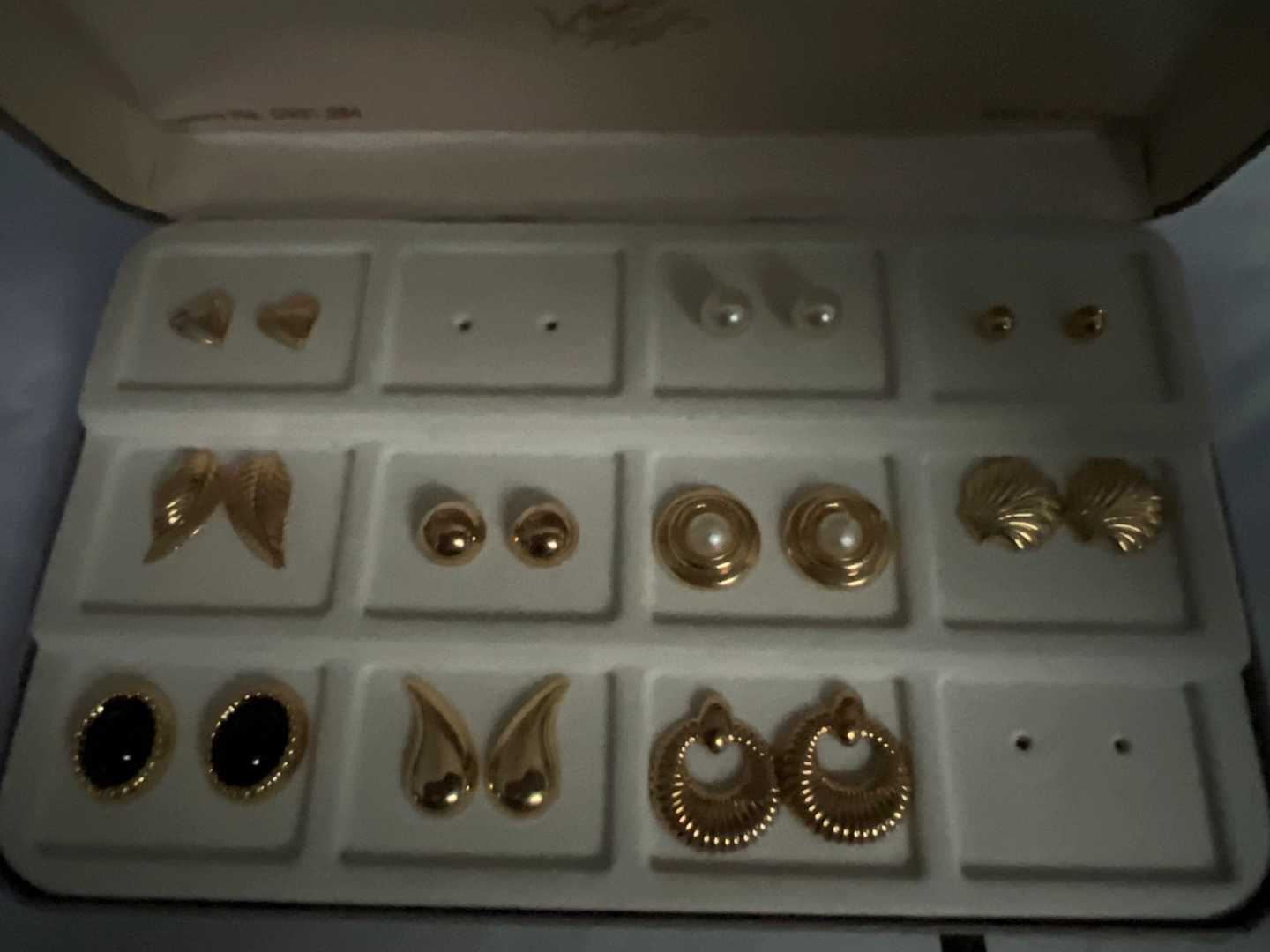 The set includes a variety of gold-tone earrings in different styles, all in the original box. A unique addition to any jewelry collection! New unworn.