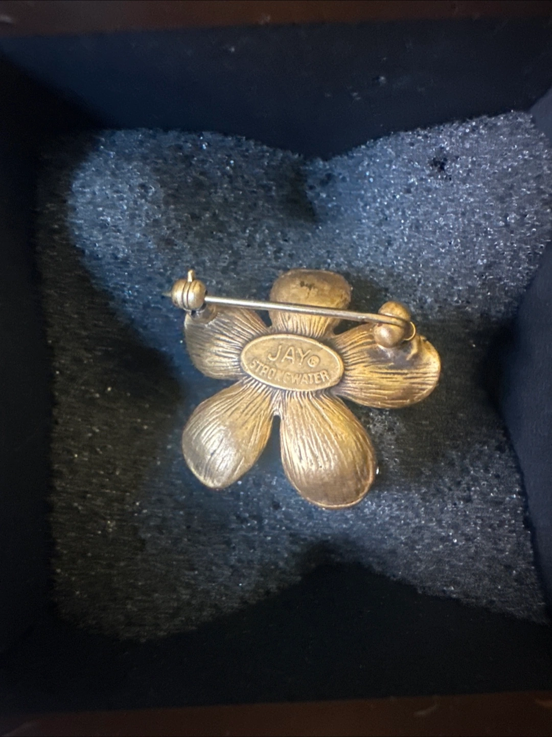 Selling a beautiful Jay Strongwater flower brooch pin. It comes in its original box and is in great condition! The brooch features a lovely flower design with intricate details. Perfect for adding a touch of elegance to any outfit