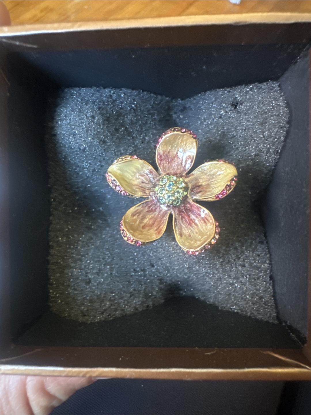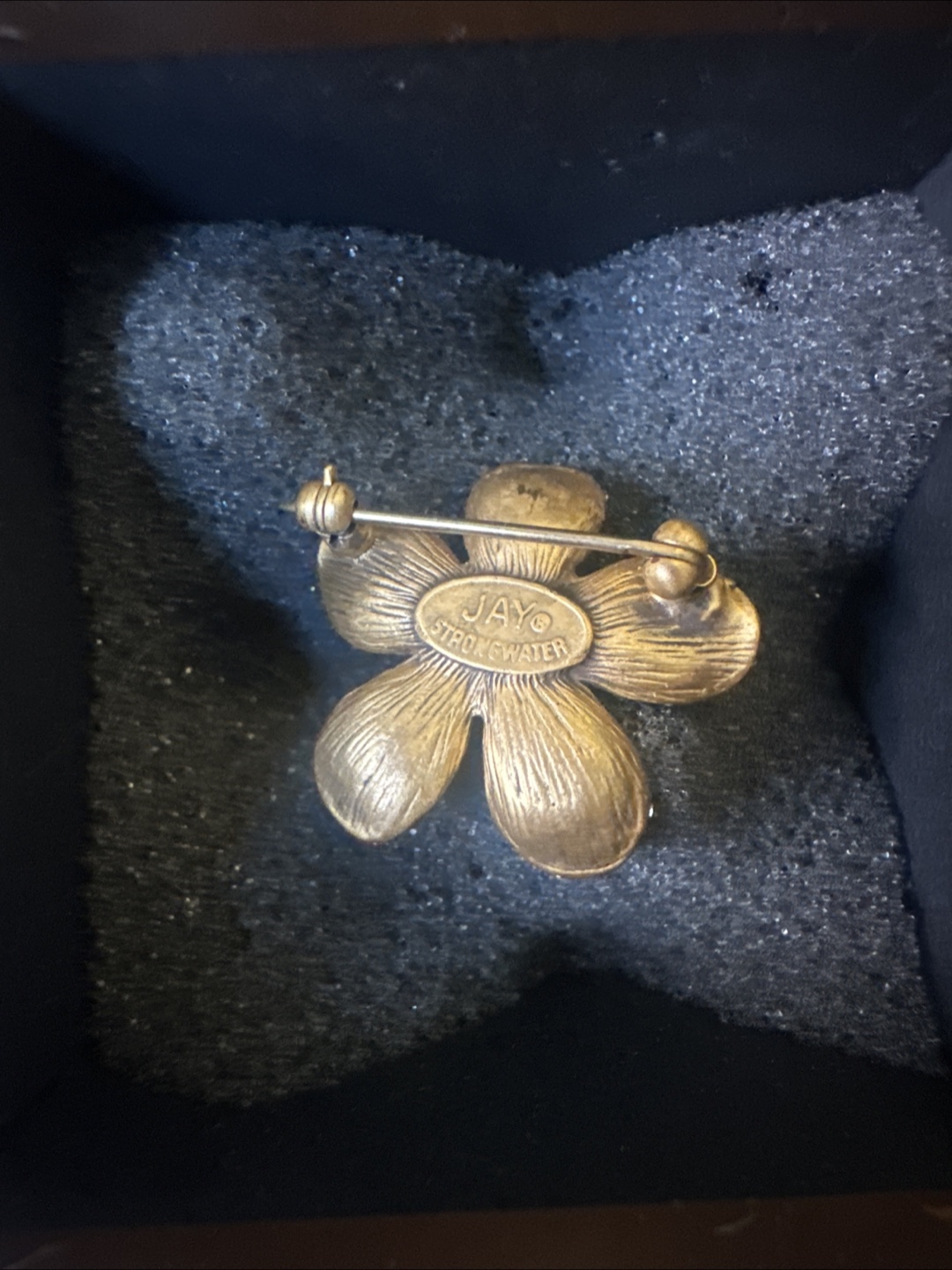 Selling a beautiful Jay Strongwater flower brooch pin. It comes in its original box and is in great condition! The brooch features a lovely flower design with intricate details. Perfect for adding a touch of elegance to any outfit
