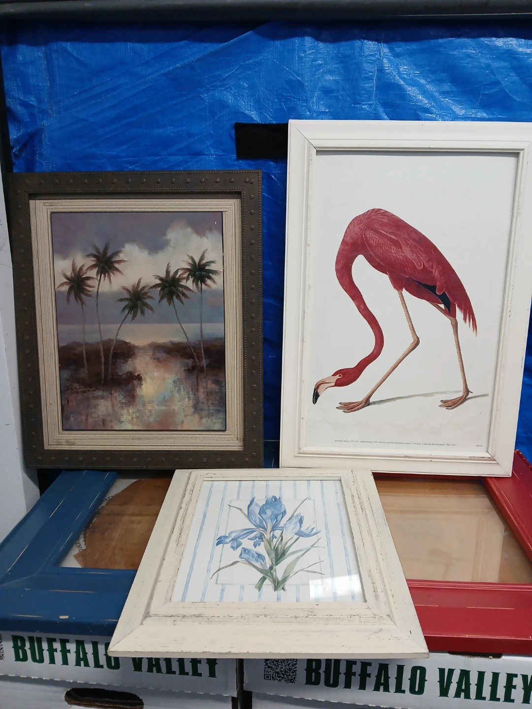 A collection of three framed art prints, featuring a tropical palm tree landscape, a pink flamingo, and a blue iris. The prints add a touch of decorative flair to any space. They're ready to hang and enhance your home decor!