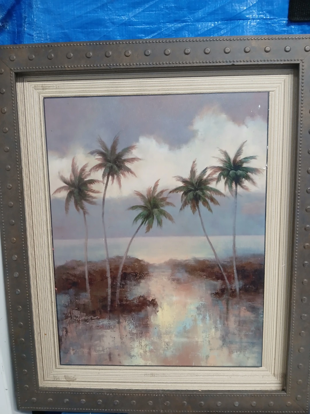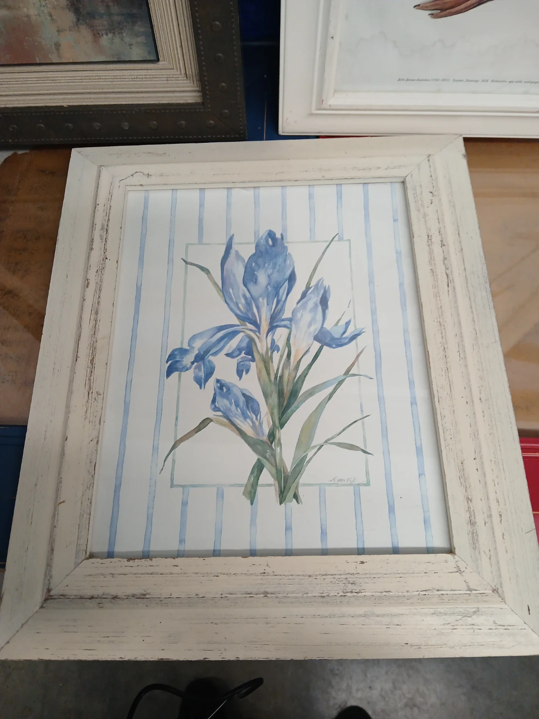 A collection of three framed art prints, featuring a tropical palm tree landscape, a pink flamingo, and a blue iris. The prints add a touch of decorative flair to any space. They're ready to hang and enhance your home decor!