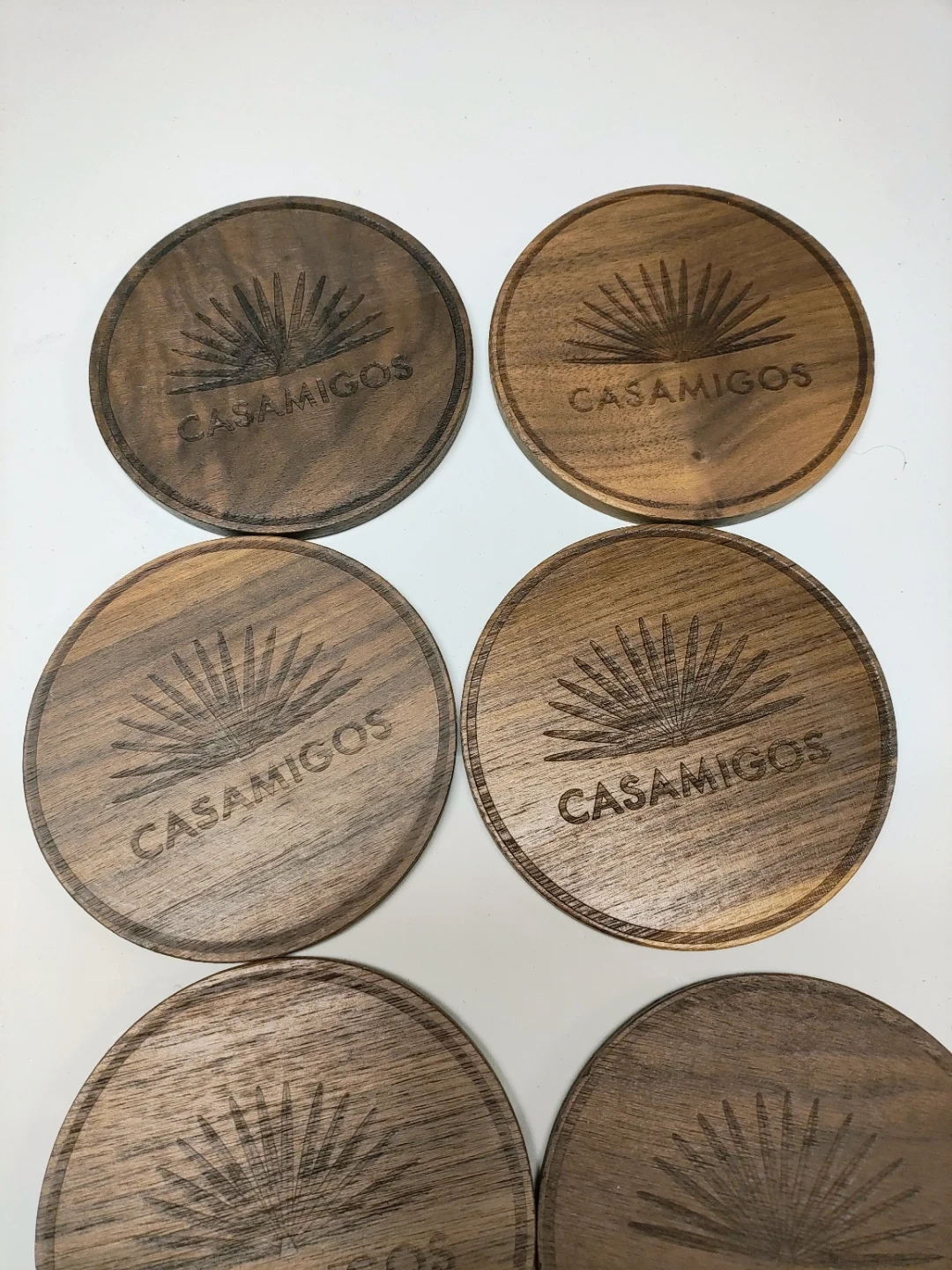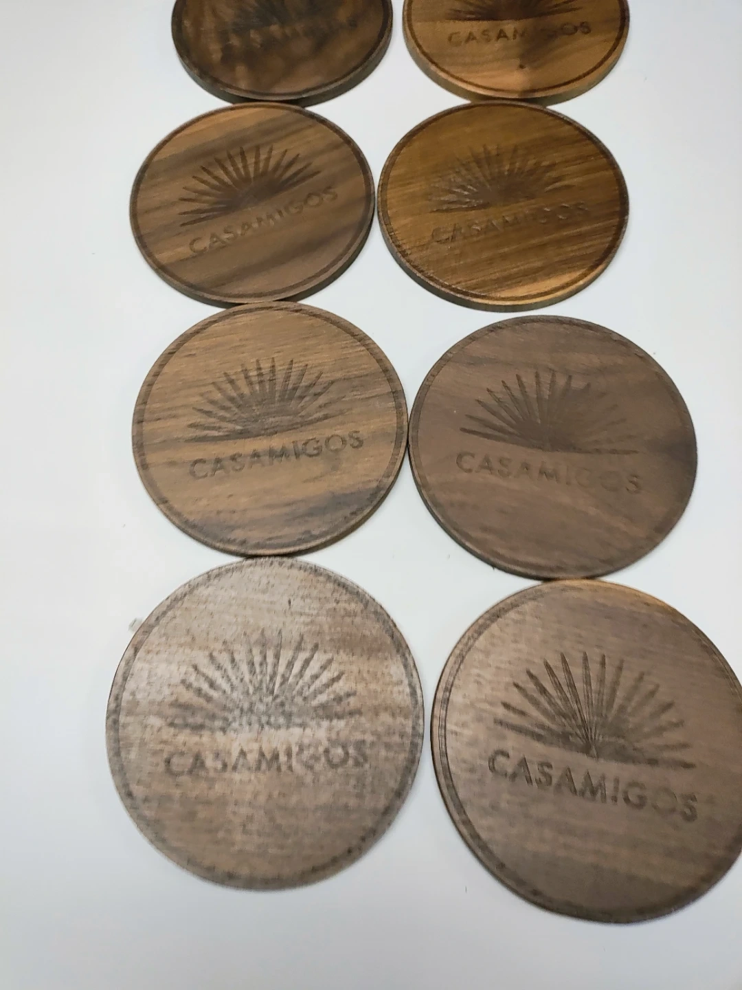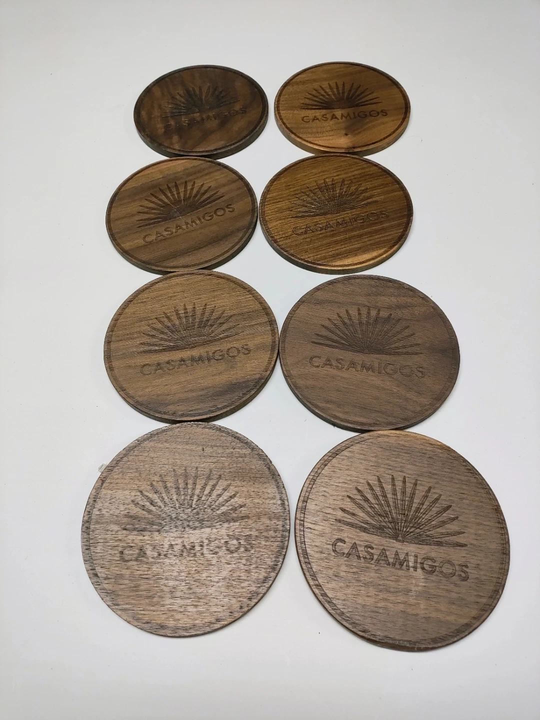 Set of 8 wood coasters branded with the CASAMIGOS Tequila logo agave plant. Made in Mexico. Colors of the wood may vary from coaster to coaster. 4" in diameter. Cash only pick up only