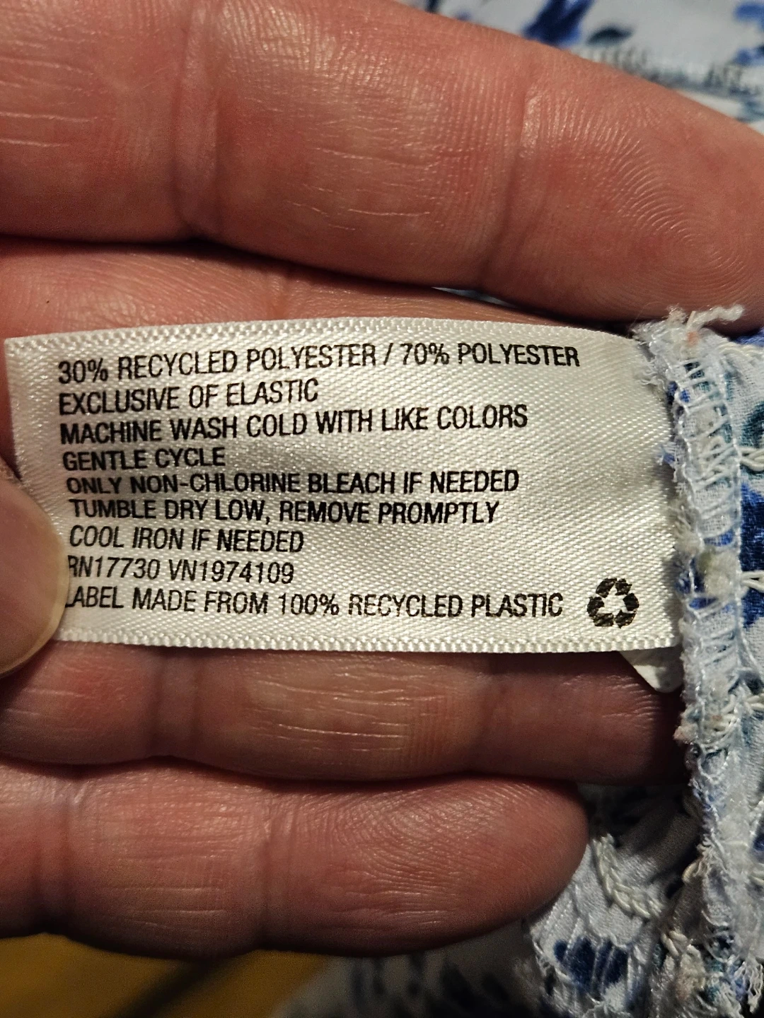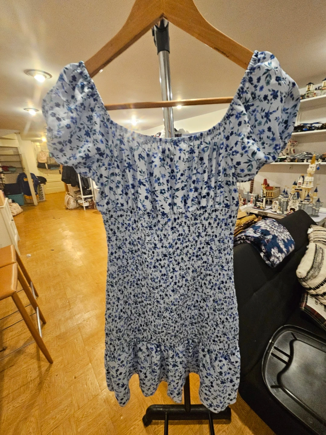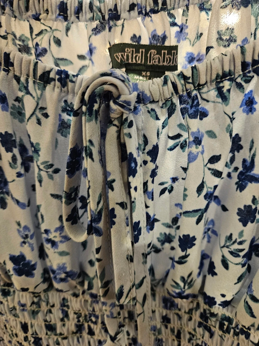 This is a Wild Fable women's dress. It's a size XS with a blue floral print. The dress features smocking on the bodice and puff sleeves.