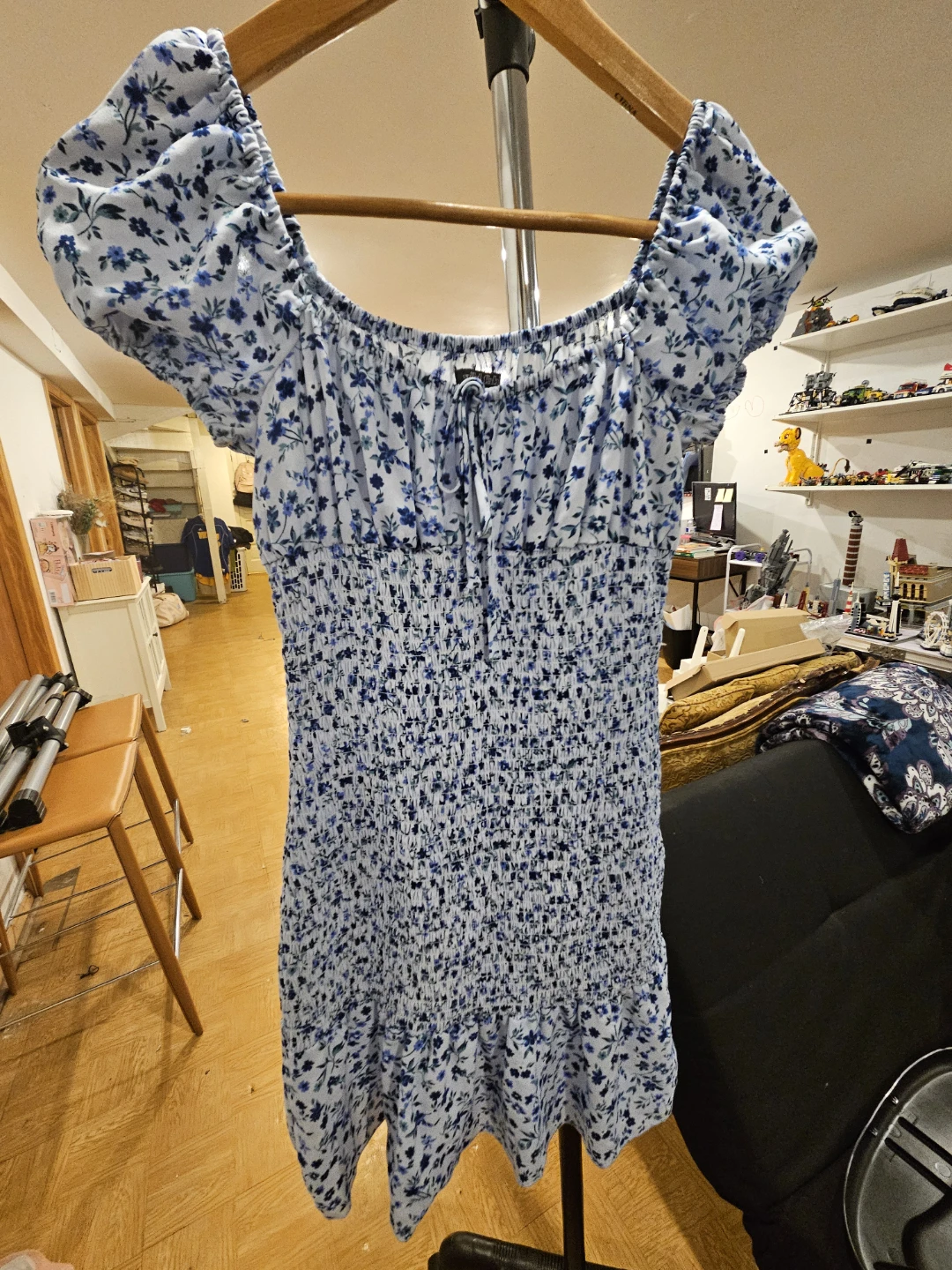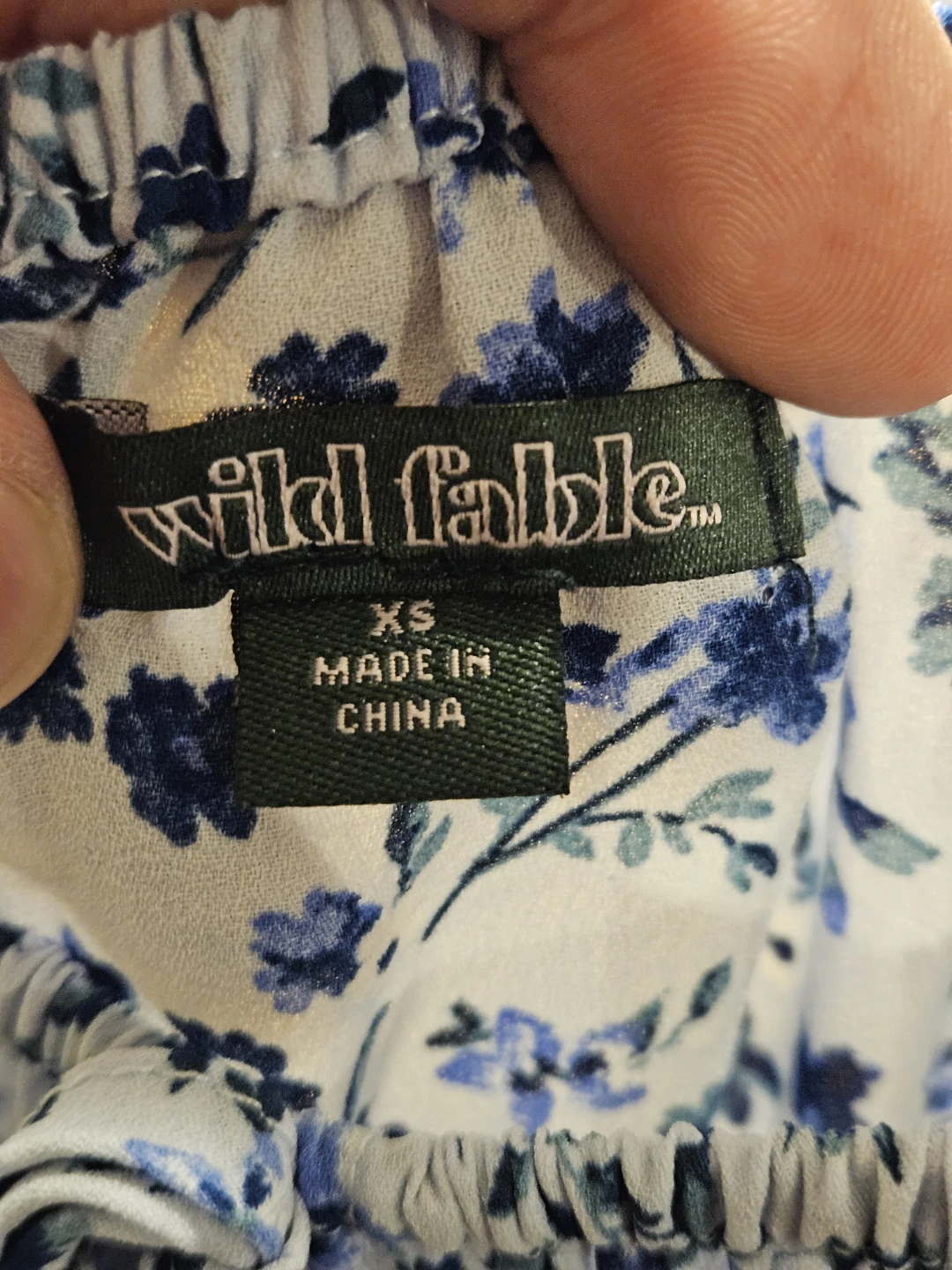 This is a Wild Fable women's dress. It's a size XS with a blue floral print. The dress features smocking on the bodice and puff sleeves.