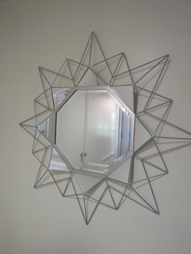 Selling a really cool starburst geometric wall mirror! It's in great condition and would look great in any room. The frame has a unique design that catches the eye. It's perfect for adding a touch of modern style to your home!