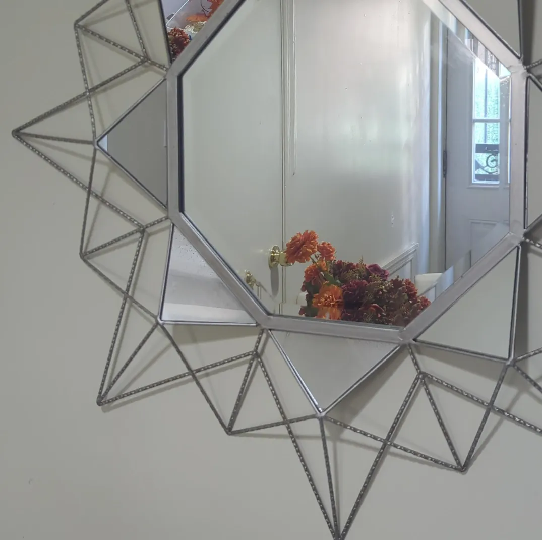 Selling a really cool starburst geometric wall mirror! It's in great condition and would look great in any room. The frame has a unique design that catches the eye. It's perfect for adding a touch of modern style to your home!