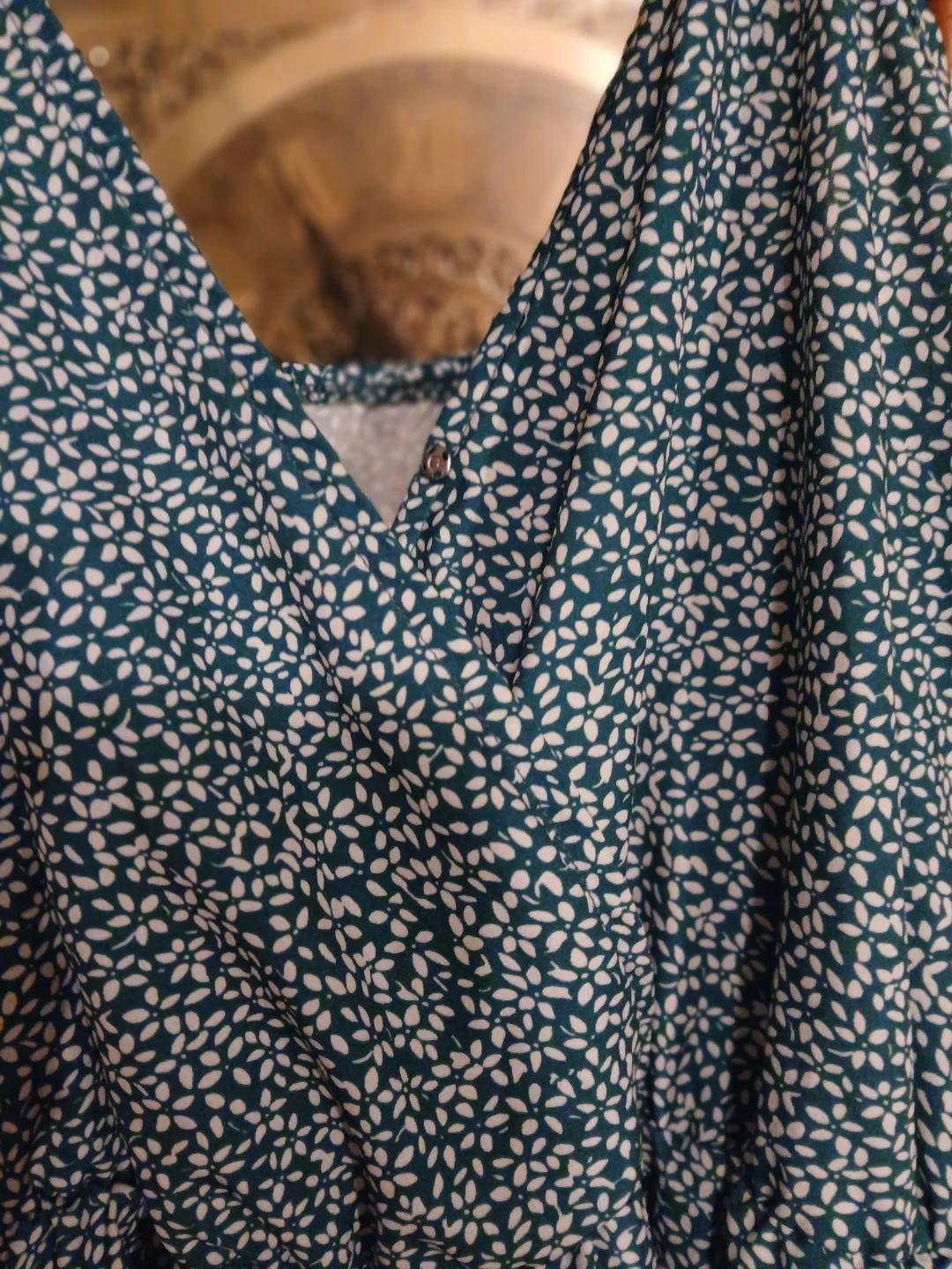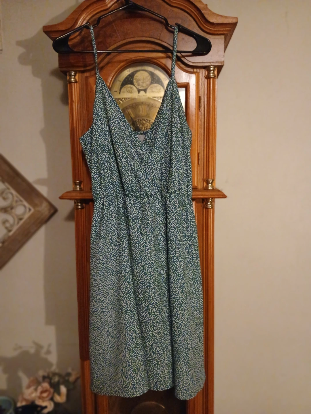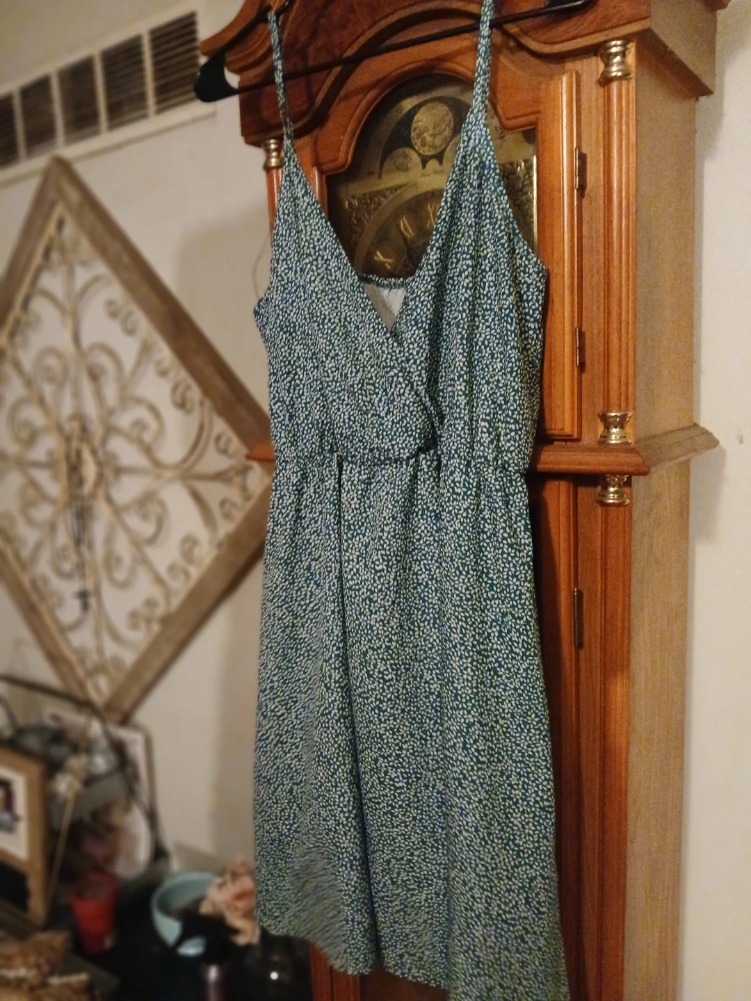 This sleeveless wrap dress has a v-neck and an elastic waistline. It's made of a lightweight, flowy fabric with a green and white floral print. The adjustable spaghetti straps provide a comfortable fit.