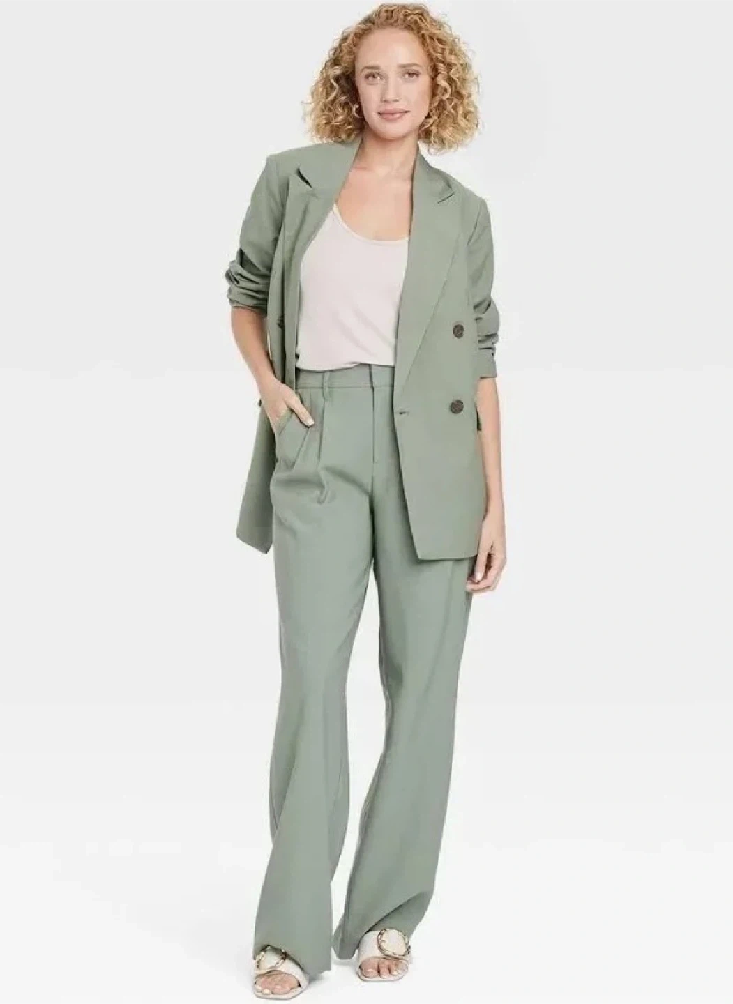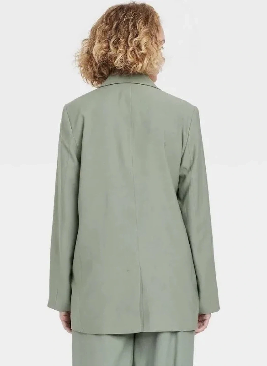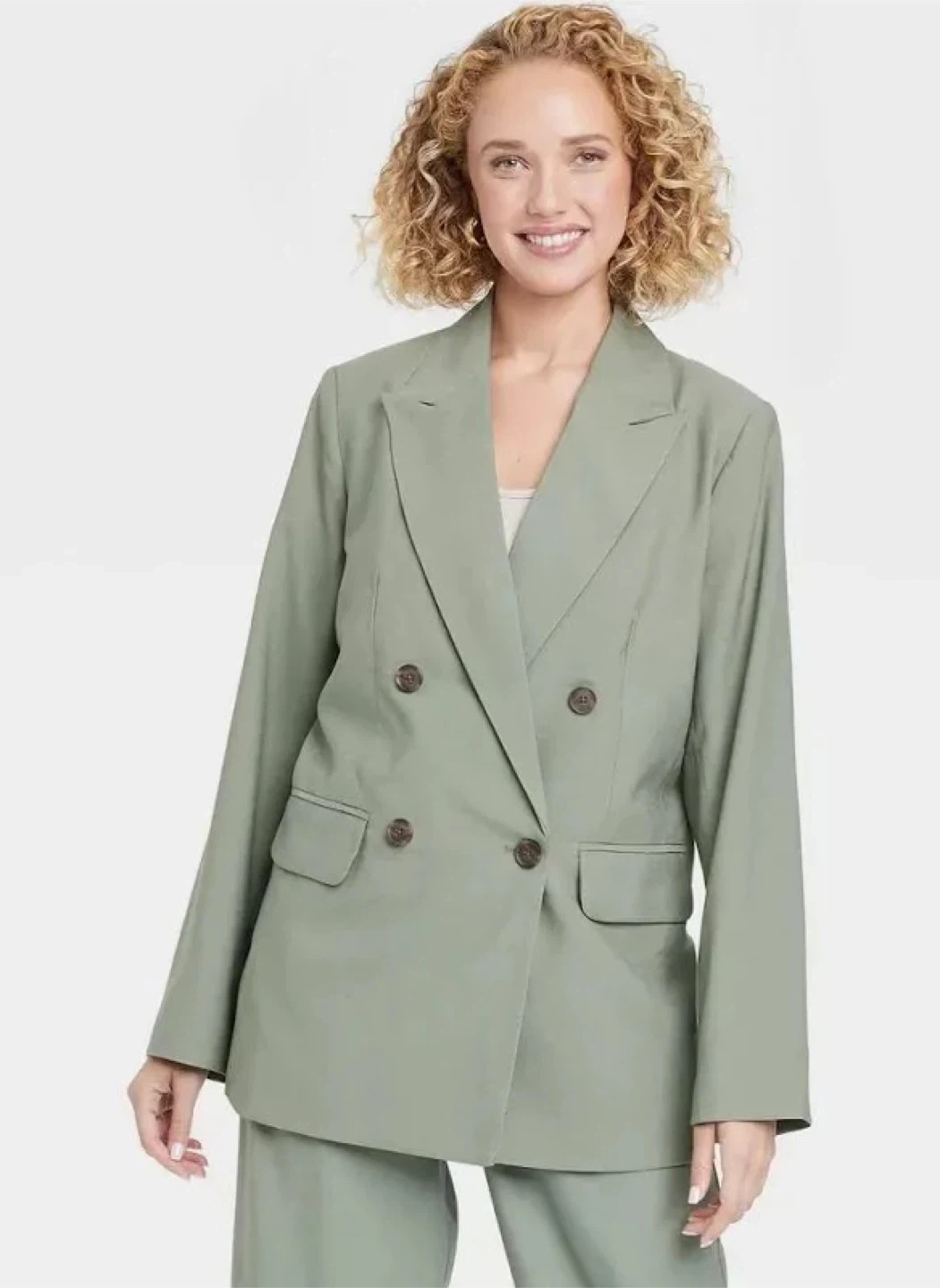 Target brand A New Day blazer in a beautiful sage green color! I have it in sizes XS -2X. This blazer is perfect for adding a touch of sophistication to any outfit. It features a double-breasted design with button closures and functional pockets. It's a stylish and versatile piece for your wardrobe.