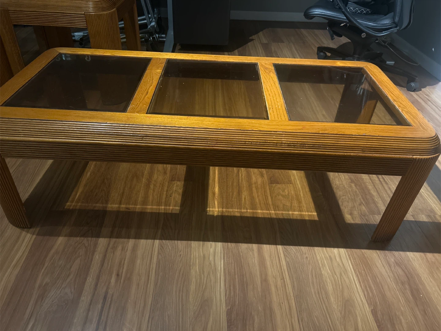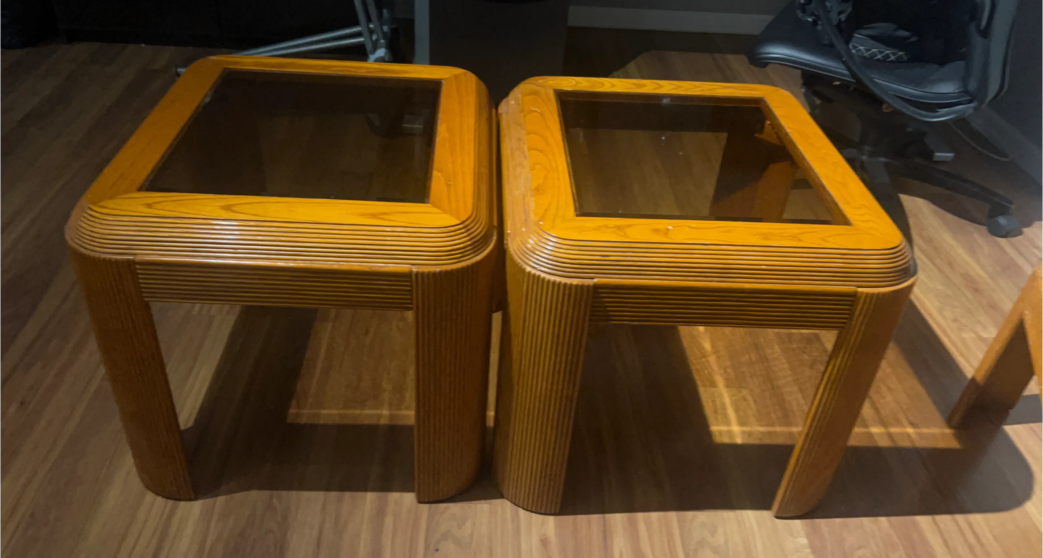 Selling a vintage coffee table set with a unique wood and glass design. It includes one coffee table and two end tables. The wood has a warm, natural tone that would complement any living room. The glass tops are in good condition, and the overall set is sturdy.