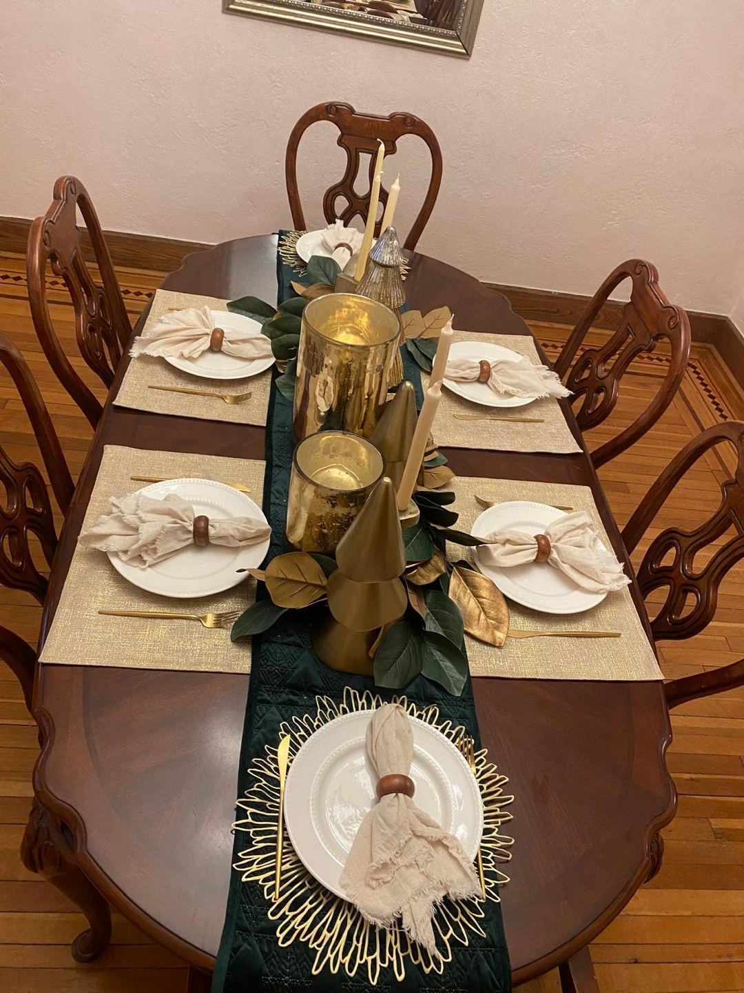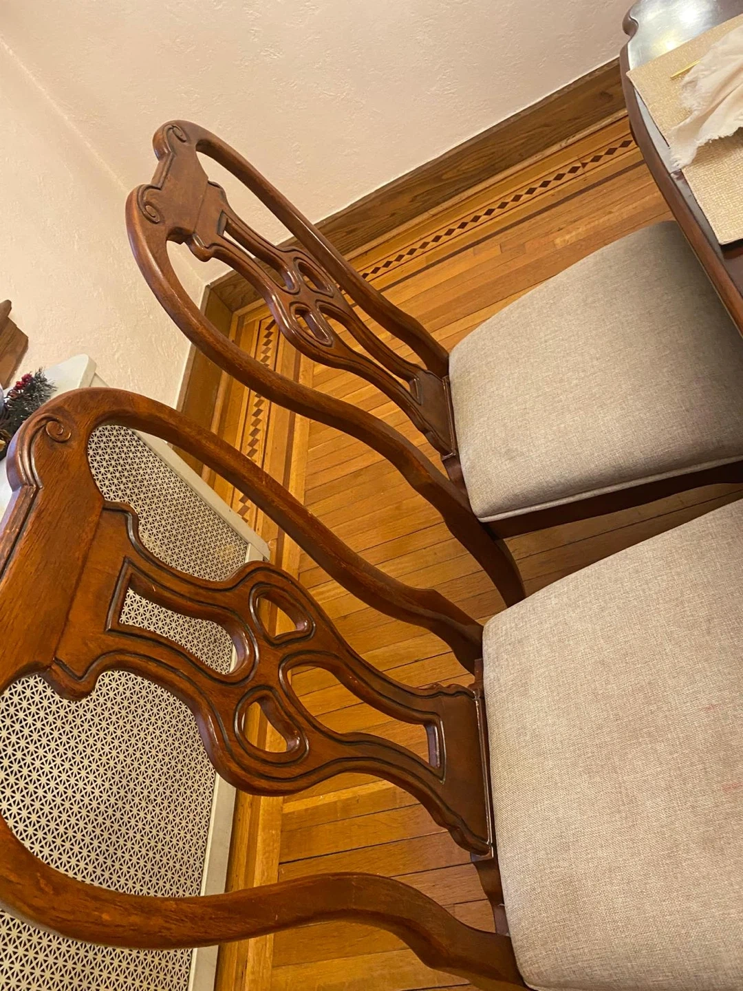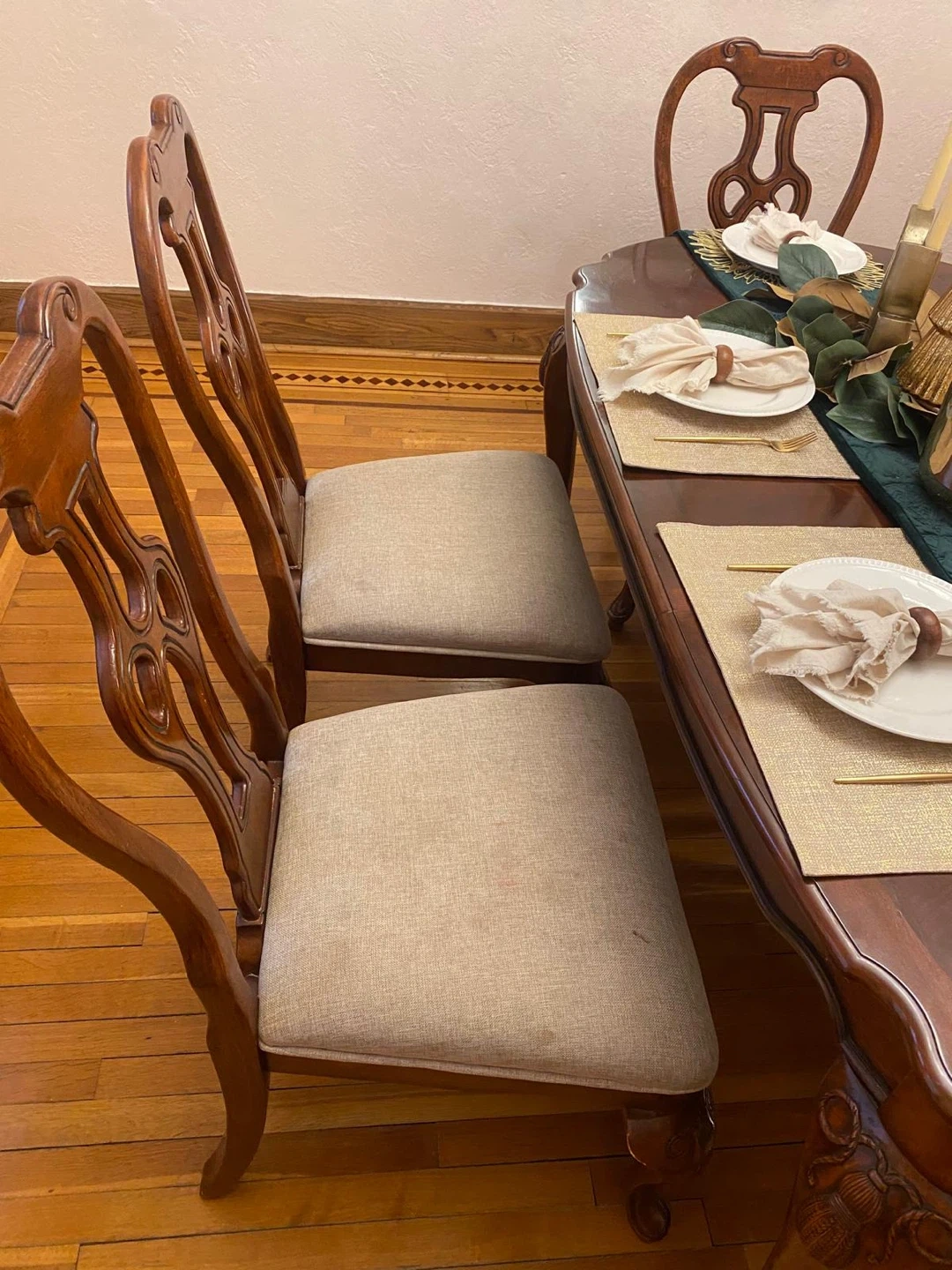 Selling a set of 6 dining table chairs. They're in great condition and would look lovely in any dining room! The chairs feature a beautiful wood finish and neutral-colored seats.