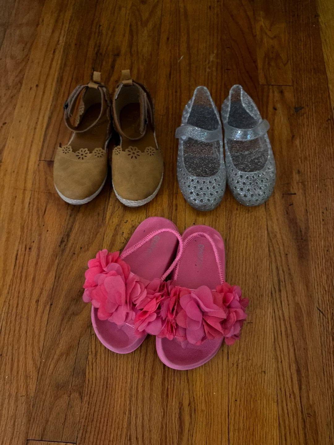 Three pairs of girls' shoes. Includes tan ankle strap sandals with cut-out detail, silver glitter jelly flats, and bright pink slides with flower embellishments. Good condition!