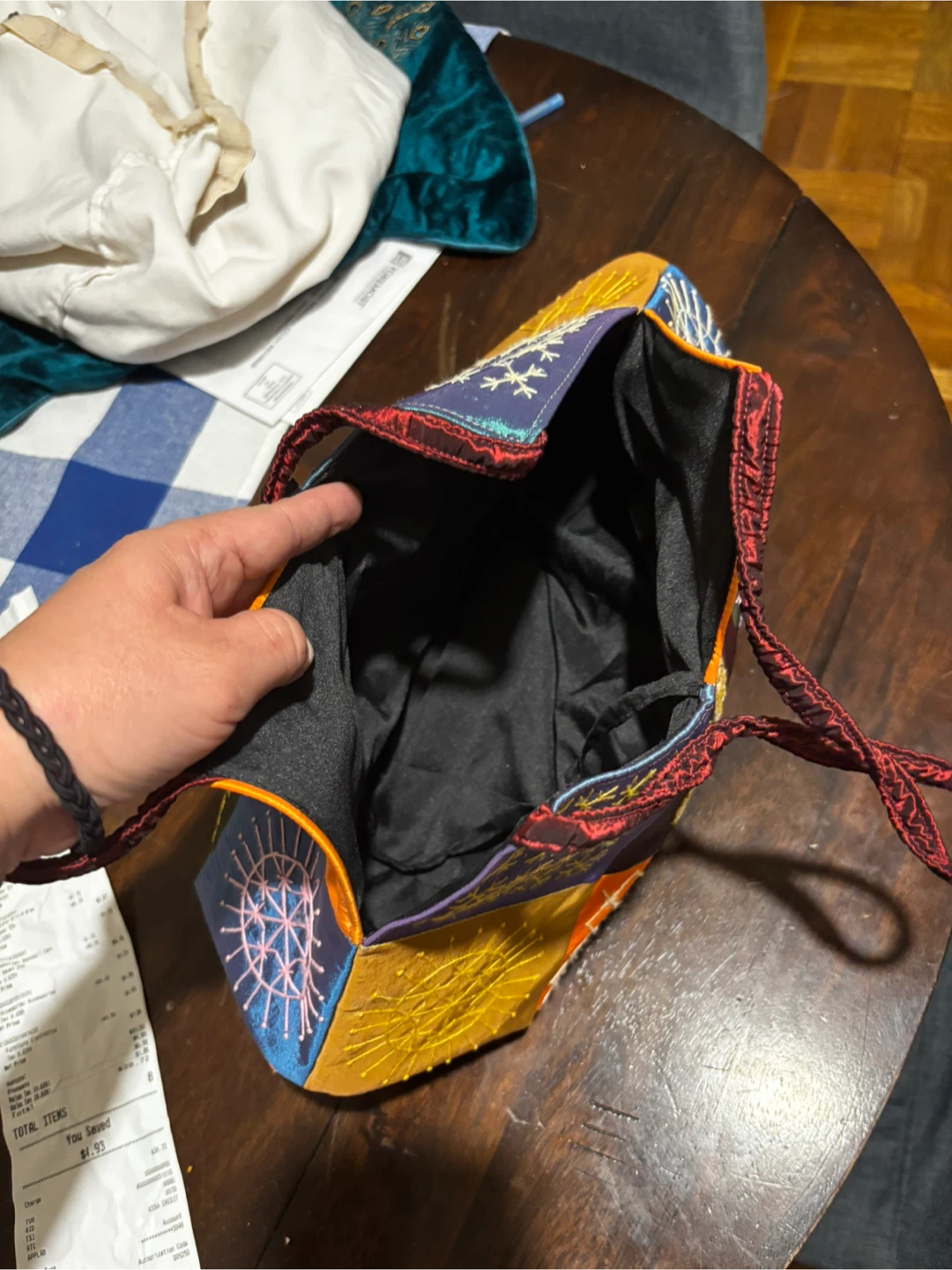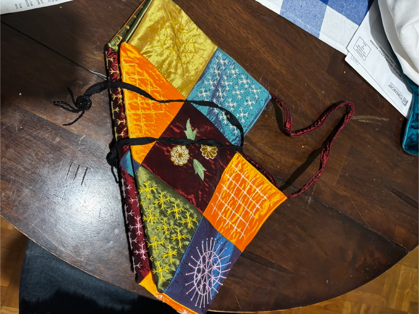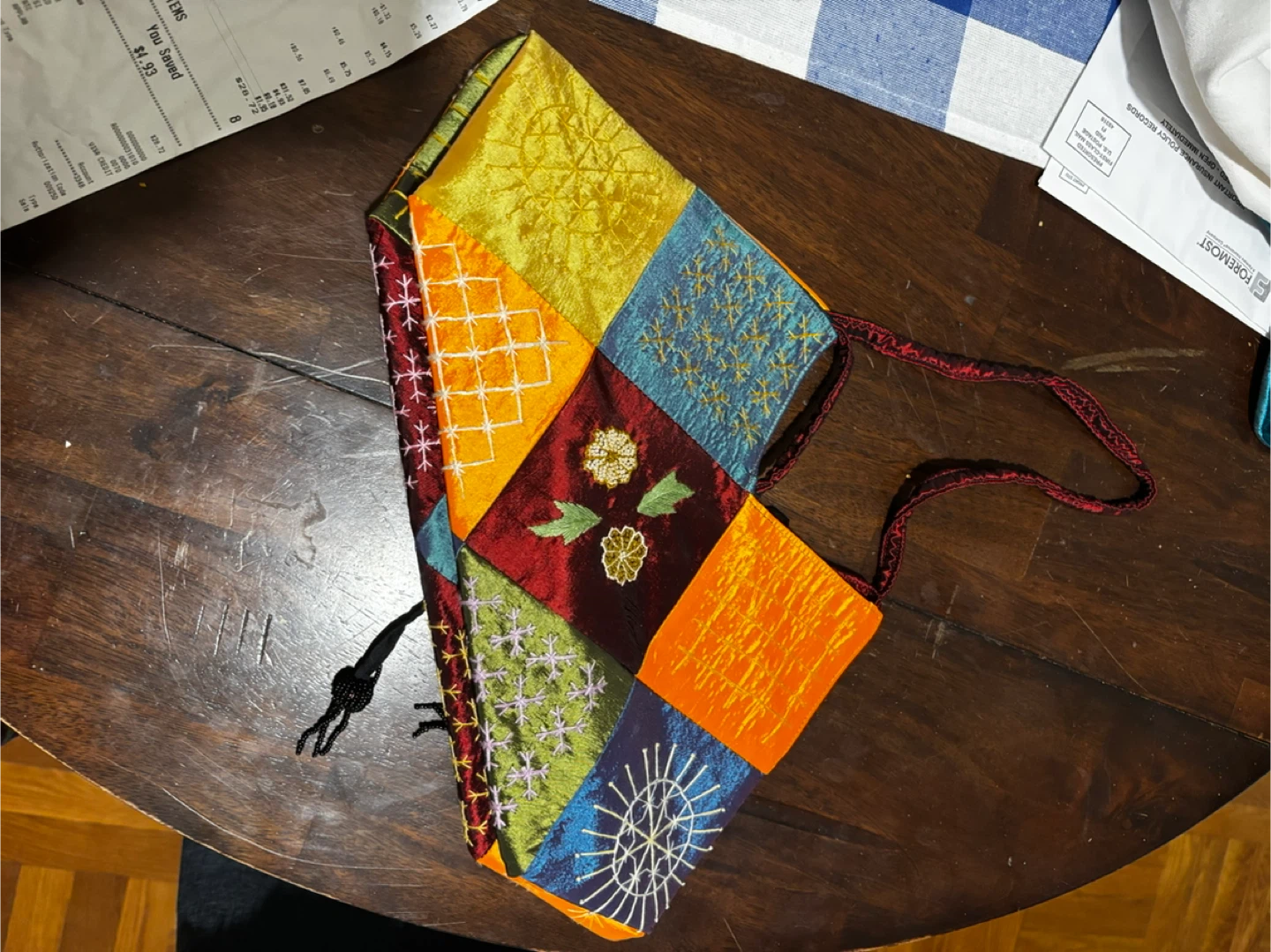 Quirky and colorful patchwork shoulder bag. Features intricate embroidery on various fabric panels. Bag is about 14 inches tall and 12 inches wide at its widest point. The straps are braided red cord.