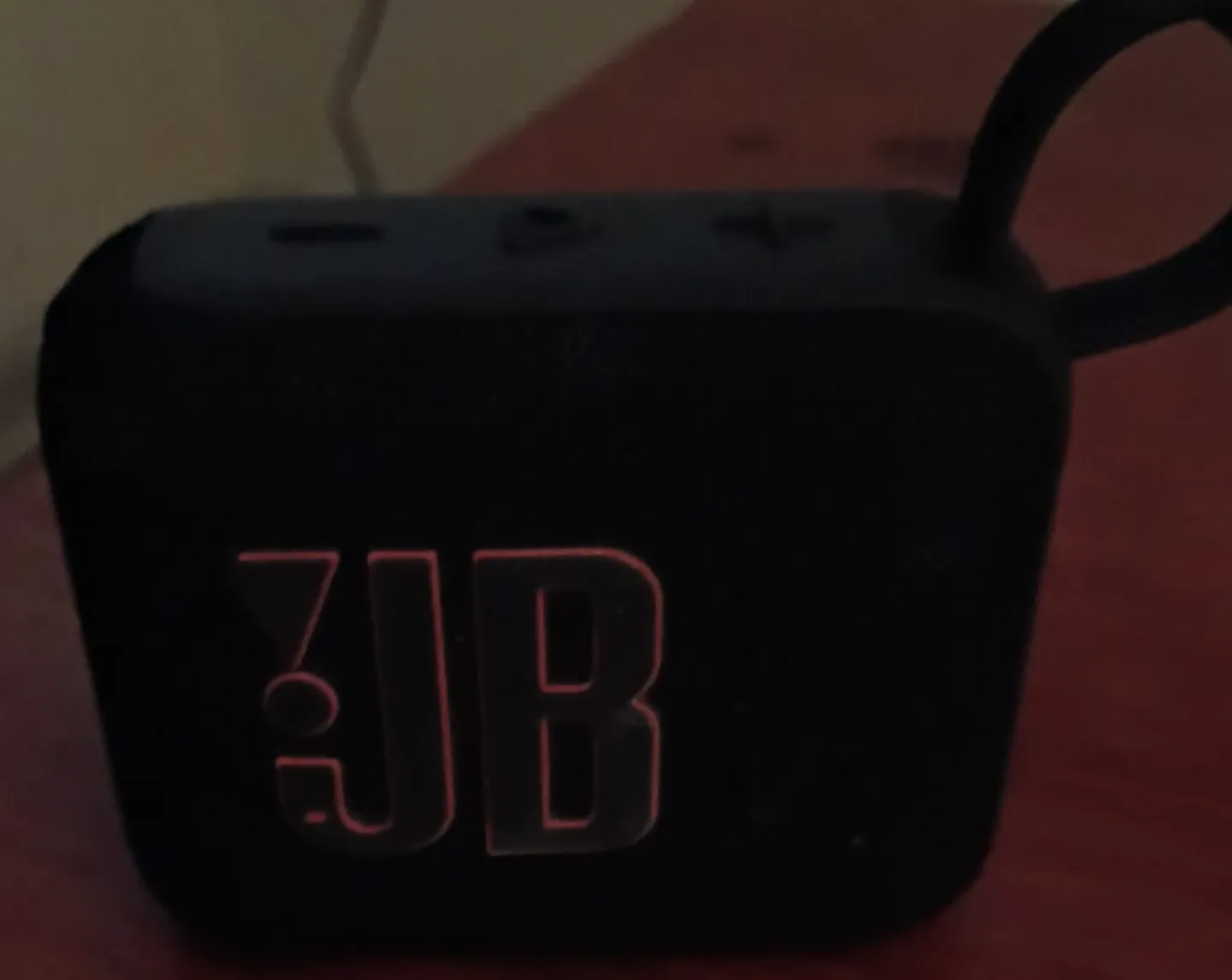 This is a JBL Go 3 portable speaker. It's black with a prominent red JBL logo. It's designed for portability and durability.