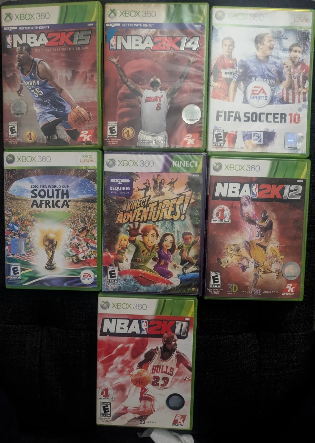164Selling a bundle of Xbox 360 games! Includes: - NBA 2K15 - NBA 2K14 - FIFA Soccer 10 - 2010 FIFA World Cup South Africa - Kinect Adventures! - NBA 2K12 - NBA 2K11
