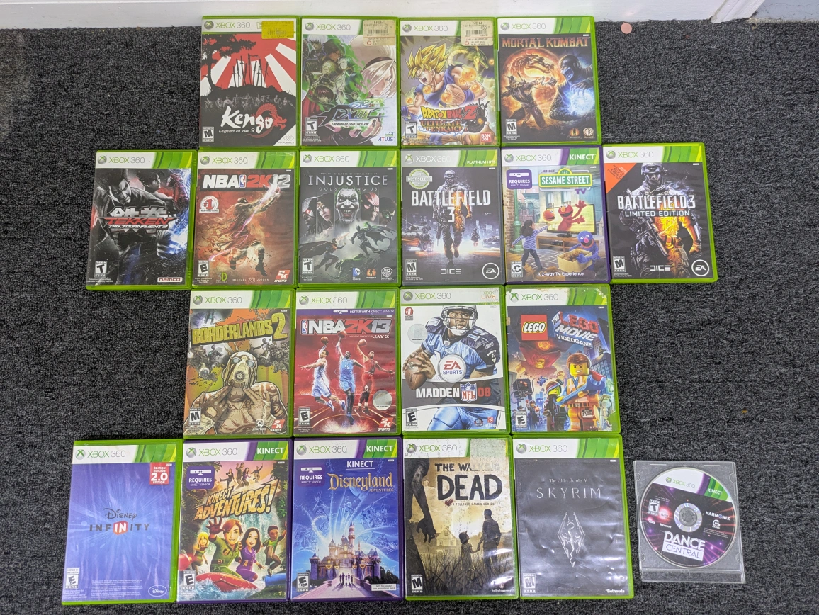 Selling a collection of Xbox 360 games! Great for anyone looking to expand their Xbox 360 game library. All or sold separate All games together or sold separate Kengo legend of the 9 $30 The king of fighters 13 $30 Dragon Ball Z ultimate tenkaichi $15 Mortal Kombat $14 Tekken tag tournament 2 $8 NBA 2K 12 $8 Injustice Gods among Us (no manual) $7 Battlefield 3 (no manual) $5 Sesame Street TV (no manual) $5 Battlefield 3 limited edition (no manual) $4 Borderlands 2 $4 NBA 2K 13 $4 Madden 08 $4 The Lego movie videogame $4 Disney infinity $4 Kinect Adventures $4 Disneyland (no manual) $4 The Walking Dead $4 Skyrim the golden scrolls 5 $3 Dance Central (loose) $4