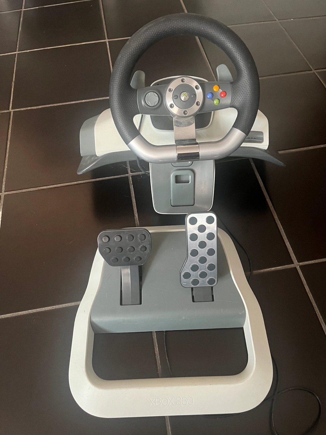 Selling an Xbox 360 racing wheel complete with pedals! It's in good condition and ready for some serious racing action. Perfect for anyone looking to enhance their gaming experience on the Xbox 360