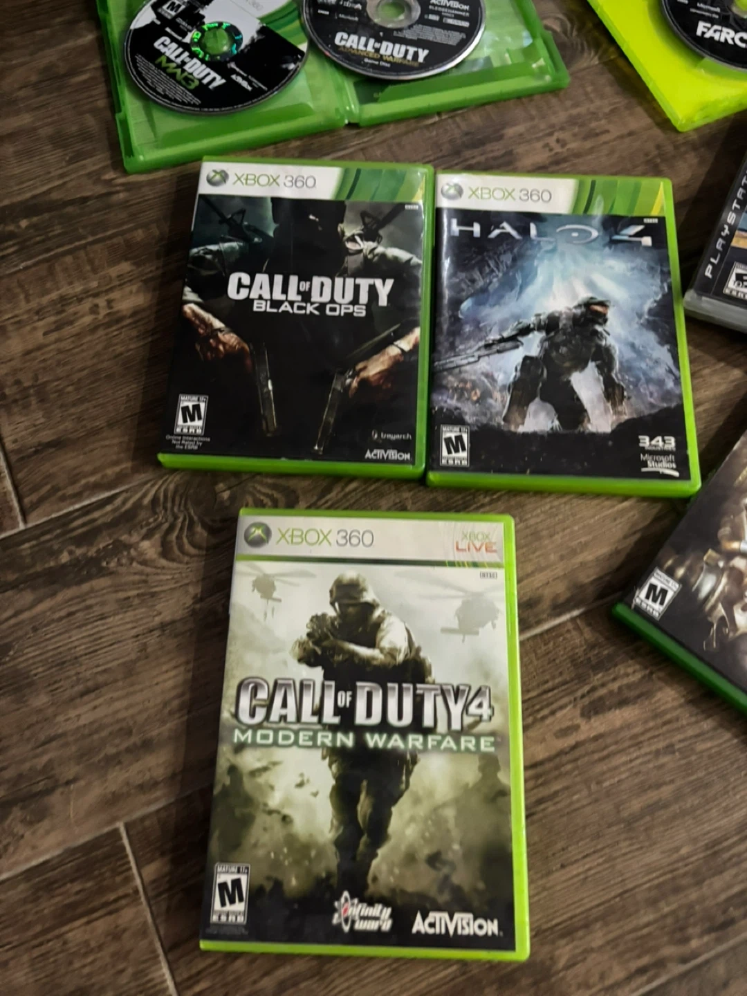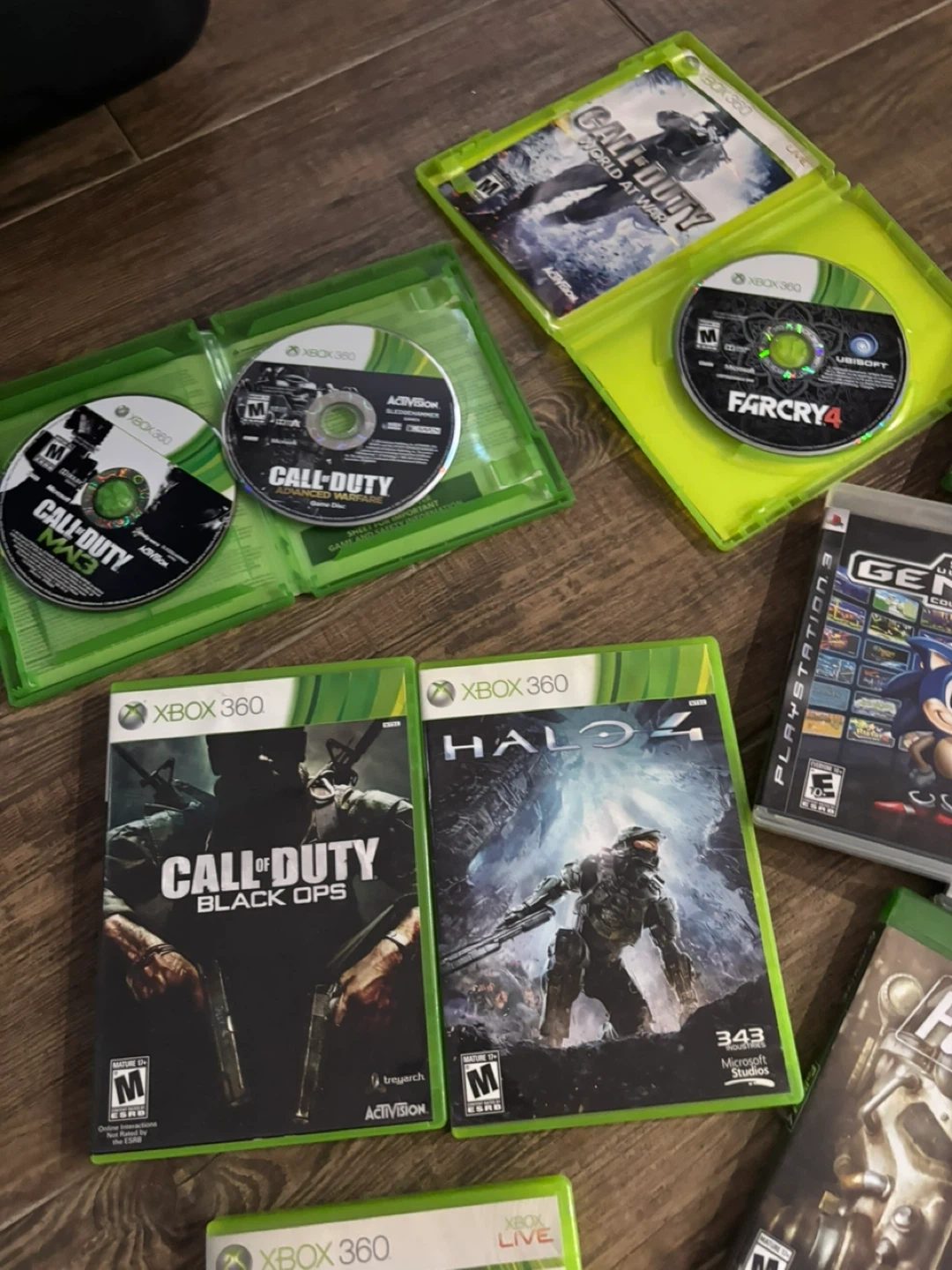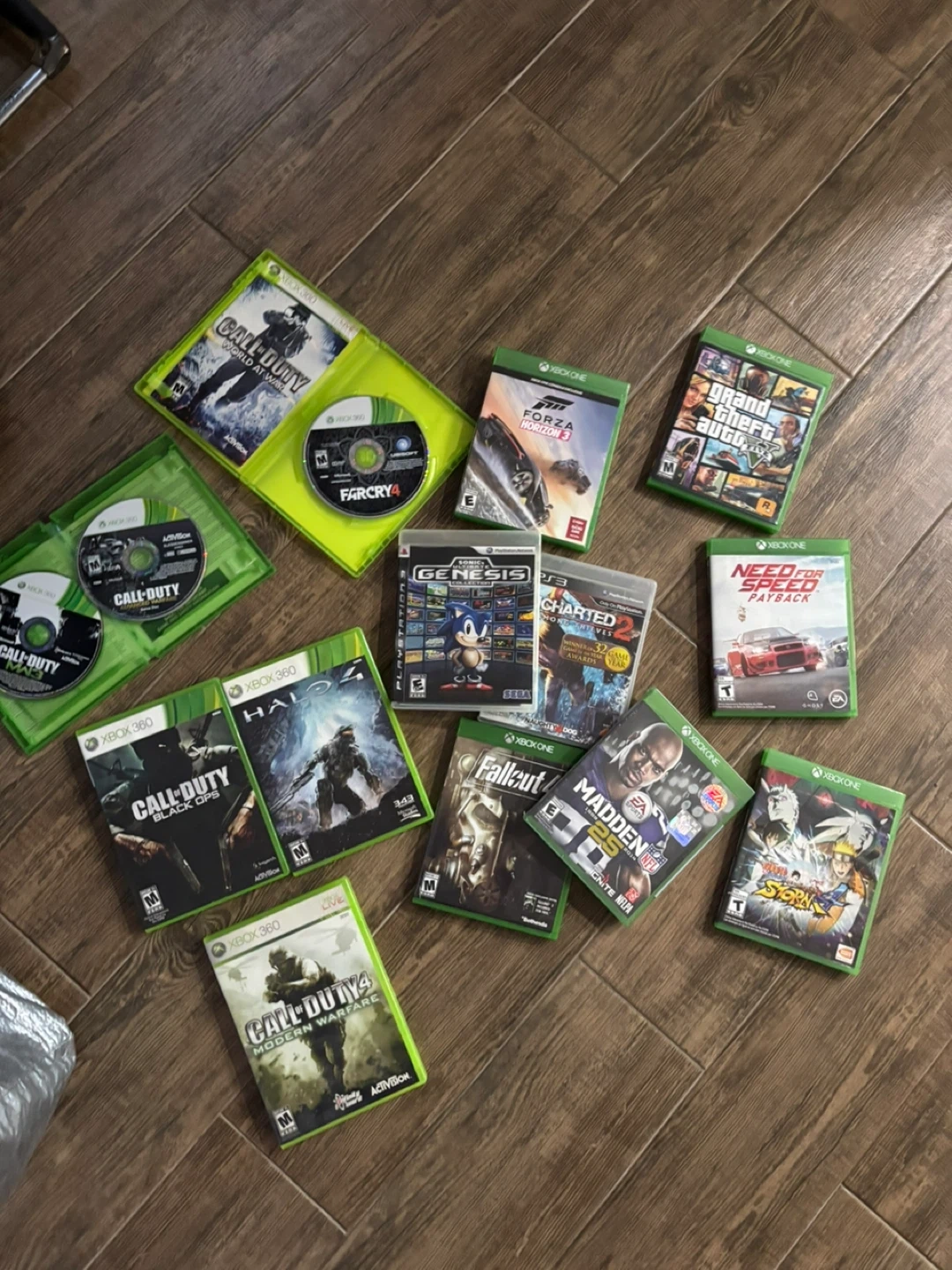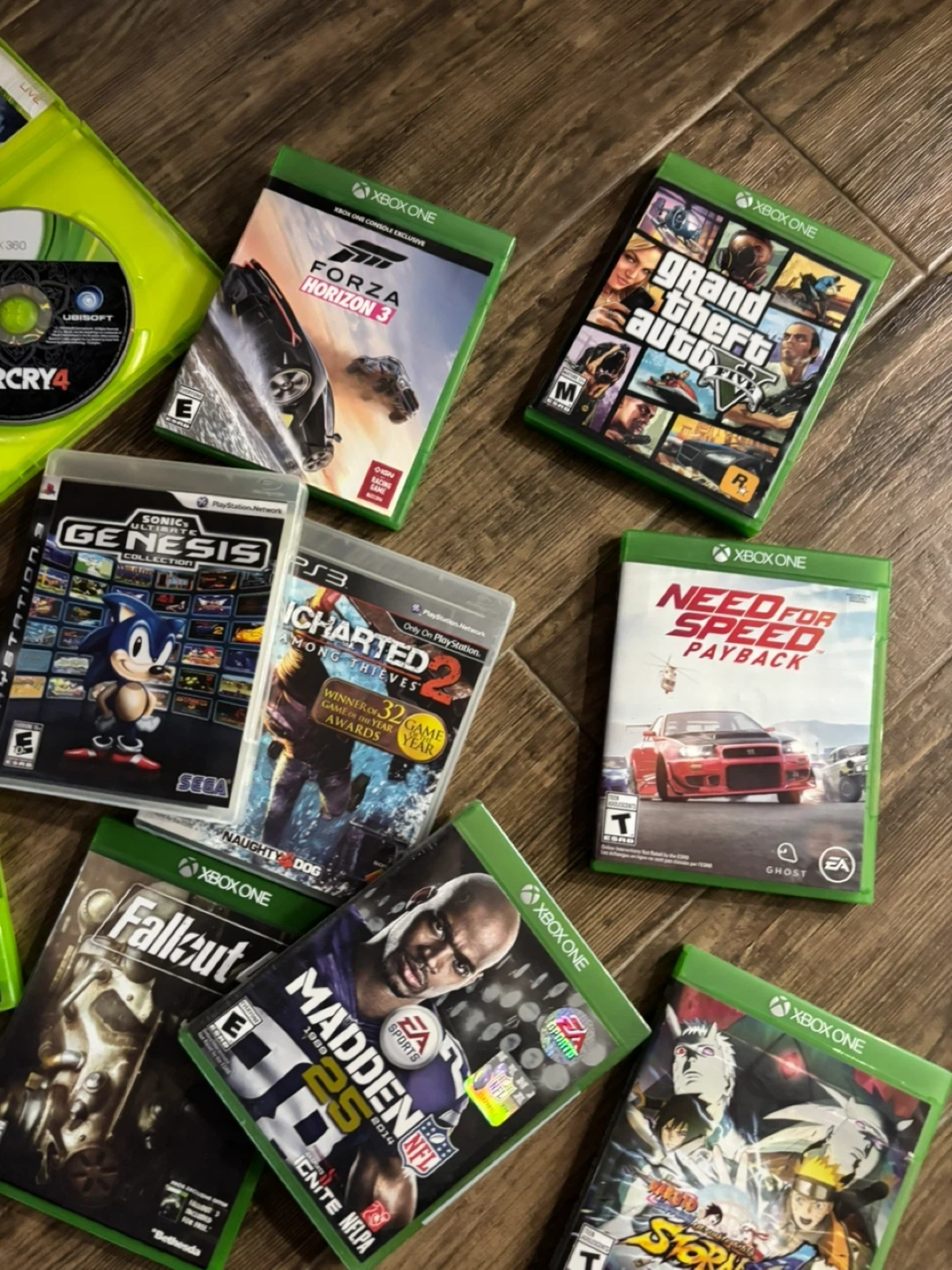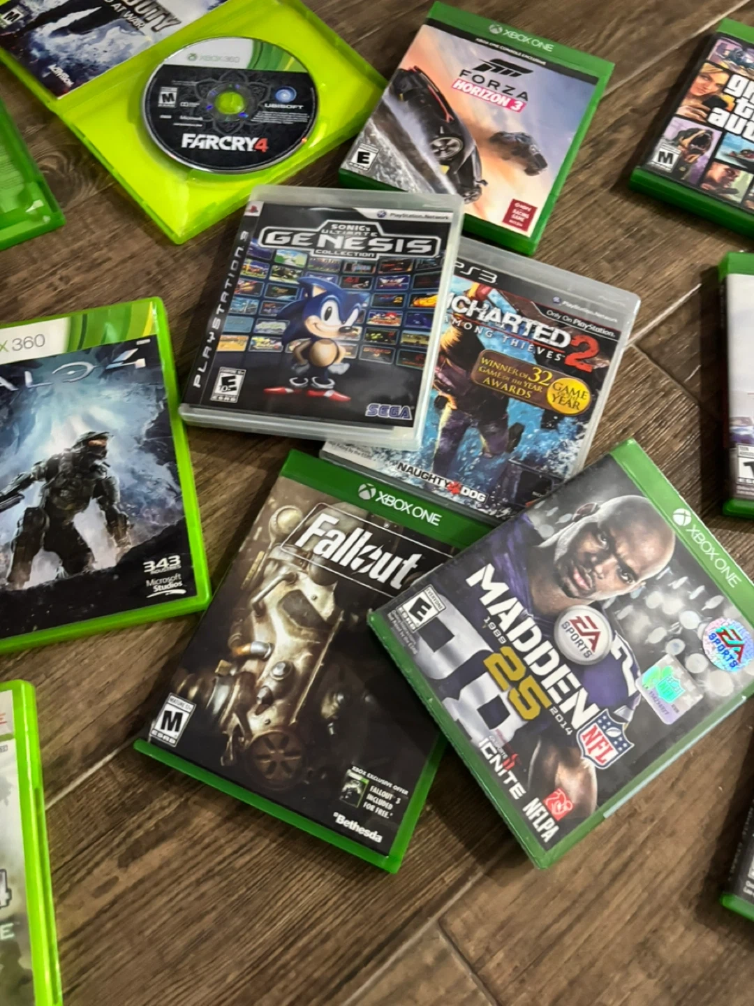 Selling a collection of used video games for Xbox 360, Xbox One, and Playstation 3. Games include titles like Call of Duty, Halo 4, Forza Horizon 3, Grand Theft Auto, Need for Speed, Fallout, Madden 25, Naruto, Sonic Genesis, and Uncharted 2