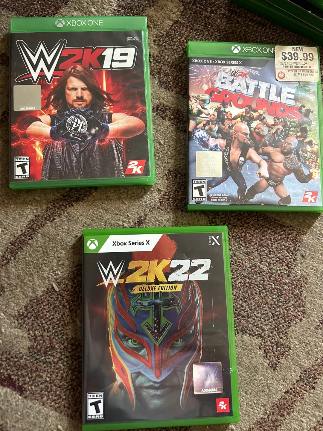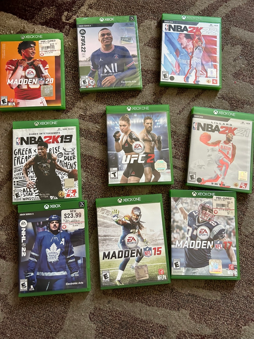 Lot of Xbox One and Xbox Series X games. Sports games $7 each by any 2 get one free from that category Madden 20 FIFA 22 - new Nba2k22 NBA 2k19 UFC 2 NBA 2k21 NHL 22 Madden 15 Madden 17 Wrestling games $12 each buy any 2 get 1 free Wwe 2k19 Wwe battle grounds Wwe 2k22 deluxe edition Action games $12 each buy any 2 get one free Gearsr 5, Destiny The Collection, Mad Max, and Hellblade: Senua's Sacrifice.