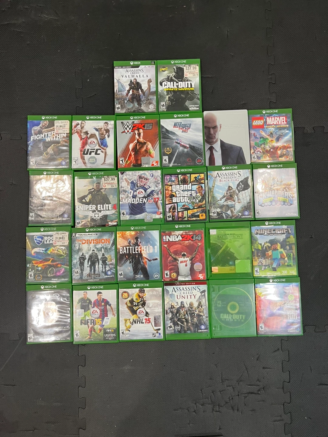 60Selling a collection of Xbox One games! There are a variety of titles including Assassin's Creed Valhalla, Call of Duty Infinite Warfare, UFC, Need for Speed Rivals, Grand Theft Auto V, Madden, NBA 2K14, Minecraft and more