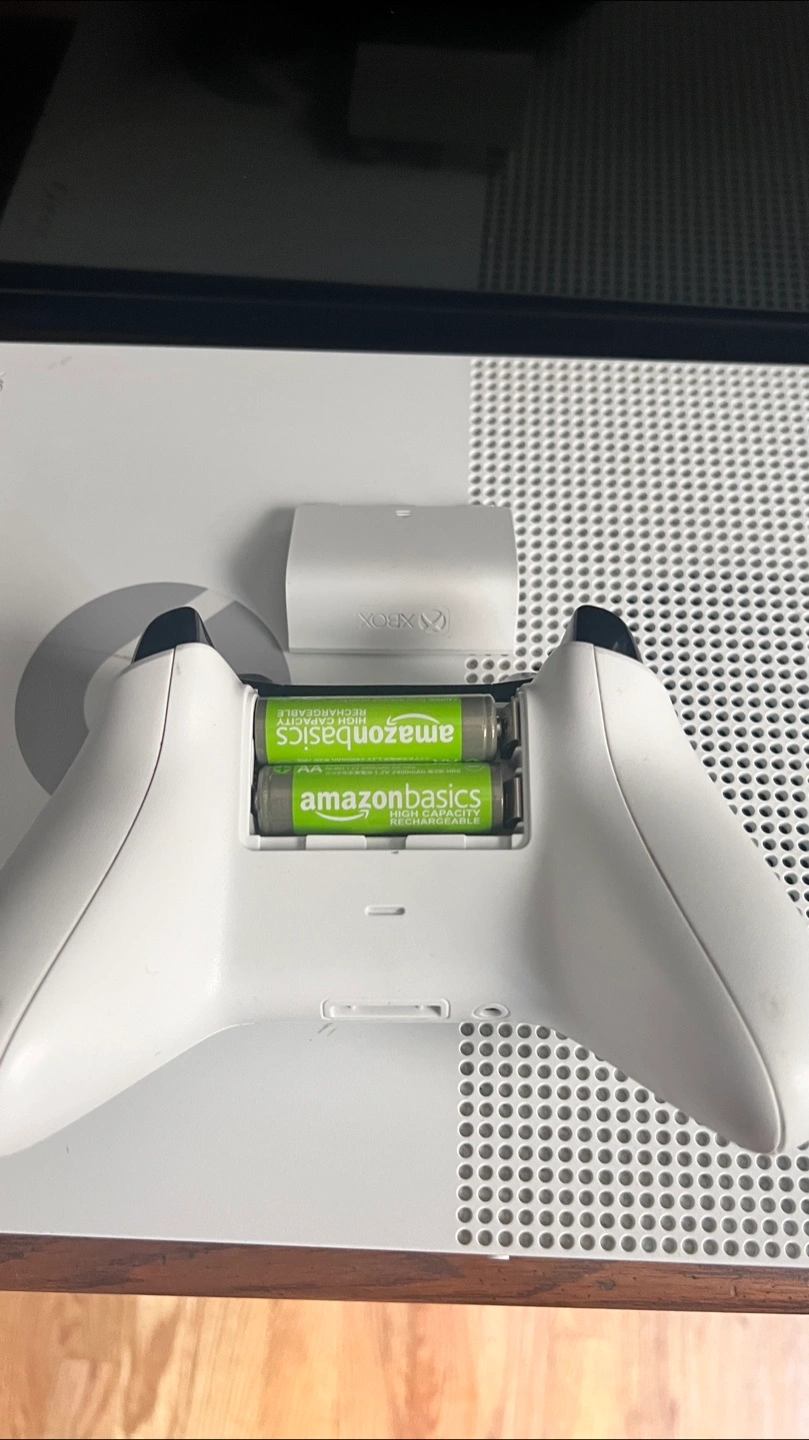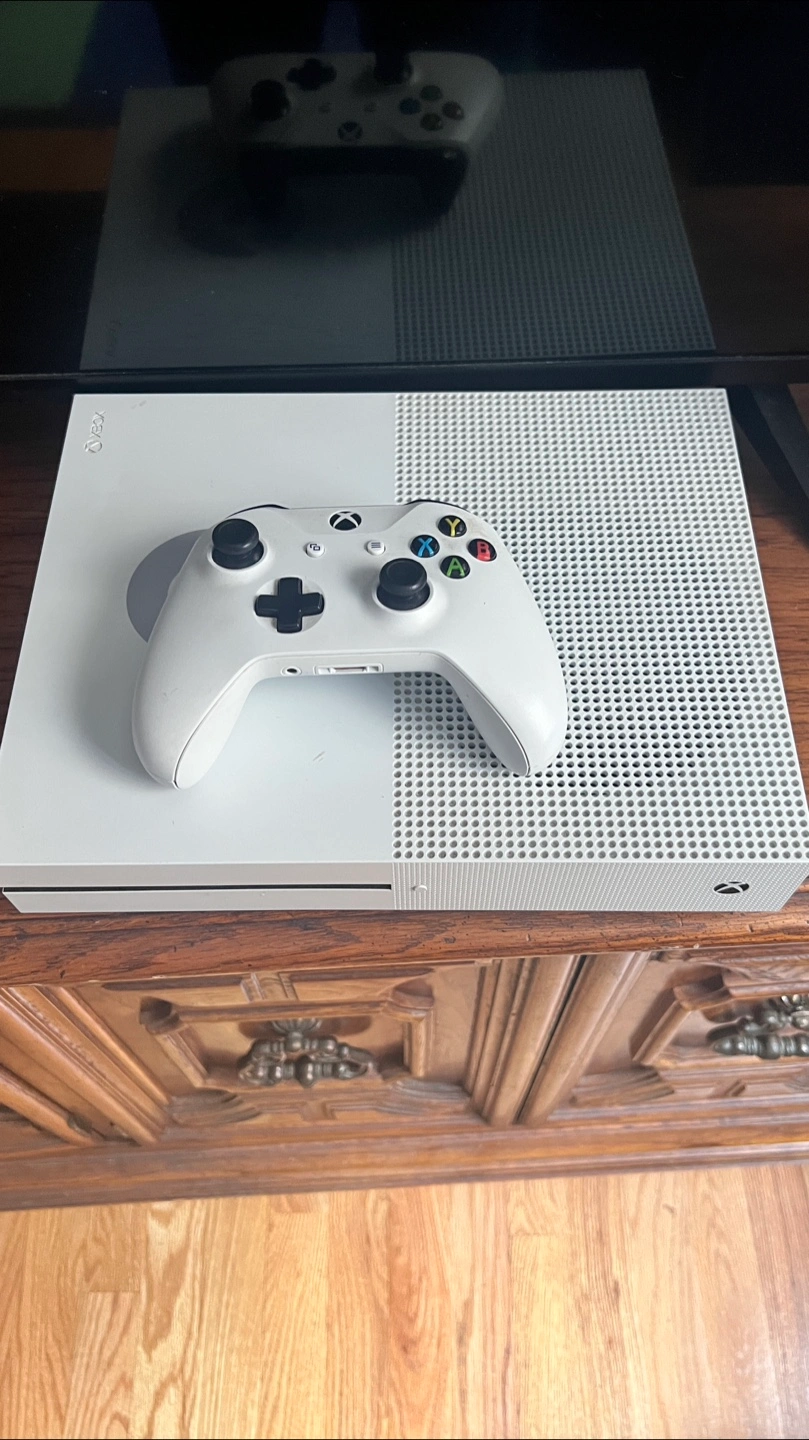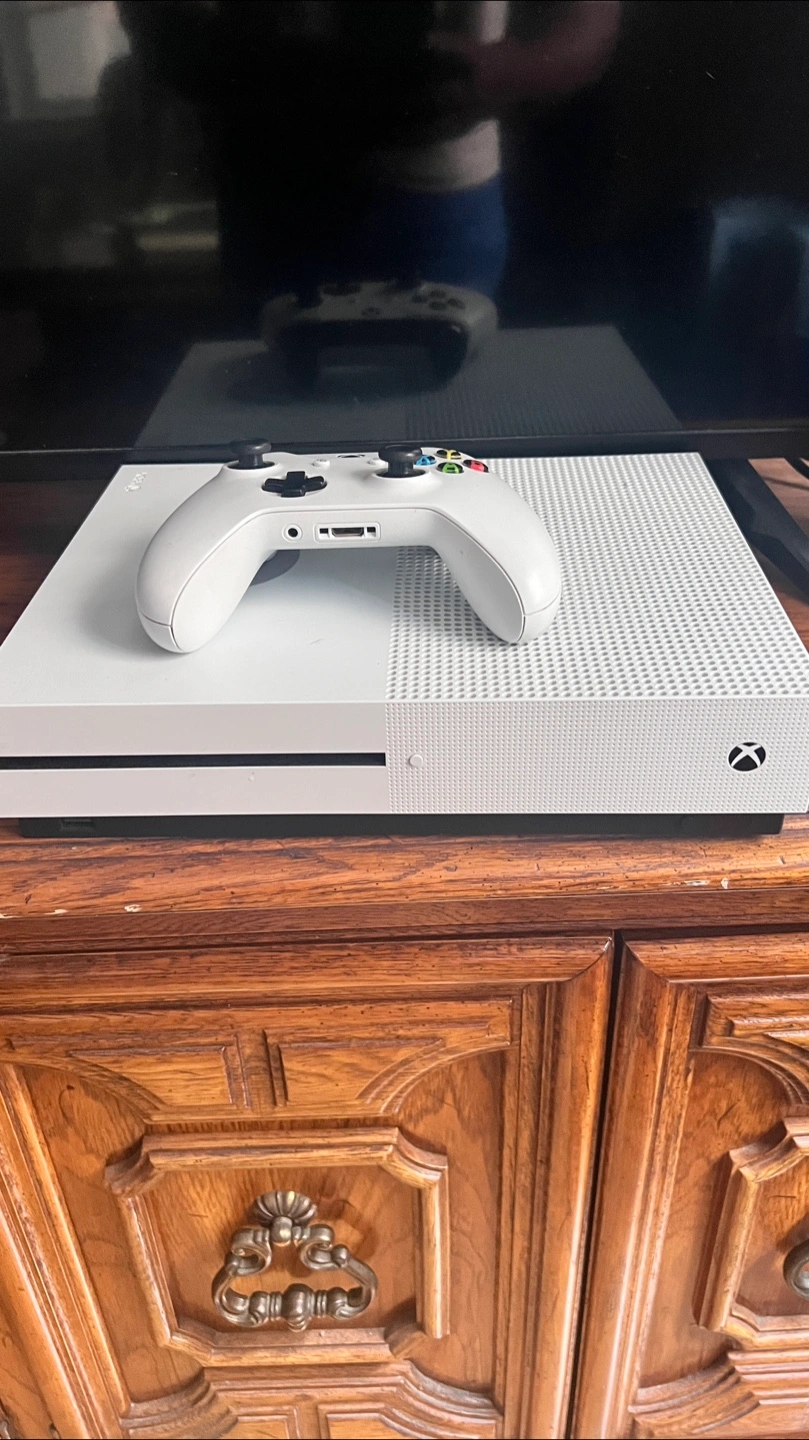 White Xbox One S console. 500 GB storage. Includes one white controller. Used condition. Batteries included.
