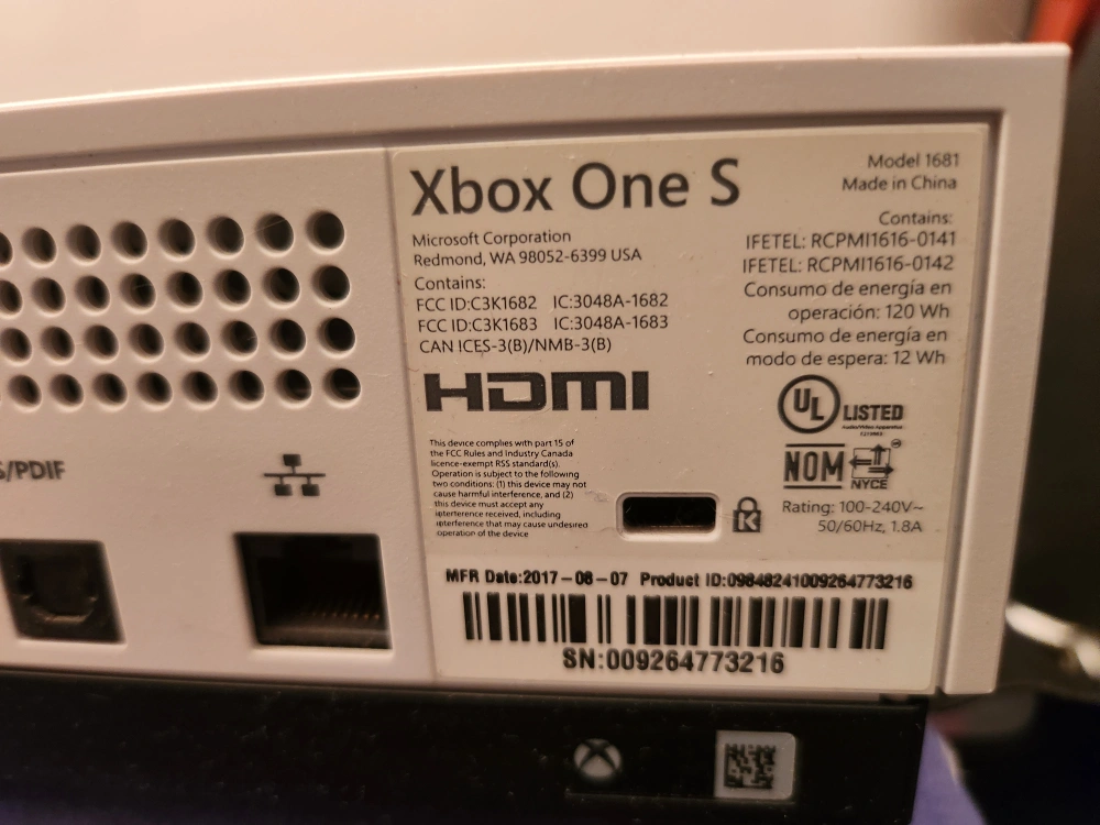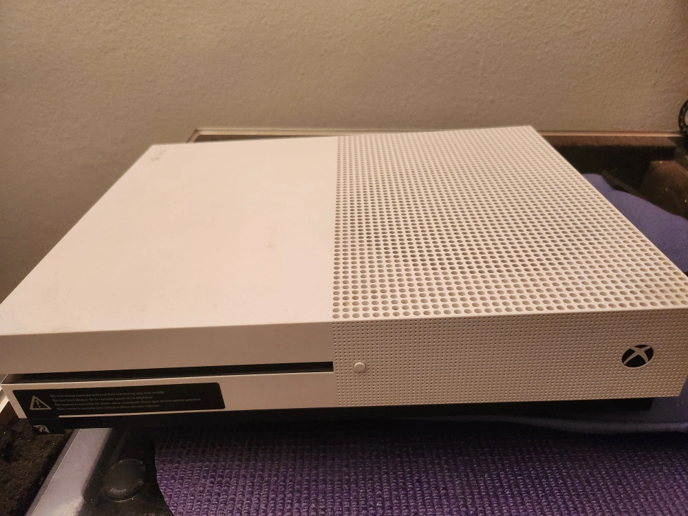 White Xbox One S console. Does not include power cord or HDMI cable. Good condition. Minor cosmetic wear.