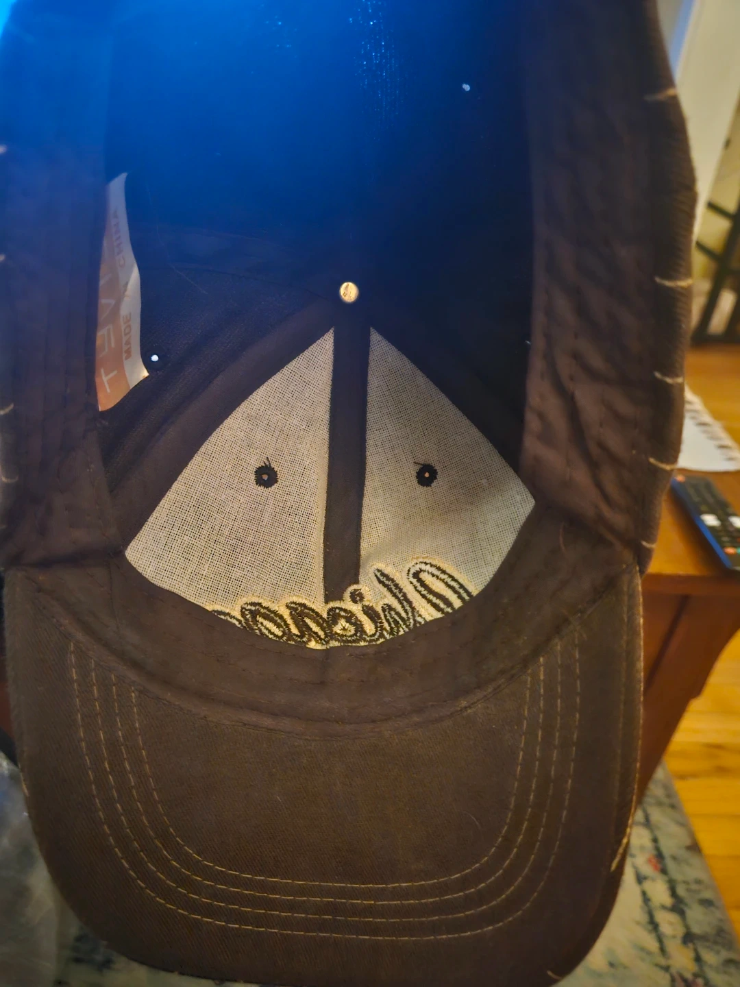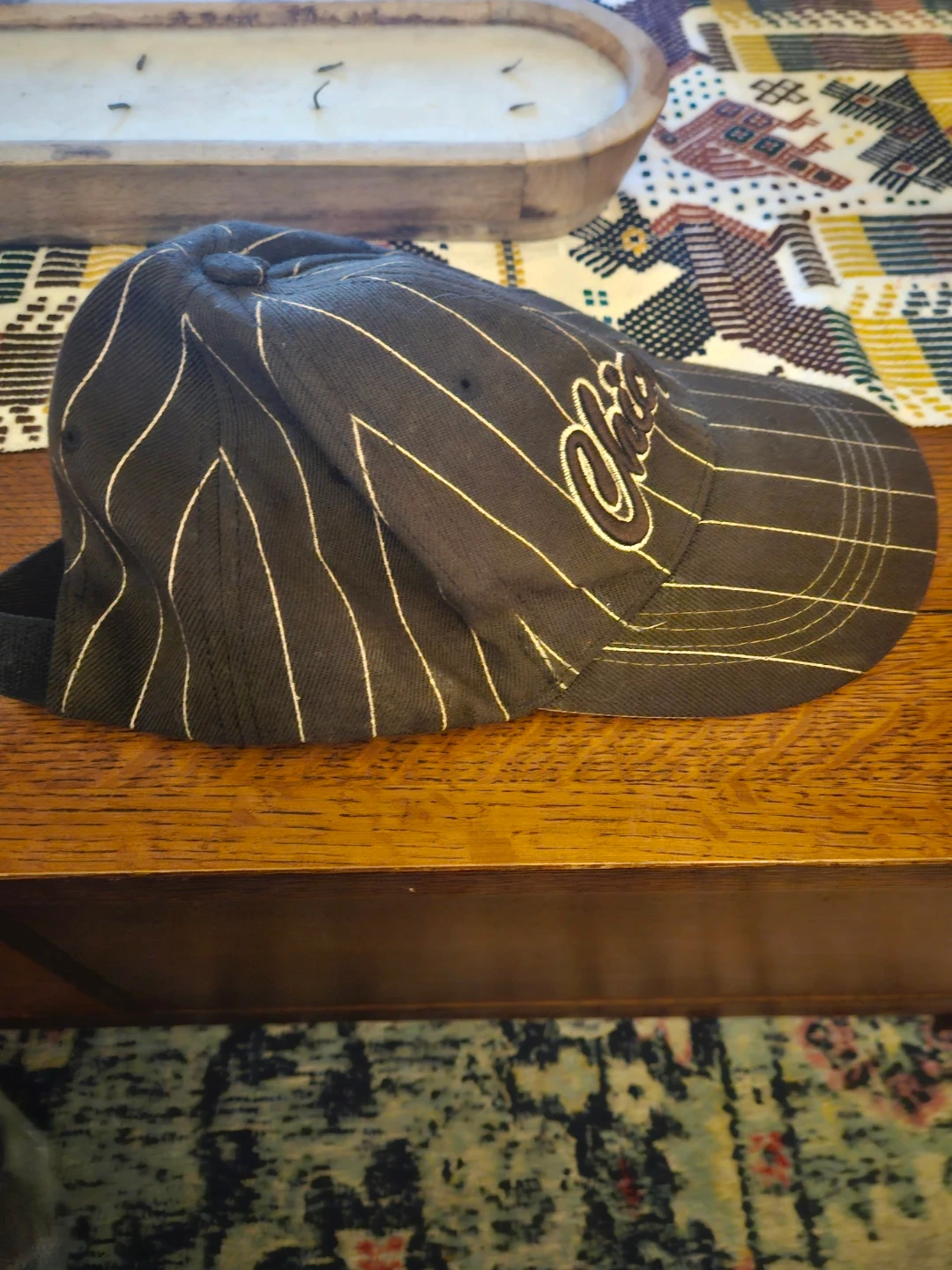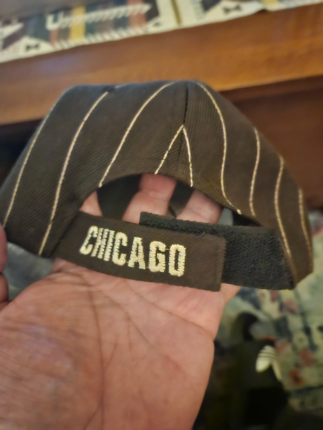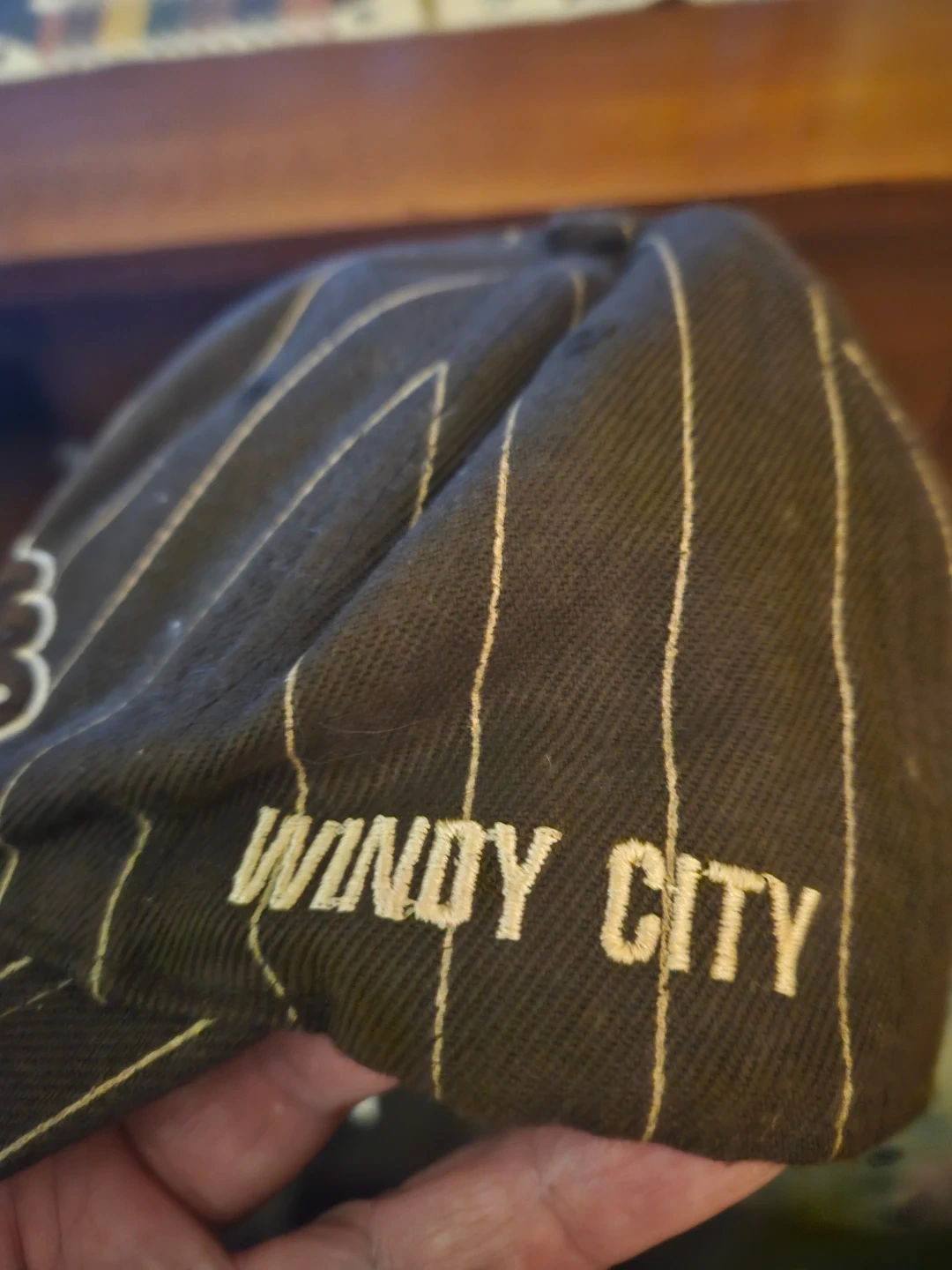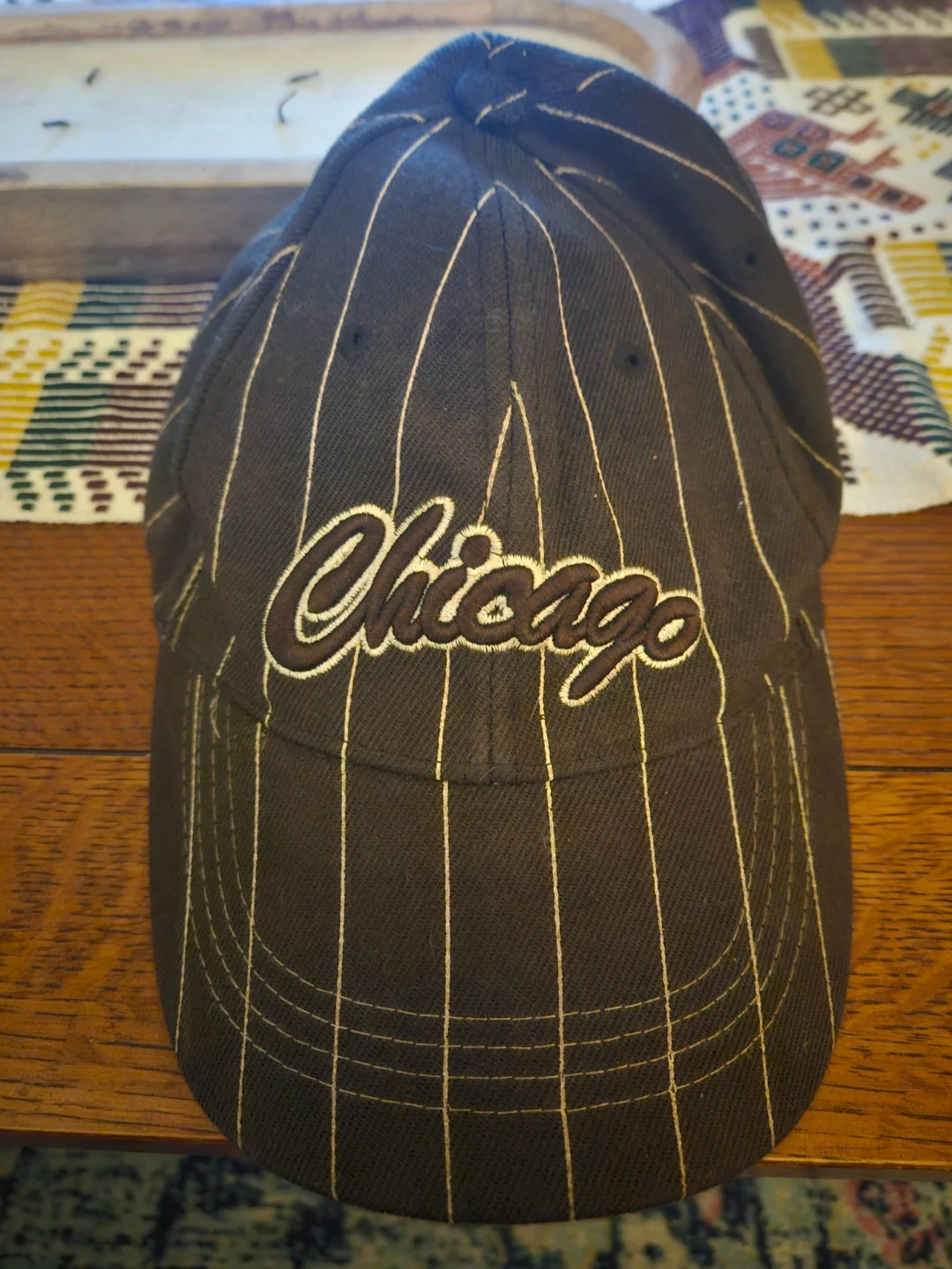 Brown baseball cap with white pinstripes. Features "Chicago" embroidered on the front and "Windy City" on the back strap. Has an adjustable strap closure. Cotton blend material.