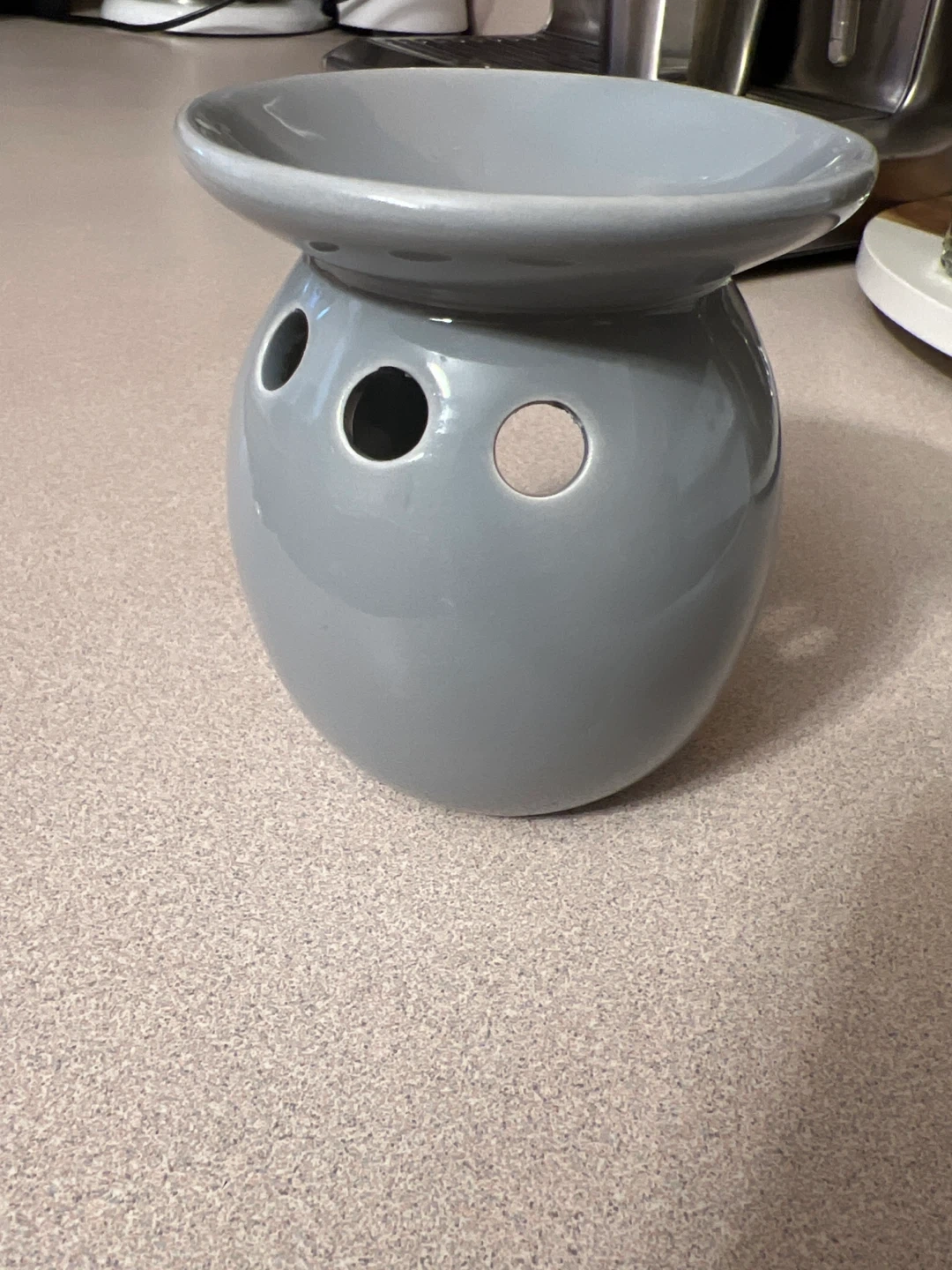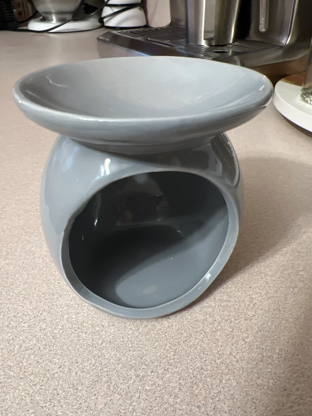This is a gray ceramic oil/wax burner. It's designed to hold essential oils or wax melts for aromatherapy. The open design allows for heat to circulate, diffusing the scent.