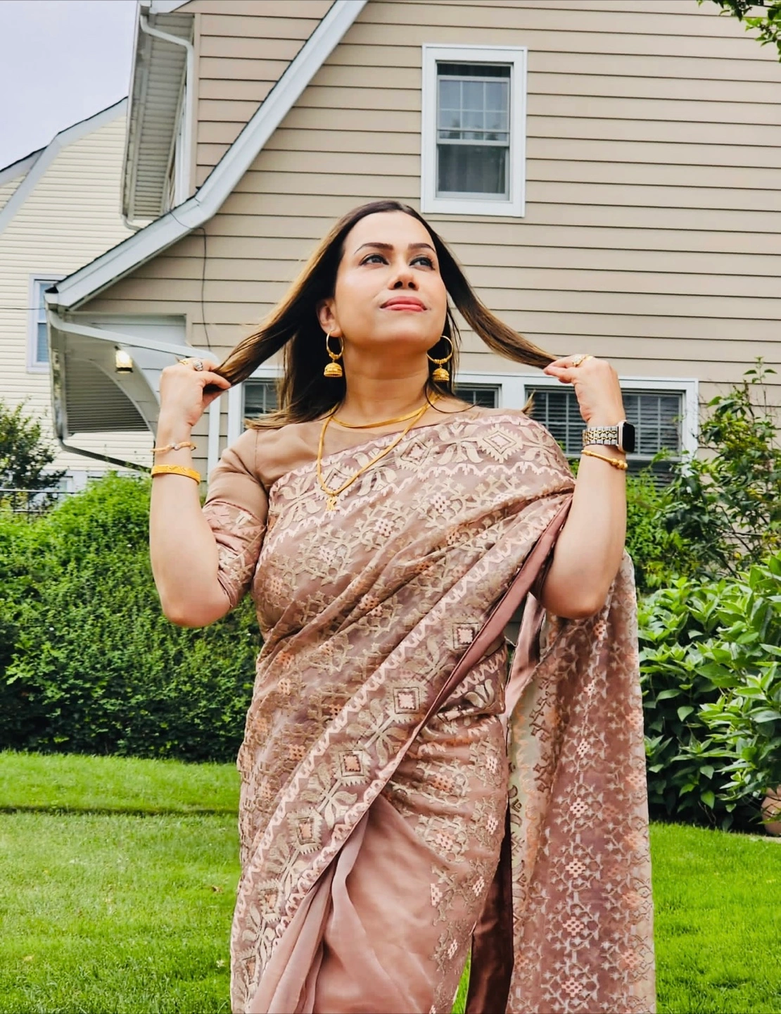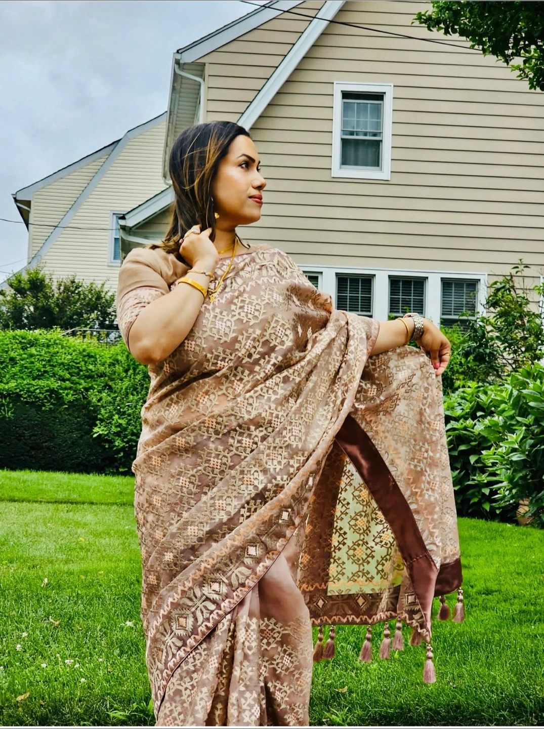 Gorgeous saree. Beige color. Intricate design. Soft silk material. Perfect for special occasions. Elegant and stylish. Slight sheen. Blouse made, you can resize.