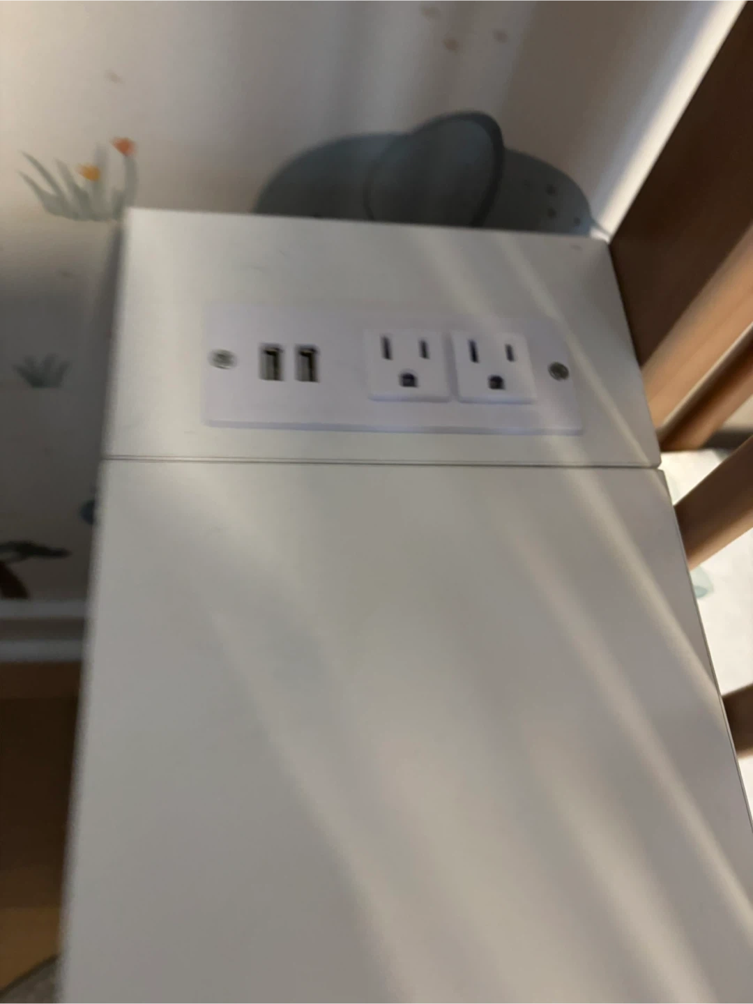 This white bedside table features integrated power outlets and USB ports for convenient charging. It has a shelf below for storage. Perfect for keeping devices powered up next to your bed!