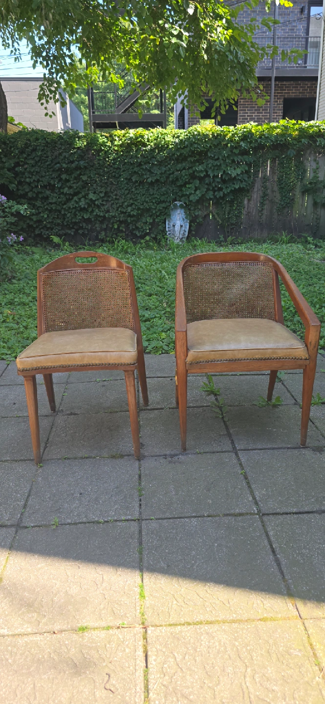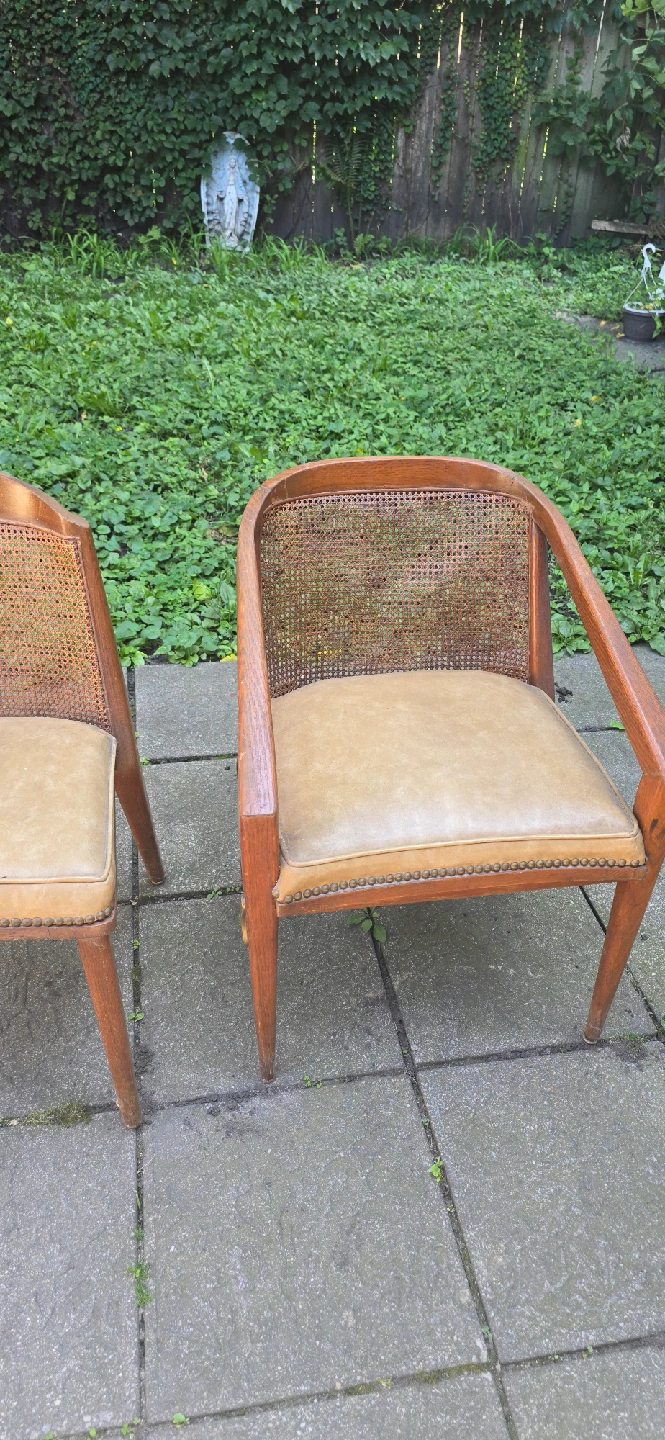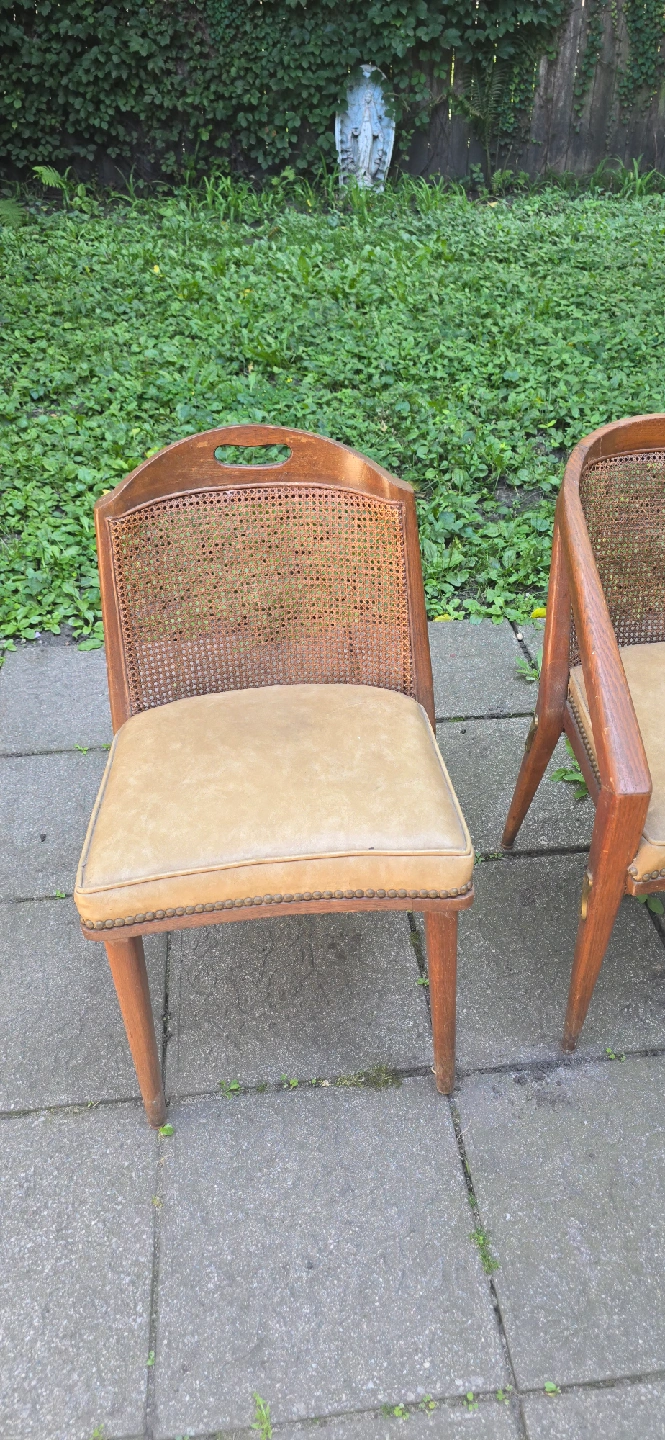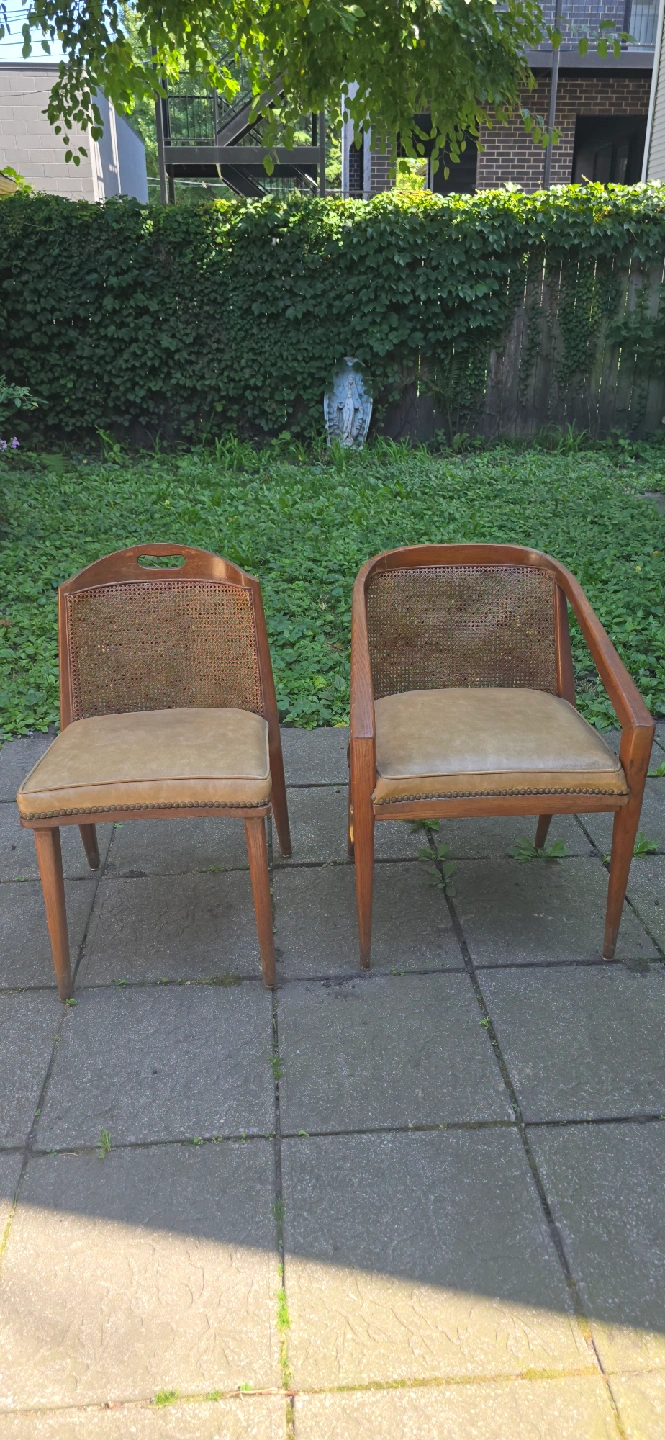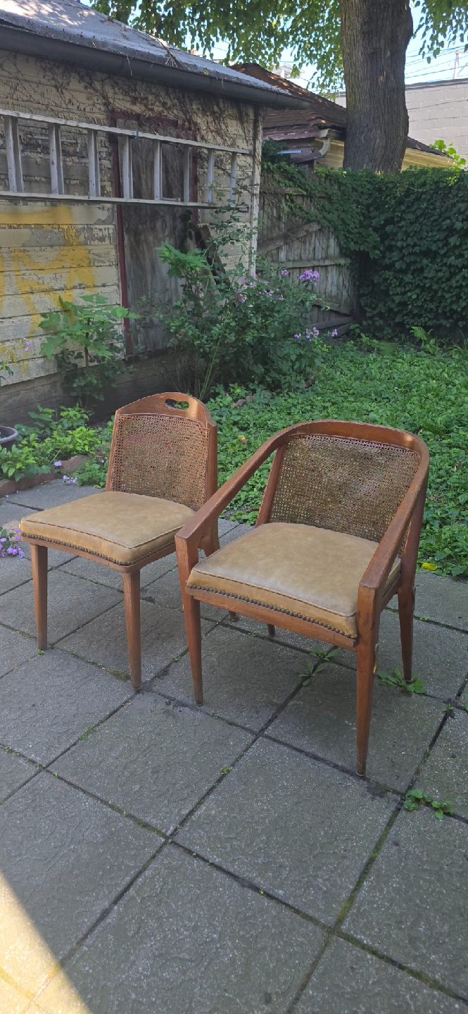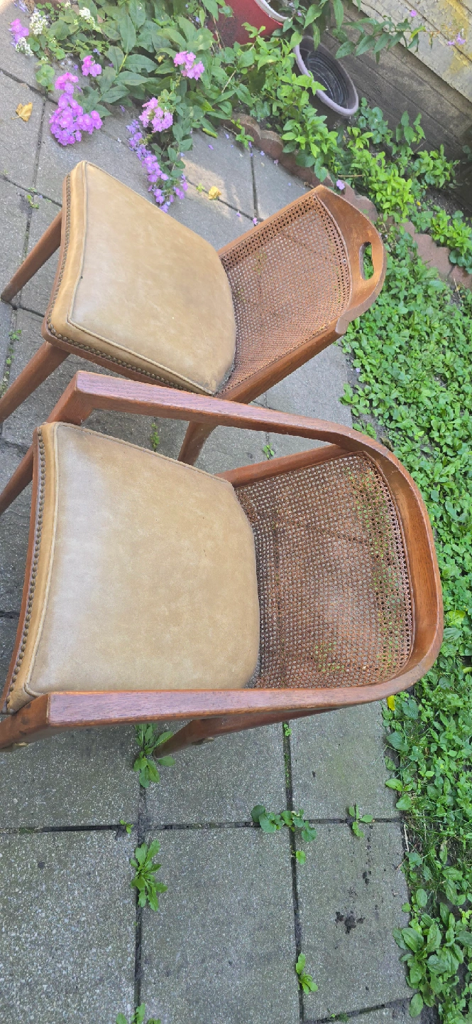 Selling a set of two vintage wooden chairs! They have a unique woven back and a cushioned seat. Perfect for adding a touch of retro charm to your home