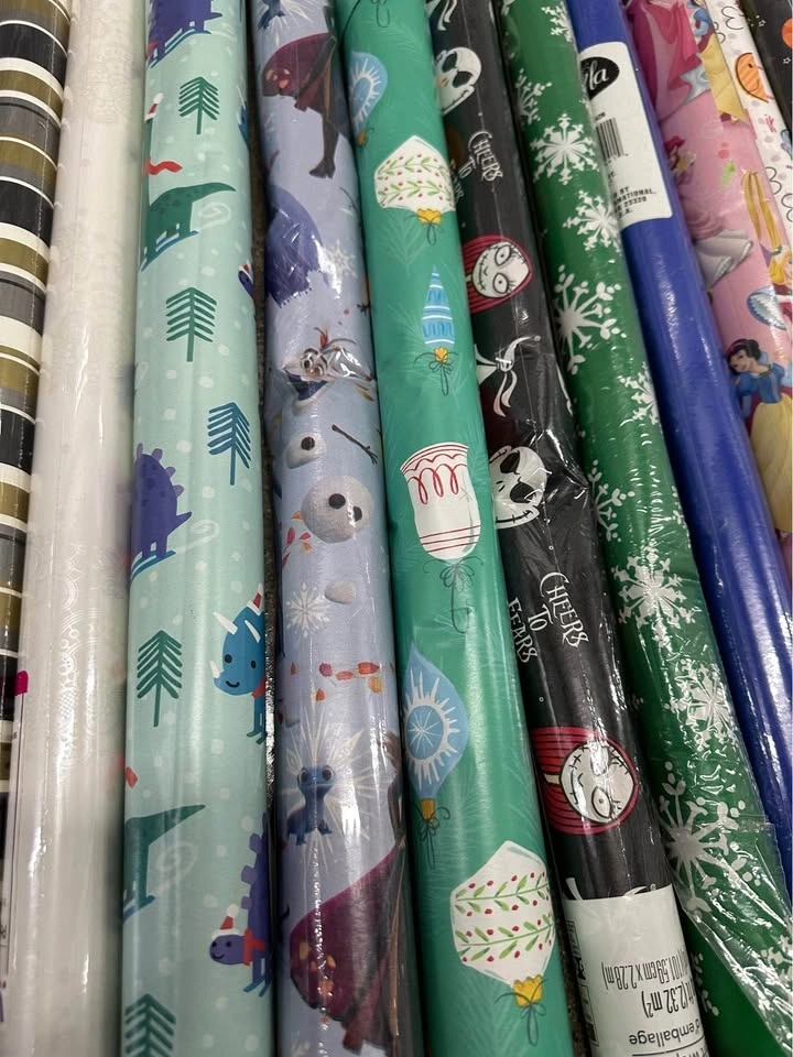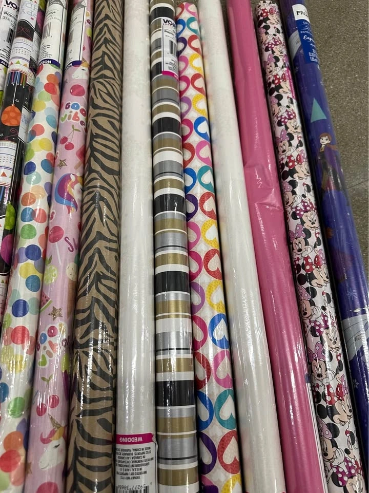 Large assorted lot of gift wrap rolls in a variety of prints and colors. Most rolls are still sealed, and a few have some light dents or wrinkles from storage, but overall this is a great set in very good condition. Perfect for birthdays, holidays, crafts or everyday gift wrapping. Sold as a full lot only. Please see photos for styles and condition. Pickup in Buffalo Grove.