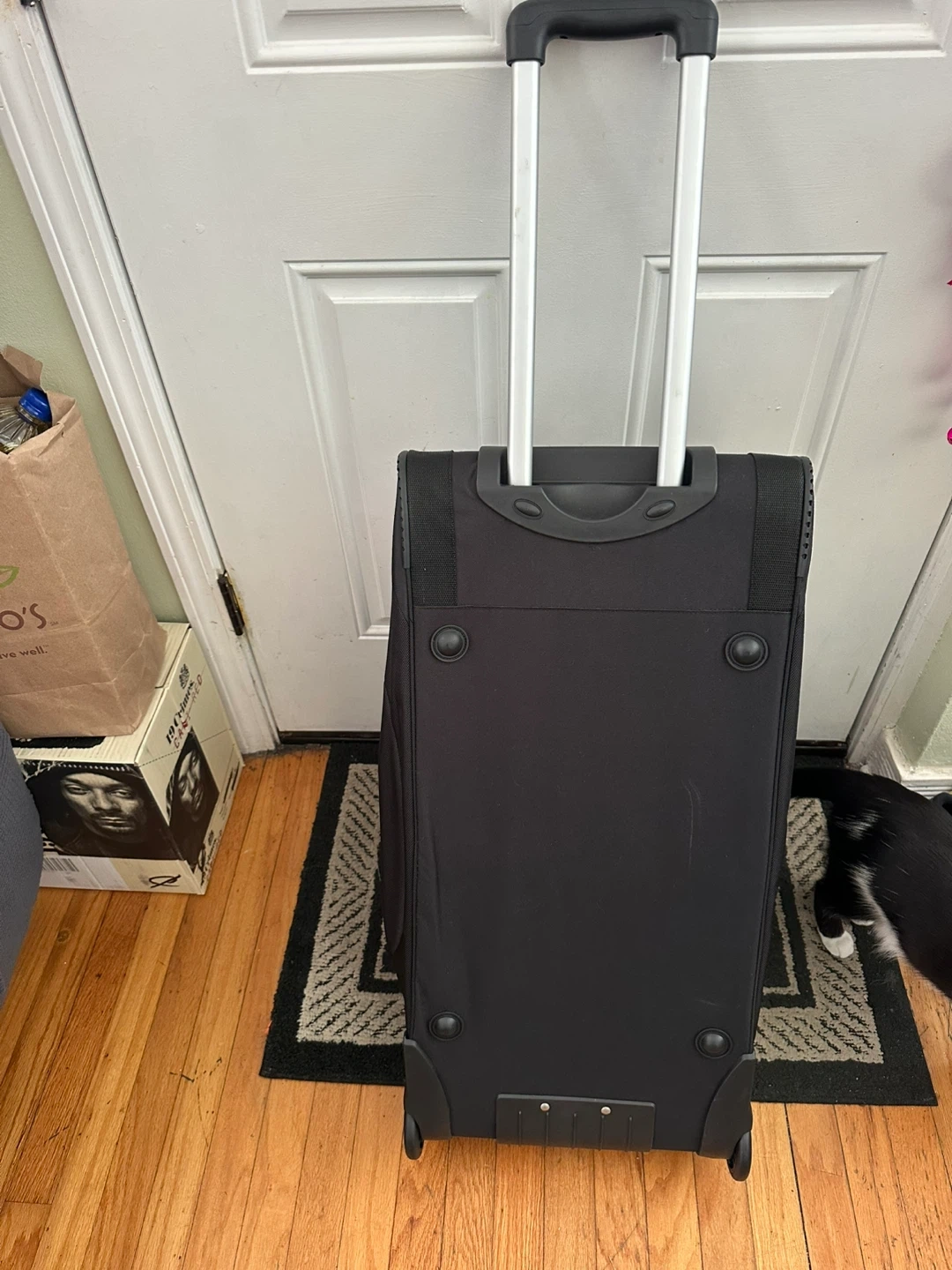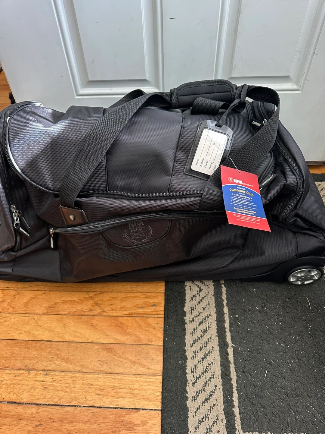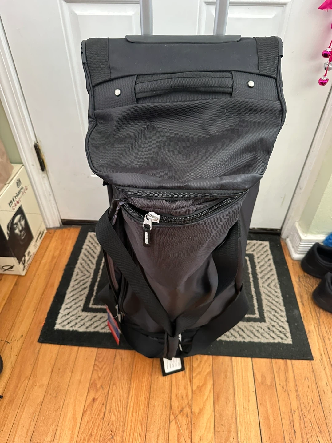 This is a black rolling duffle bag with wheels and a telescoping handle. It features multiple zippered compartments for organization. It's made of durable fabric.