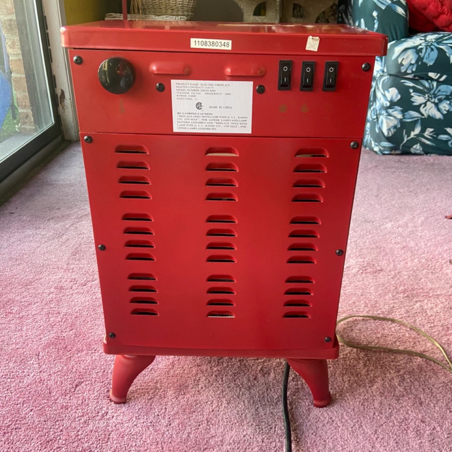 This is a red electric fireplace heater with a model number DRLB5-M36. It's 1500W and runs on 60Hz. It has an adjustable thermostat and three heat settings. The unit is made in China. It includes a power cord.