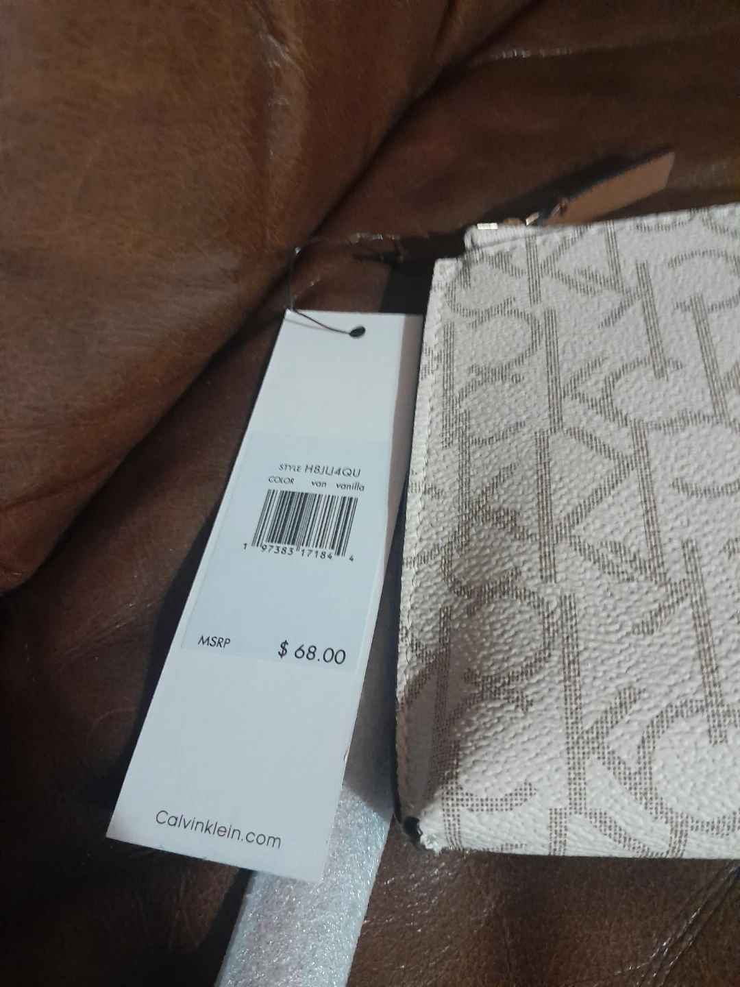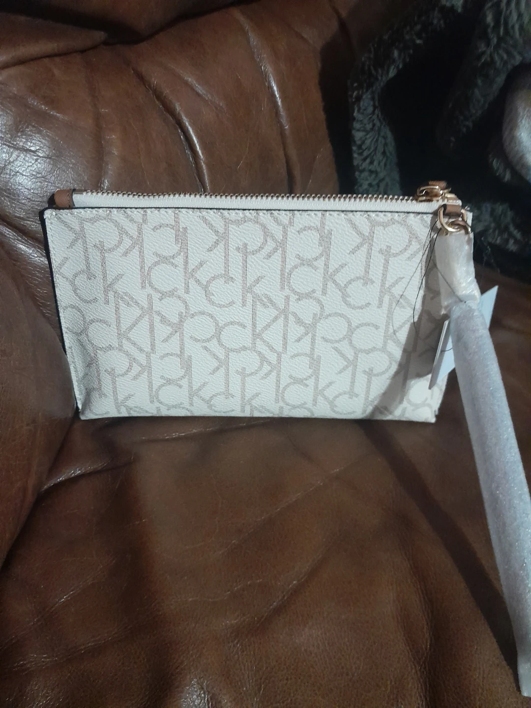 This Calvin Klein wristlet pouch features a repeating logo print. It's a convenient size for essentials. Interior has slip pockets. Brand Brand new with tags.
